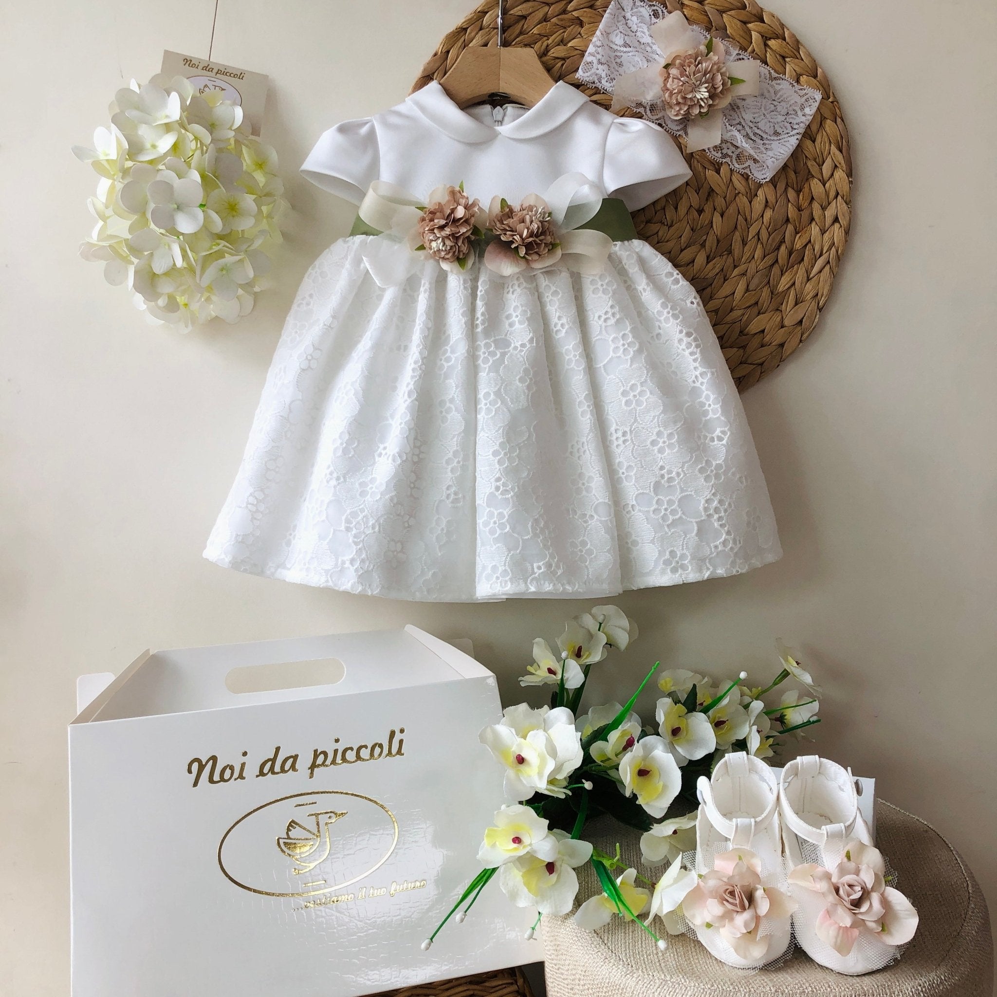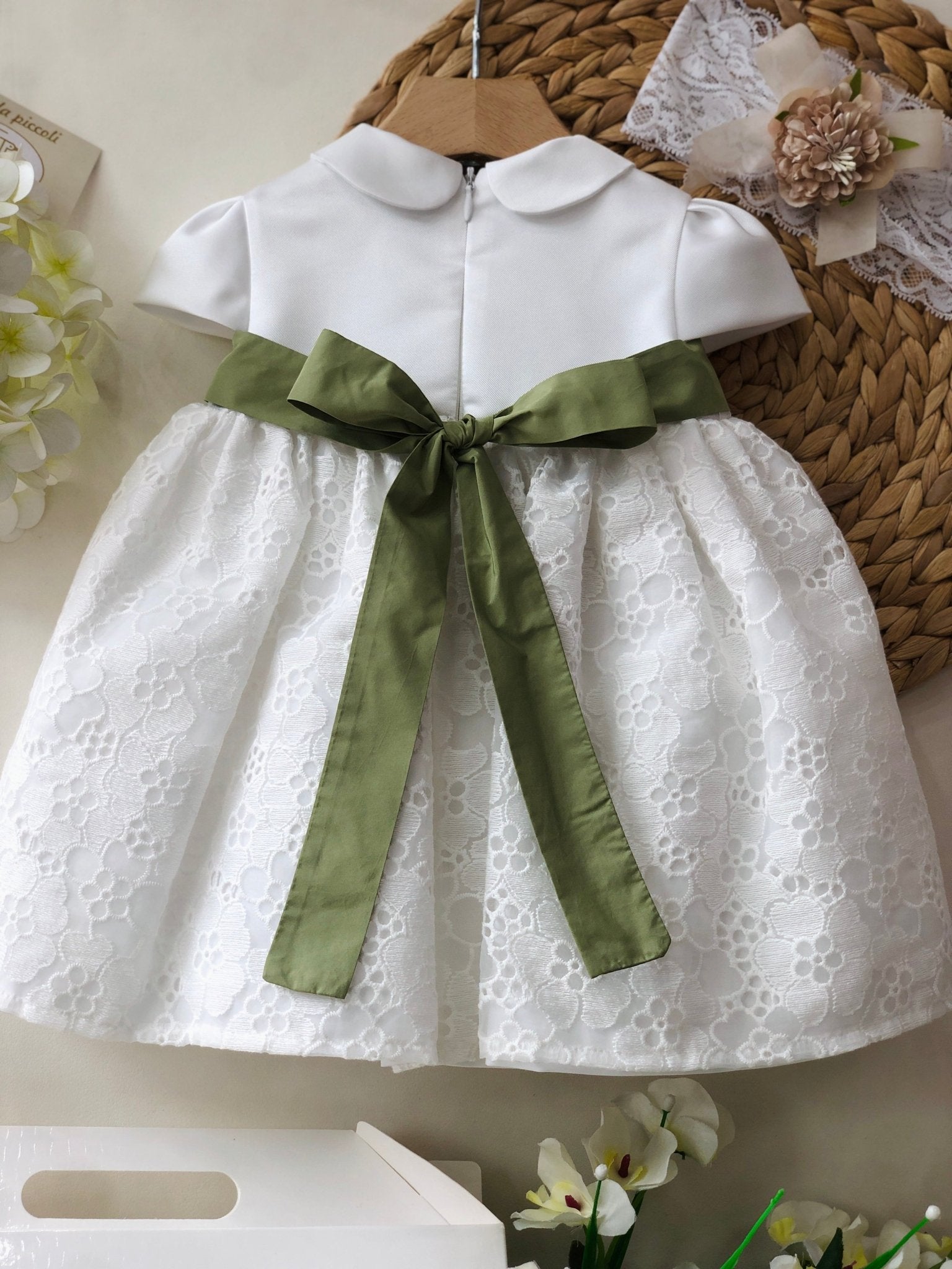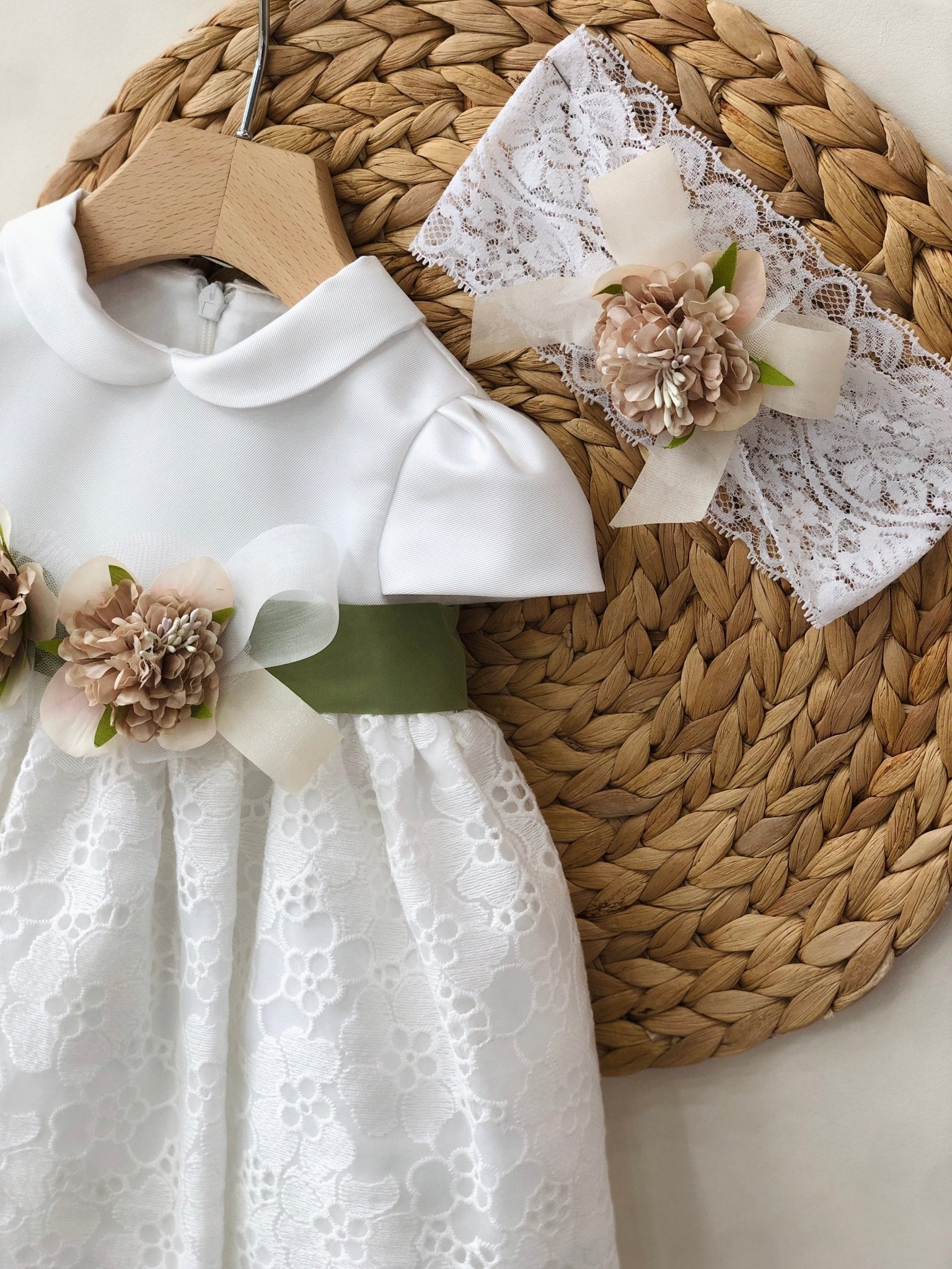 A delicate dress that celebrates your little one's beauty. Crafted in an elegant lace pattern, the dress features a sweet white hue, perfect for special occasions. The contrasting collar and soft sleeves add a touch of sophistication, while the matching ribbon gently rests at the waist, embellished with fabric flowers that add a romantic accent. Every detail is taken care of, to make your little girl feel like a true princess in every unforgettable moment.