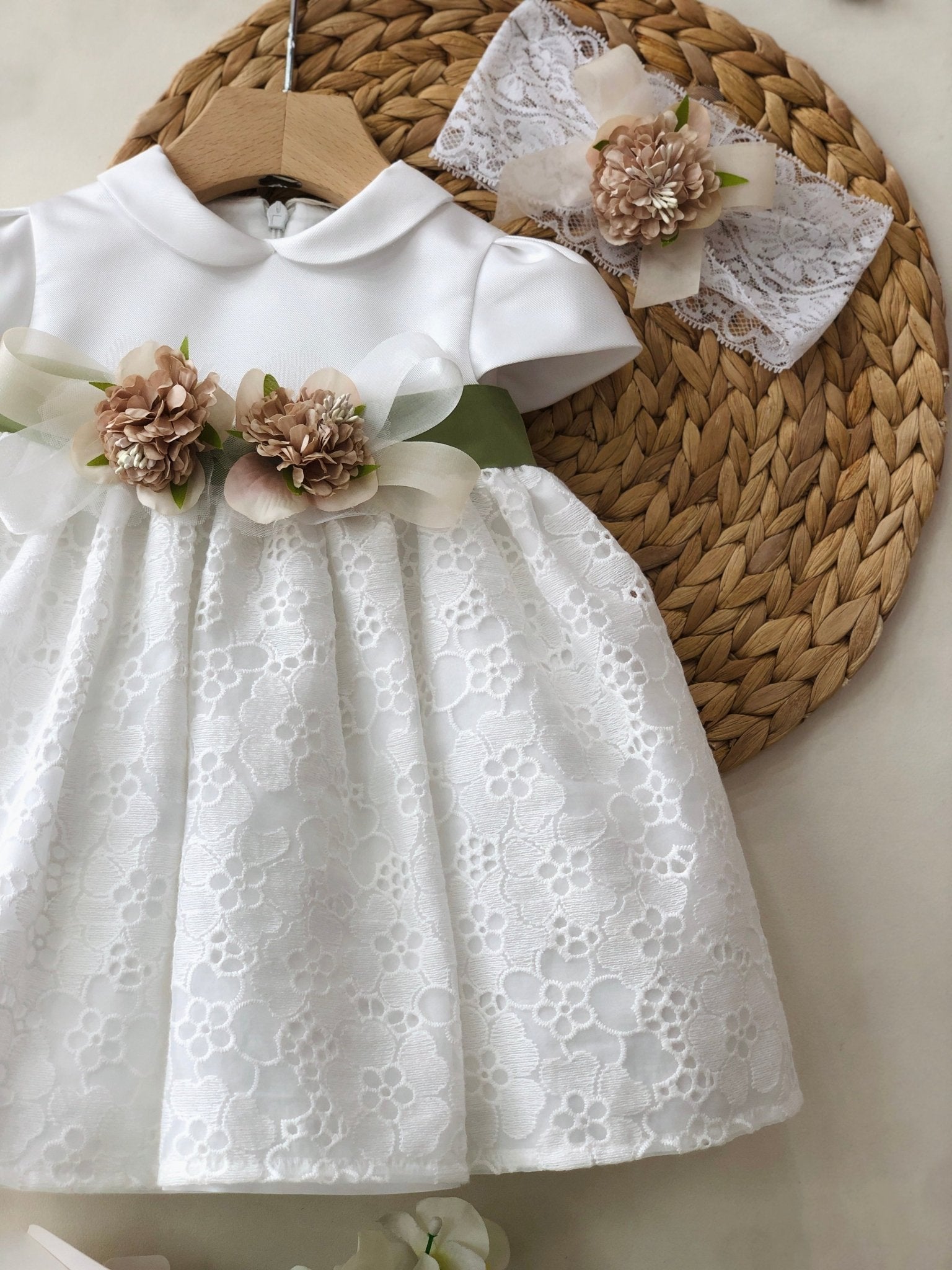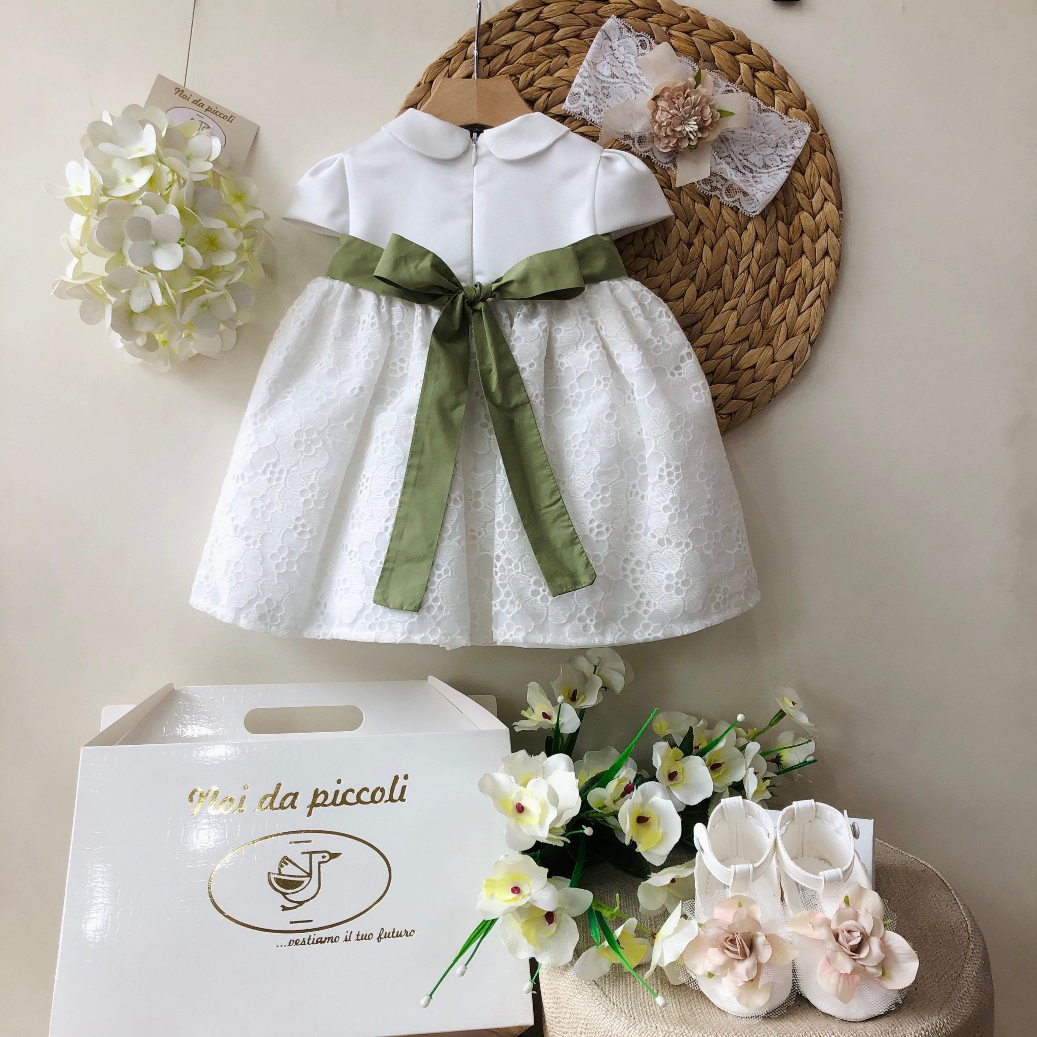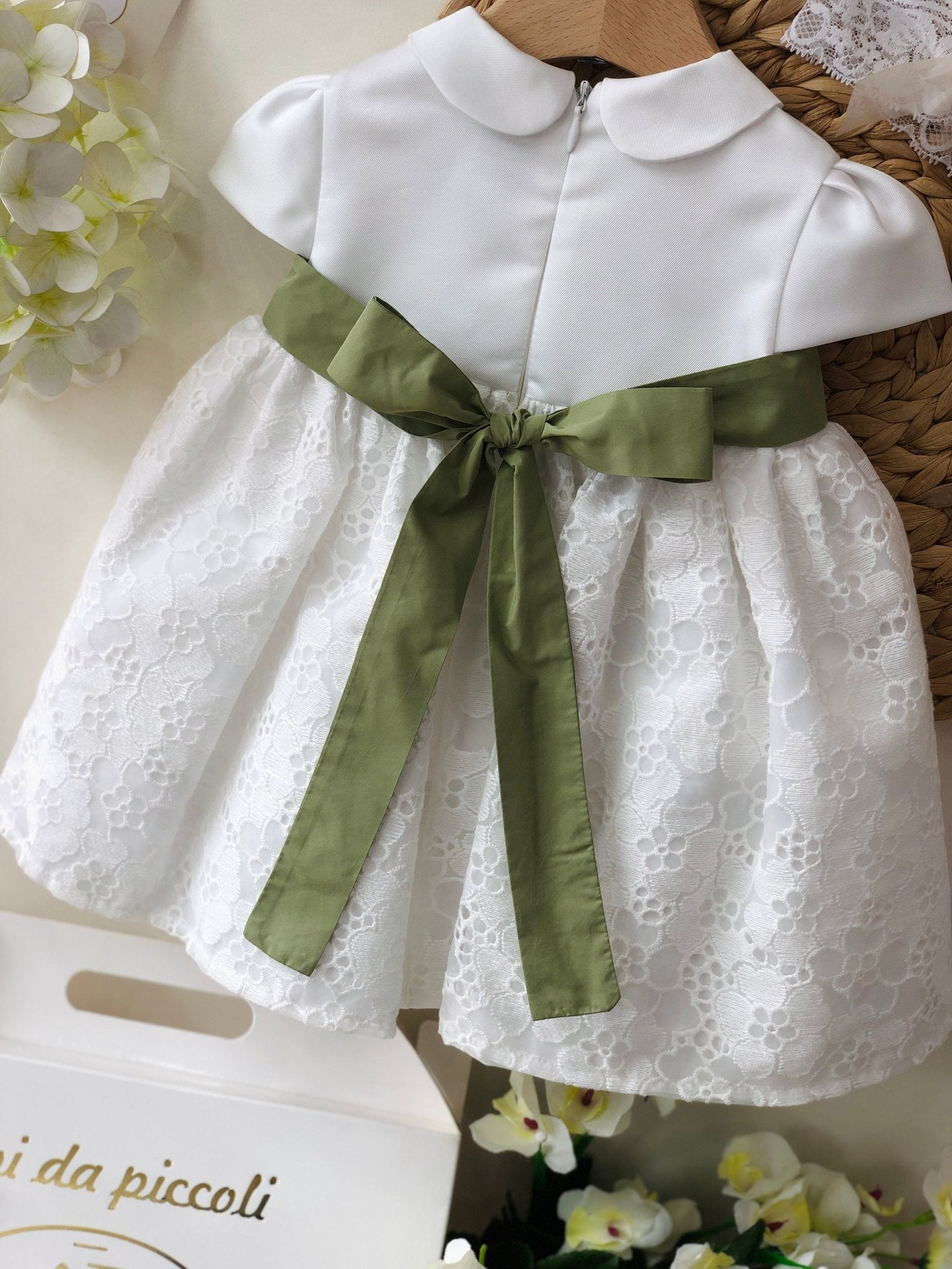A delicate dress that celebrates your little one's beauty. Crafted in an elegant lace pattern, the dress features a sweet white hue, perfect for special occasions. The contrasting collar and soft sleeves add a touch of sophistication, while the matching ribbon gently rests at the waist, embellished with fabric flowers that add a romantic accent. Every detail is taken care of, to make your little girl feel like a true princess in every unforgettable moment.