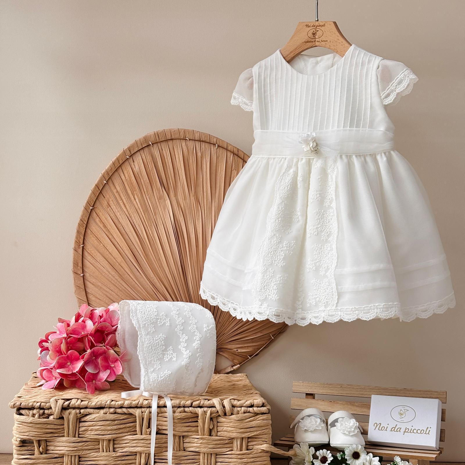 This white ceremonial dress enchants with its delicacy and refinement. The upper part, characterized by an elegant pleated pattern, joins a flowing skirt that dances with every movement. The delicate lace inserts and subtle embroidery add a touch of magic, while the small details such as the bow at the waist give an additional note of sweetness. An ideal garment to make your little one feel like a real princess on every special occasion.