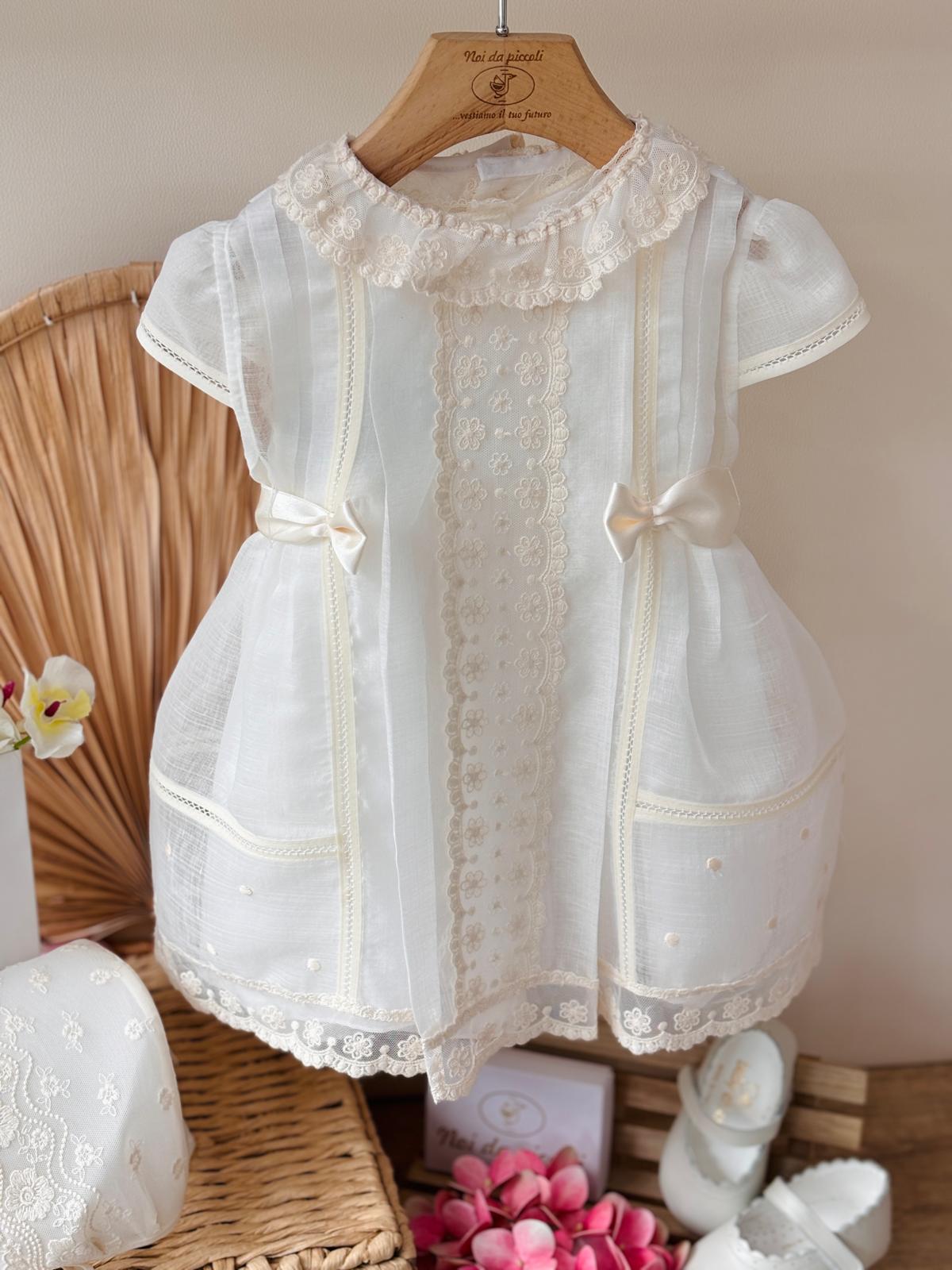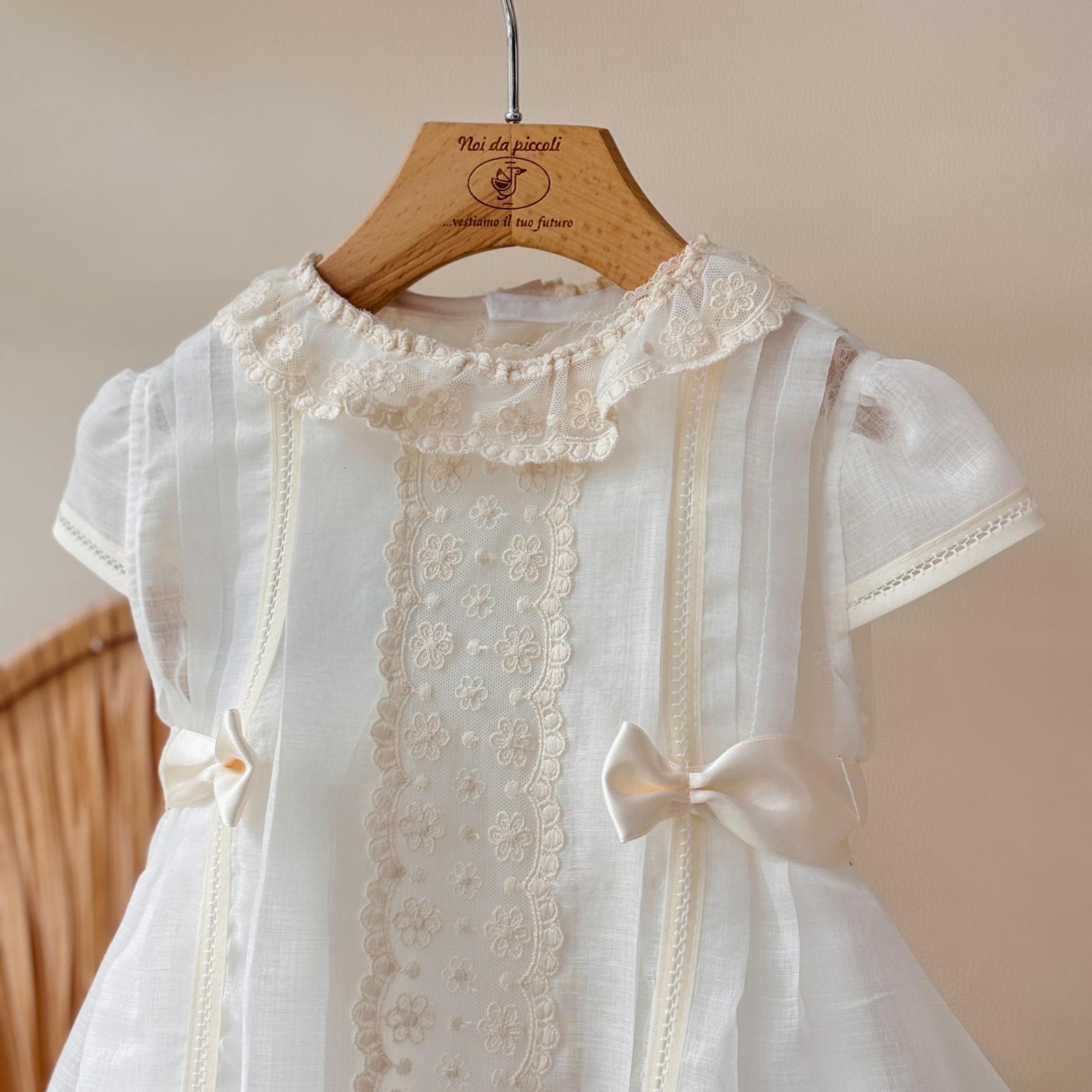 A delicate embrace of elegance envelops this enchanting ivory ceremonial dress. The sweetness of the details, such as the refined floral embroidery and soft lace, add a touch of magic. The delicate bows on the sides give an innocent grace, while the light and airy texture provides comfort during the celebrations. Perfect for making every little one feel like the protagonist on a special day, this dress is a true dream of style.