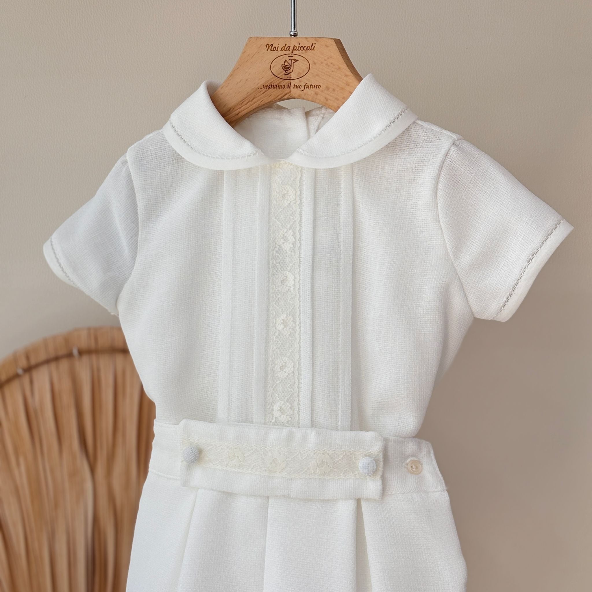 A delicate ceremonial dress in soft milk, perfect for the most special moments. The fabric has a pleasant texture, while the elegant collar and refined stitching give a touch of class. The lace details add a romantic charm, while the belt emphasizes the silhouette with sweetness. Complete the look with an elegant hat, making this outfit ideal for any ceremony. Choose this dress to give your little one an unforgettable moment.