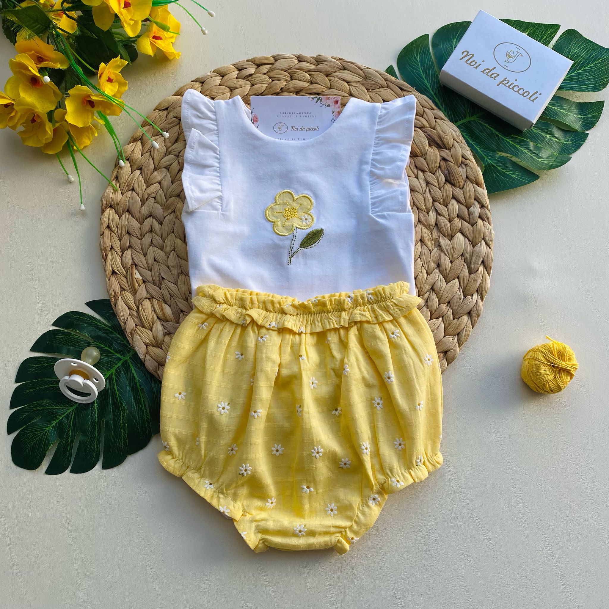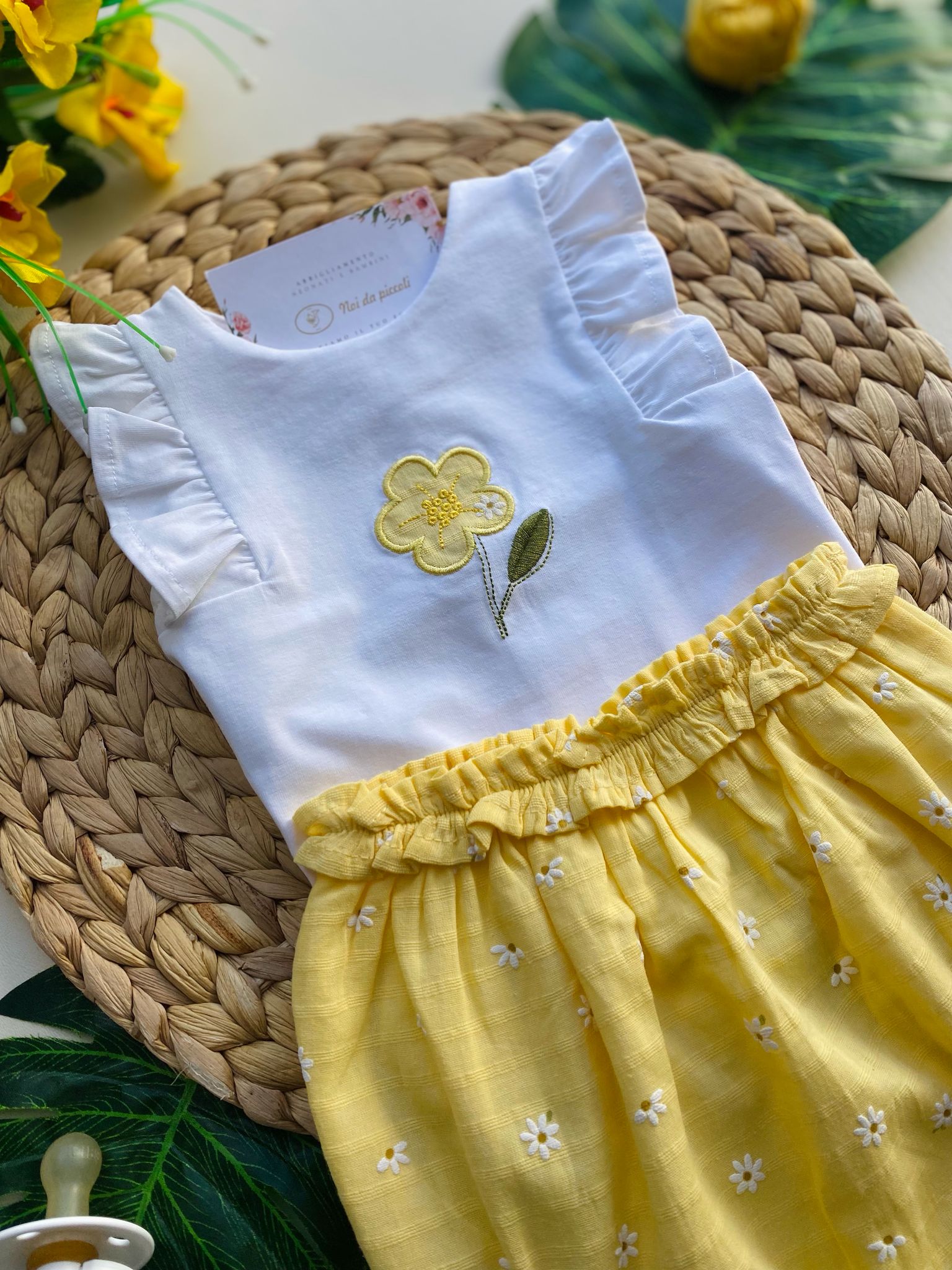 A delightful combination of sweetness and freshness, this piece enchants with its white T-shirt, embellished with a delicate yellow flower embroidered in the center. The yellow culottes, light and soft, are adorned with small floral patterns that dance on them, evoking the joy of spring. The carefully finished seams and the delicate ruffles on the shoulders add a touch of elegance and tenderness, perfect for any occasion. A must-have for little dreamers!