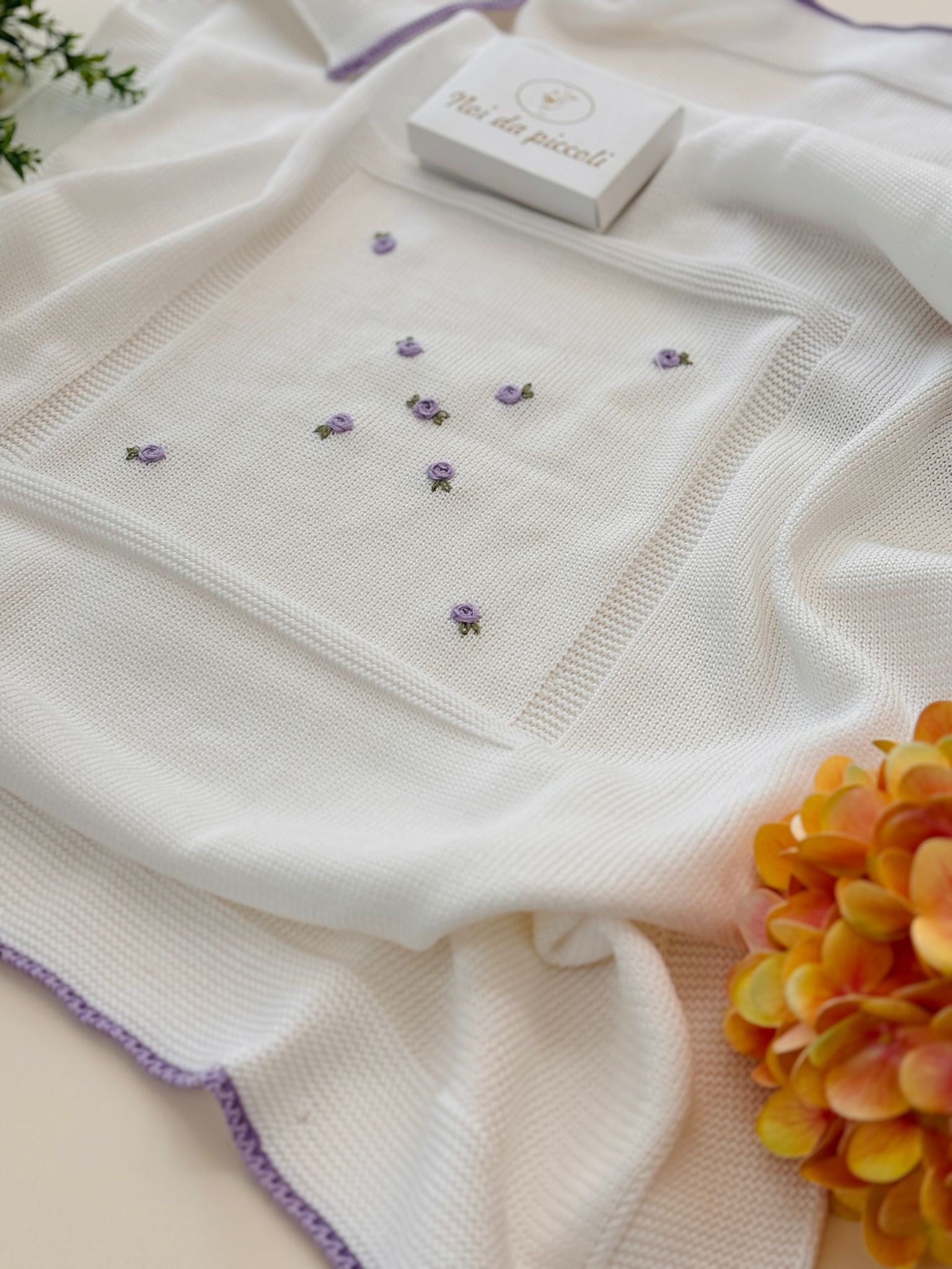 Cotton thread blanket, with delicate little roses embroidered with lilac