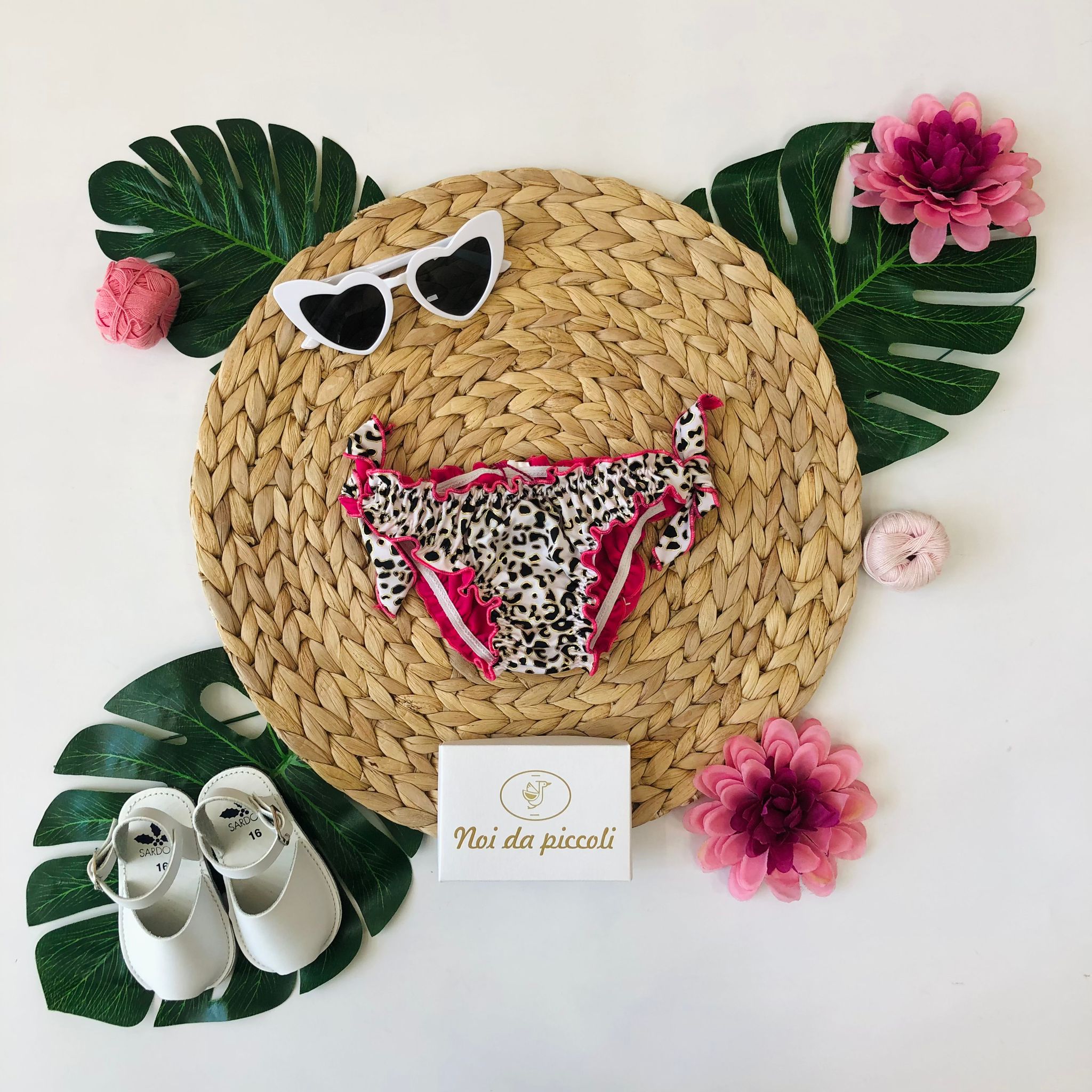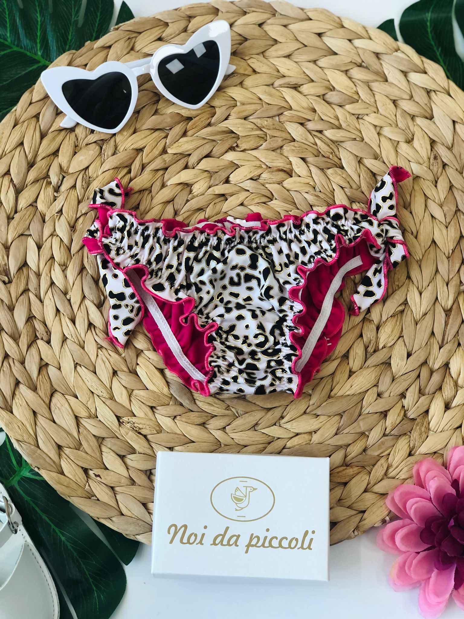 Animal print swimsuit with fuchsia border for a beautiful young lady.