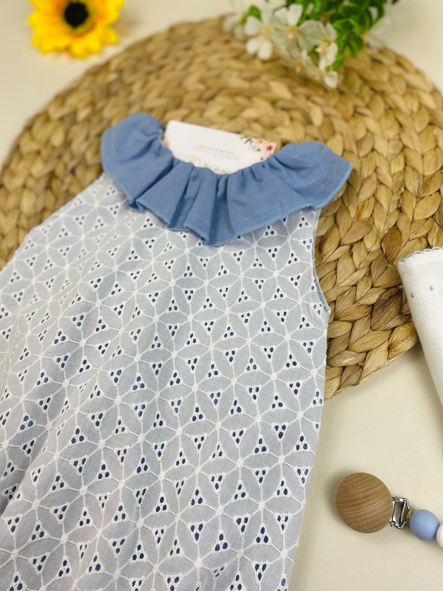 A soft embrace of white cotton, this romper enchants with its sky background dotted with delicate flowers. The blue ruffle collar adds a touch of grace, making it perfect for your little princesses. The embroidered details, with a slight transparency, create a romantic and dreamy effect, ideal for any special occasion. Each seam is designed to guarantee comfort and freedom of movement, so that every moment is a sweet memory.