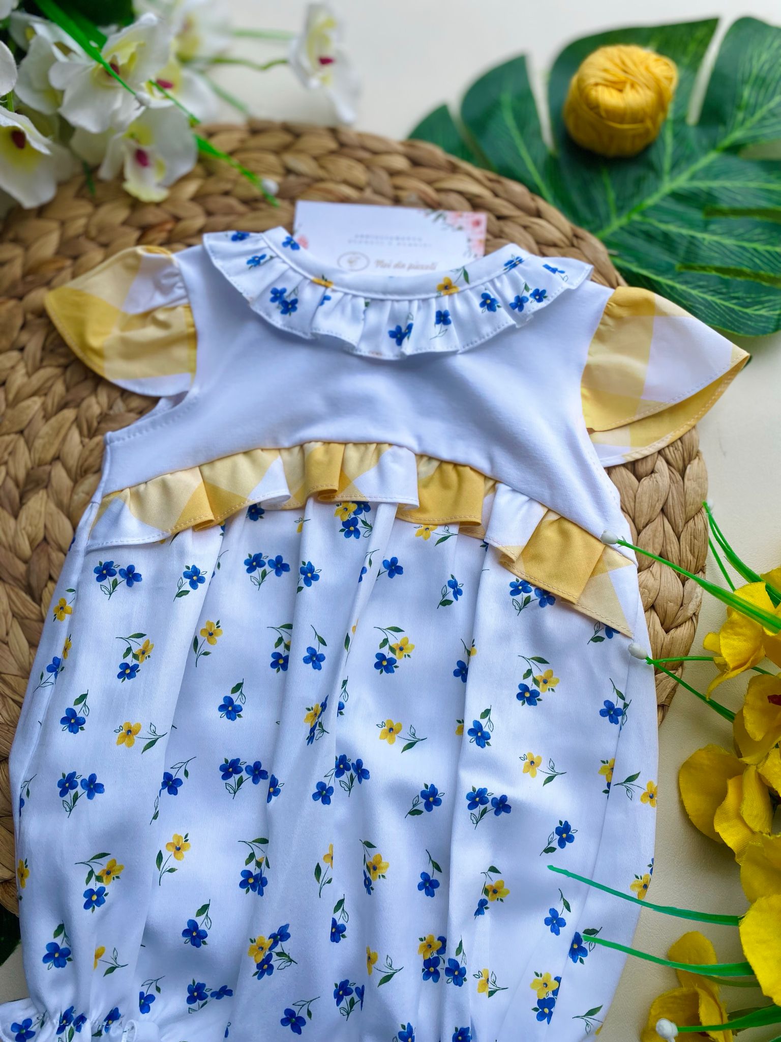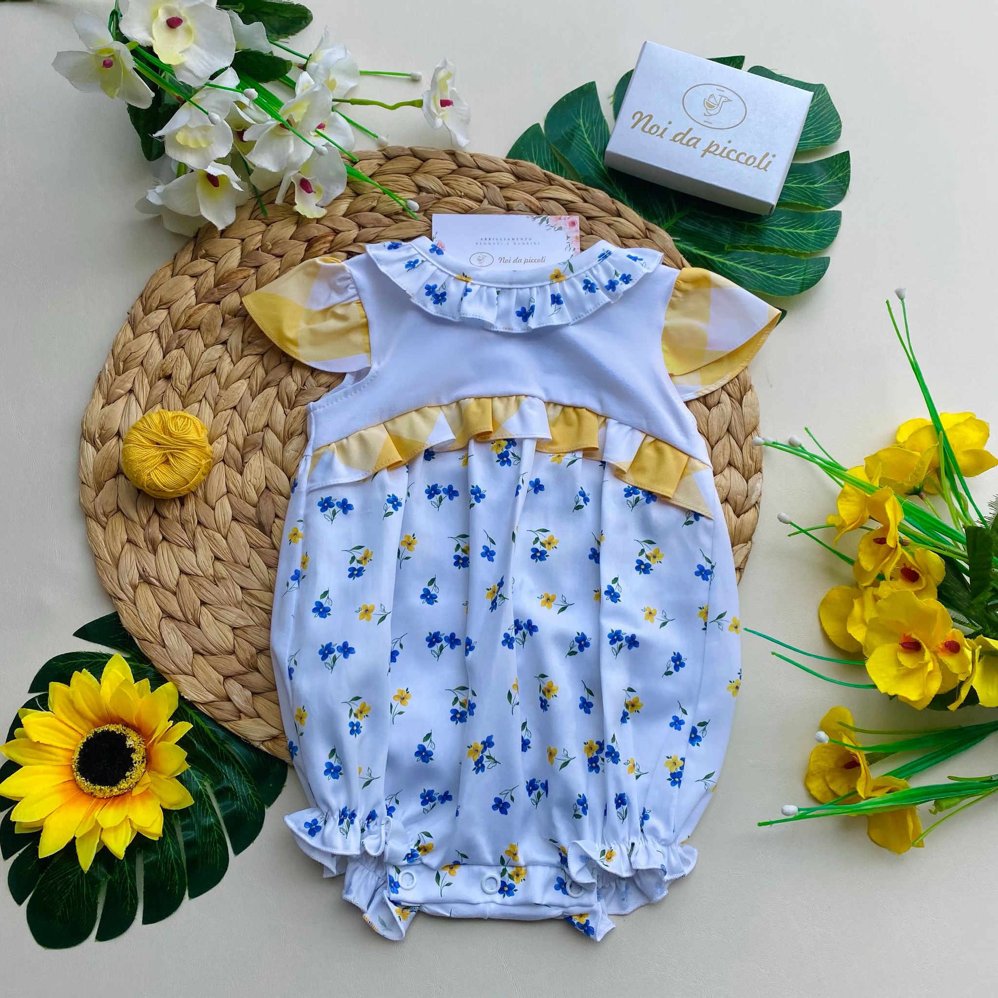 Delicate and adorable, this white romper is embellished with a blue and yellow flower pattern, perfect for making your little one's smile shine. The yellow and white checked central band adds a touch of vivacity, while the sleeves and collar, also decorated with flowers, create a harmonious and refined ensemble. The soft texture gently envelops the skin, making every movement a real pleasure. An ideal garment for every special occasion.