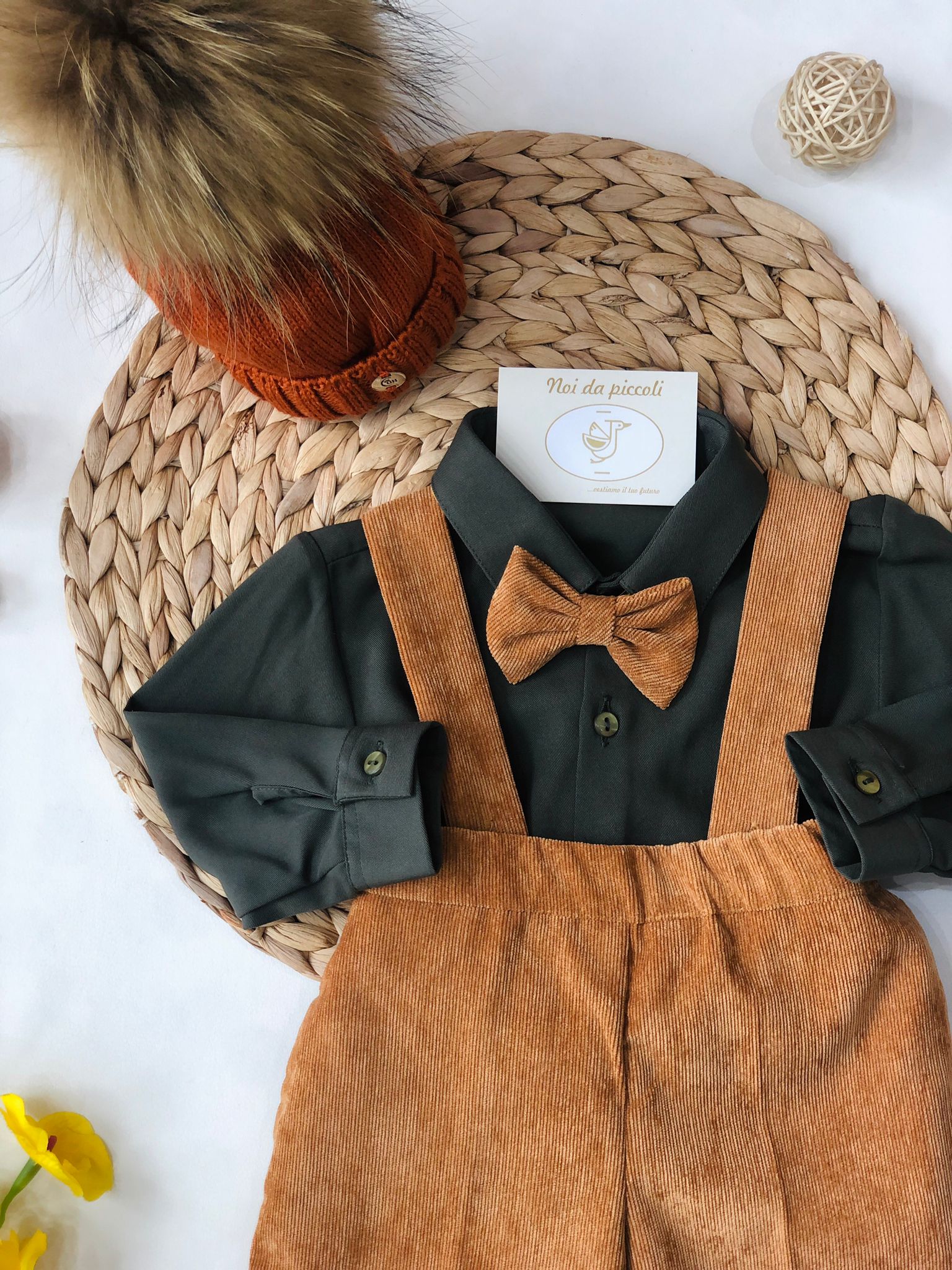 Corduroy overalls with green shirt and tone-on-tone bow tie like the overalls