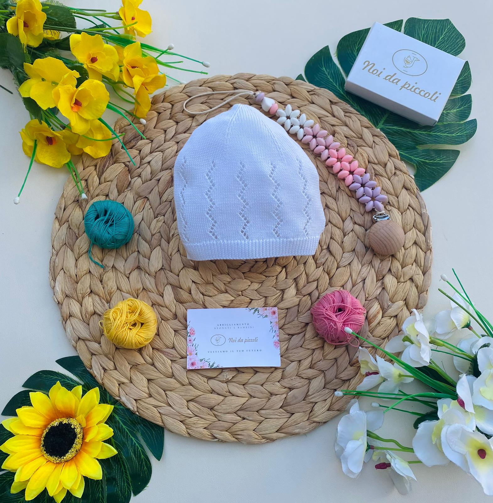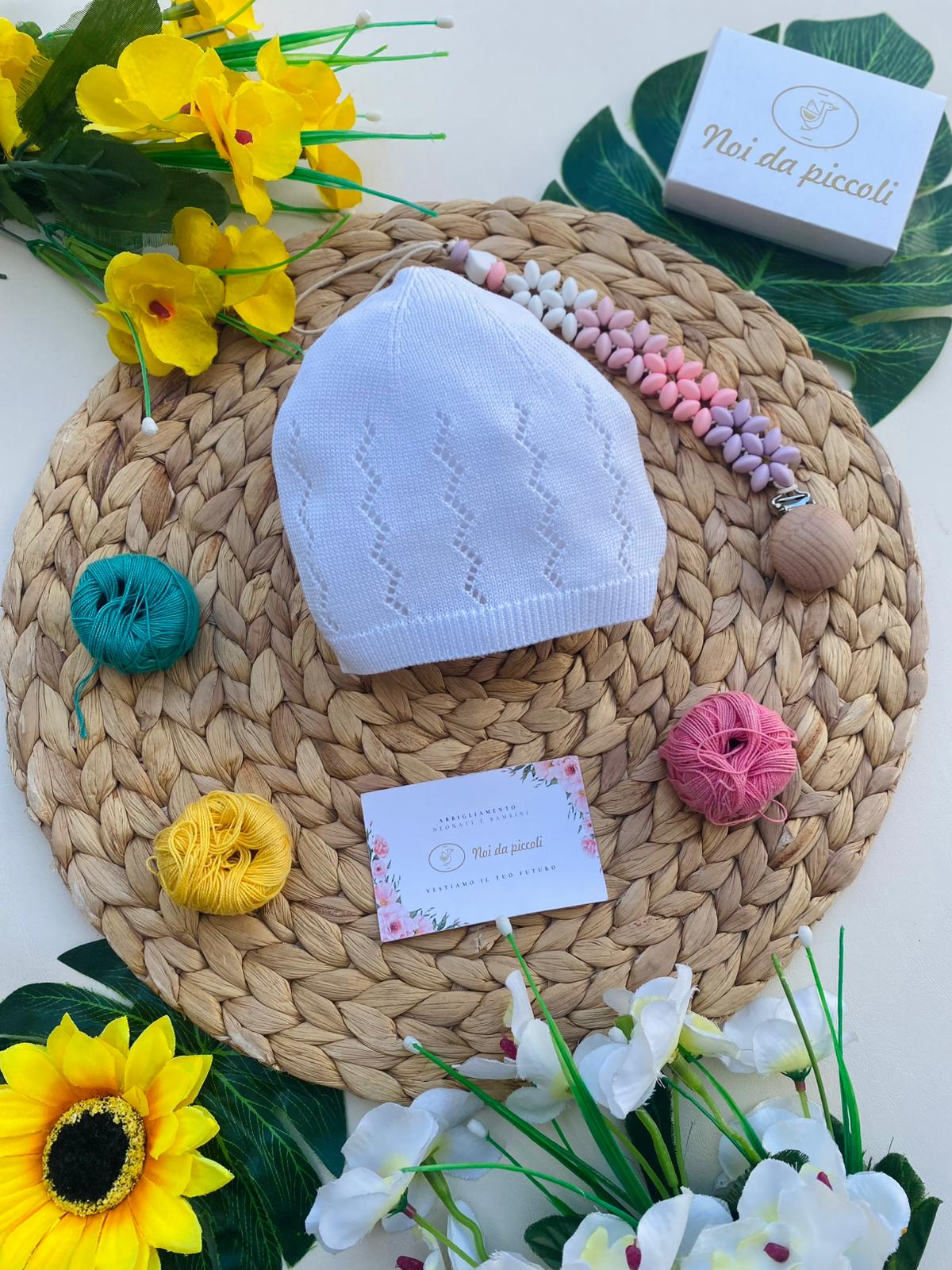 CAPPELLINO TRECCIA 1 PON POM VOLPE LANA E CASHMERE BIANCO