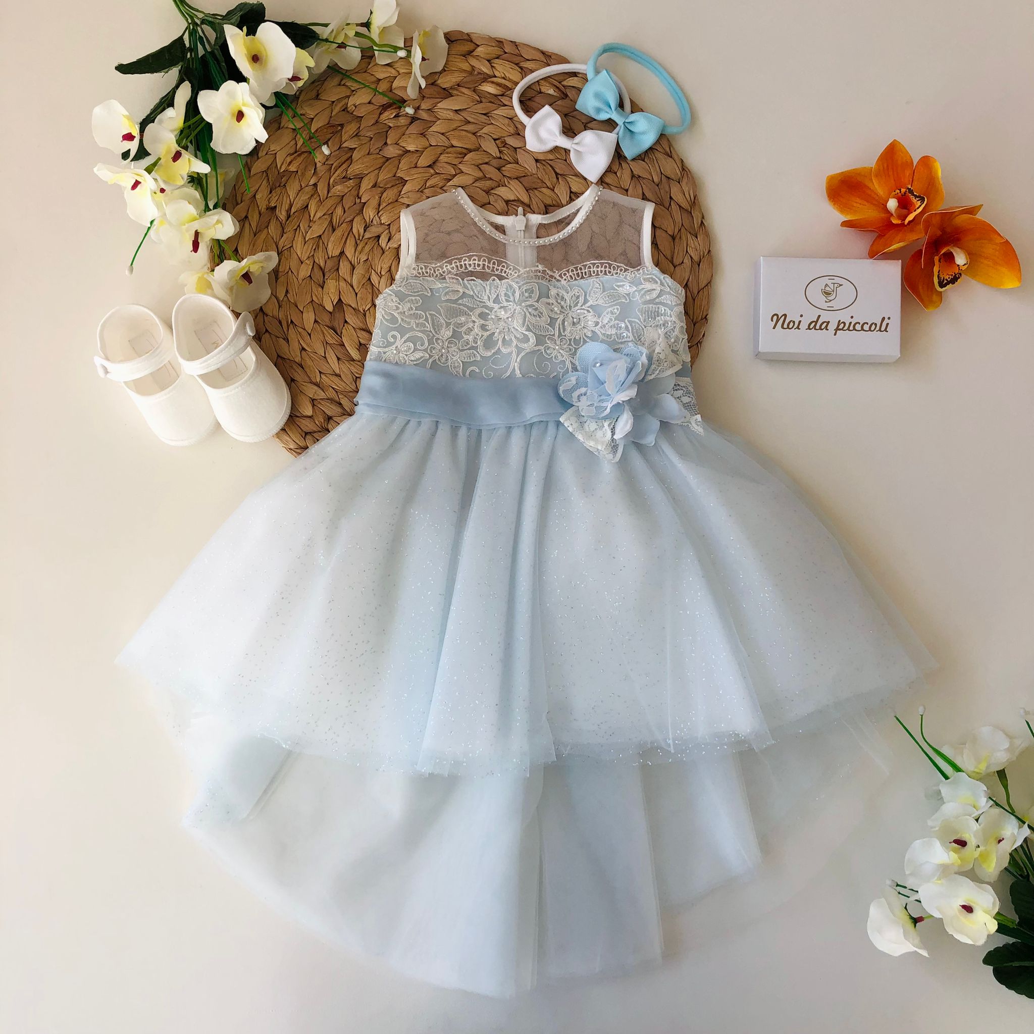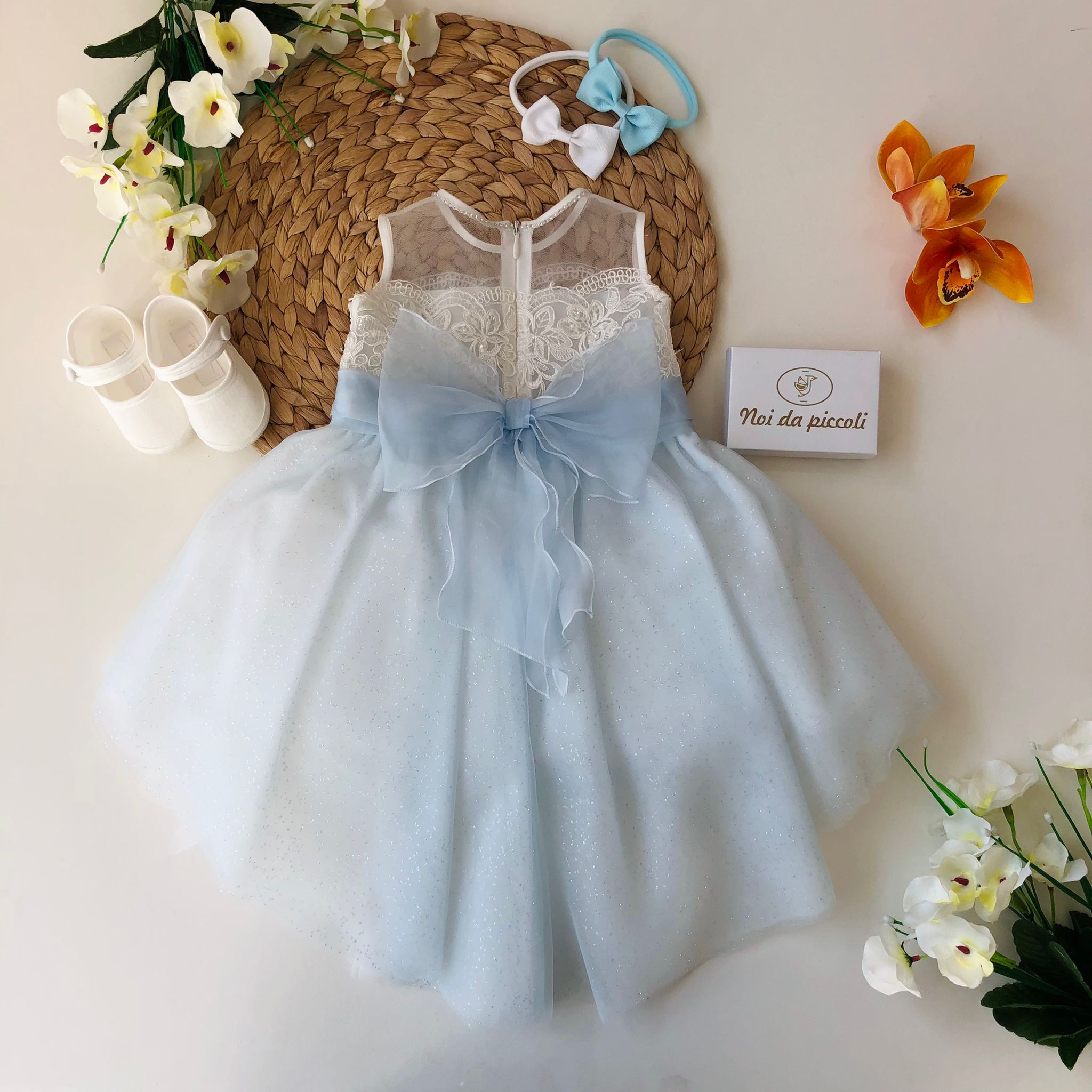 This enchanting baby blue ceremonial dress is a dream come true for any little girl. Crafted from a light and airy fabric, it features delicate floral lace on the bodice, embellished with an elegant bow and a pretty applique. The shade of blue, embellished with sparkling glitter details, adds a touch of magic, making every move a fairytale moment. Perfect for parties and celebrations, it will make your little one shine like a real princess.