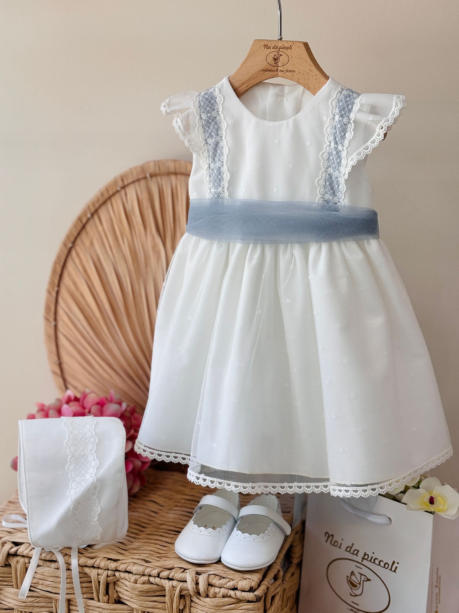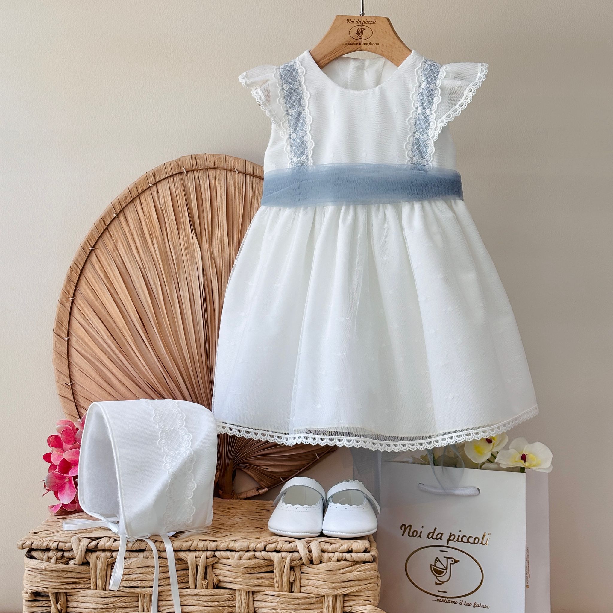 This enchanting dress for little girls is a dream of elegance and sweetness. Crafted from a delicate ivory fabric, it features refined lace details that adorn the bottom, giving it a touch of grace. The two delicate bows on the sides add a touch of charm, while the impeccable stitching highlights its artisanal quality. Perfect for special occasions, every eye will stop on your little one, wrapped in an aura of pure beauty. A garment that makes every moment even more magical.