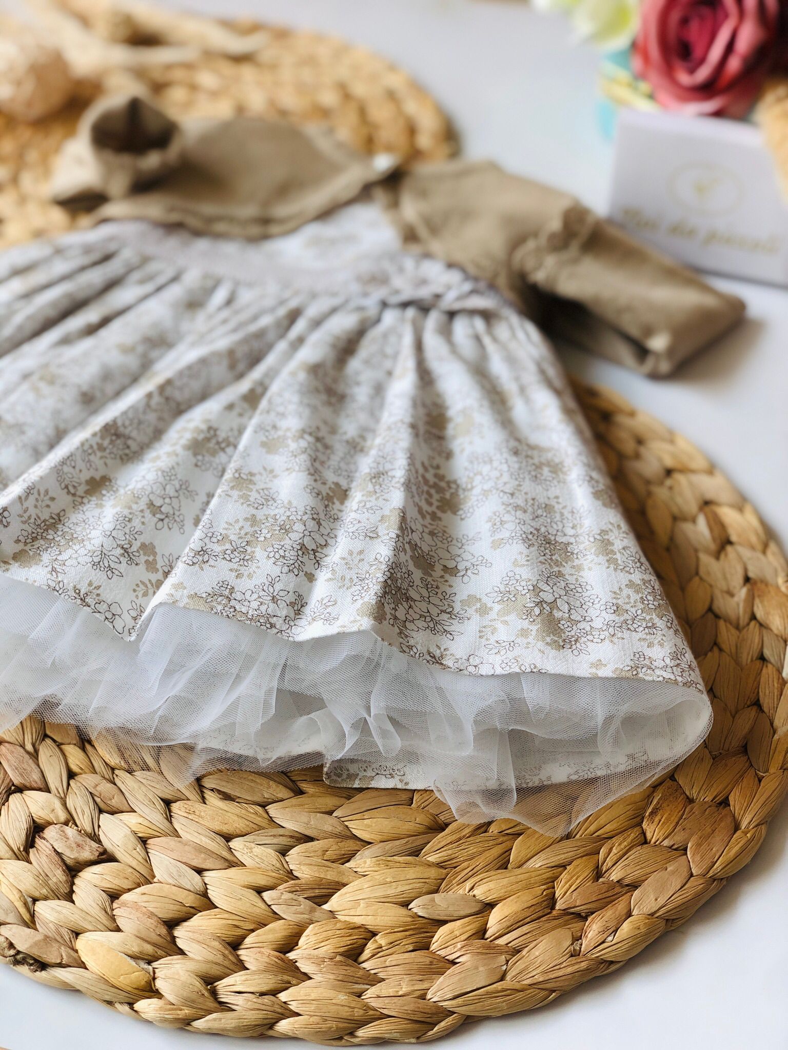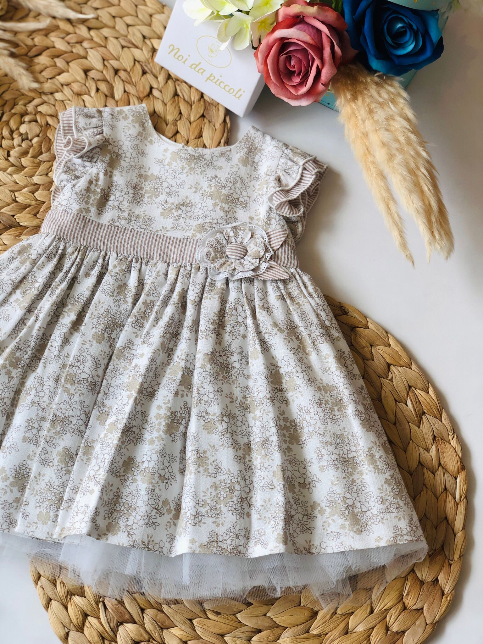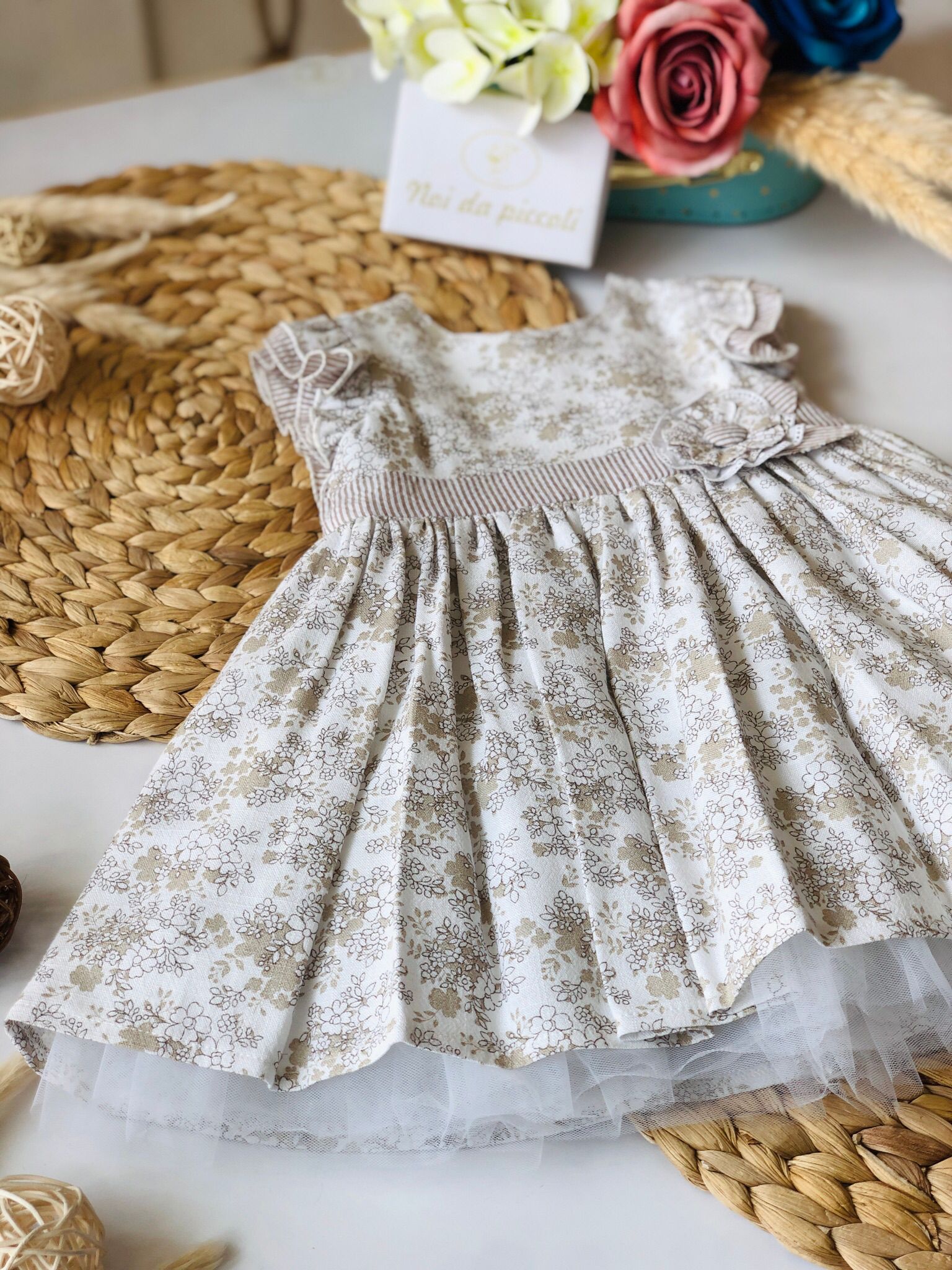 A delightful dreamy dress, enriched by an elegant coffee golfinho. The soft fabric gently envelops your little one, while the delicate floral embroidery in warm tones adds a touch of refinement. The lace trims and the pretty bow give a timeless elegance, perfect for any special occasion. The light tulle overlay offers movement and lightness, making every step an enchanted moment. A garment that will make eyes shine and hearts warm.