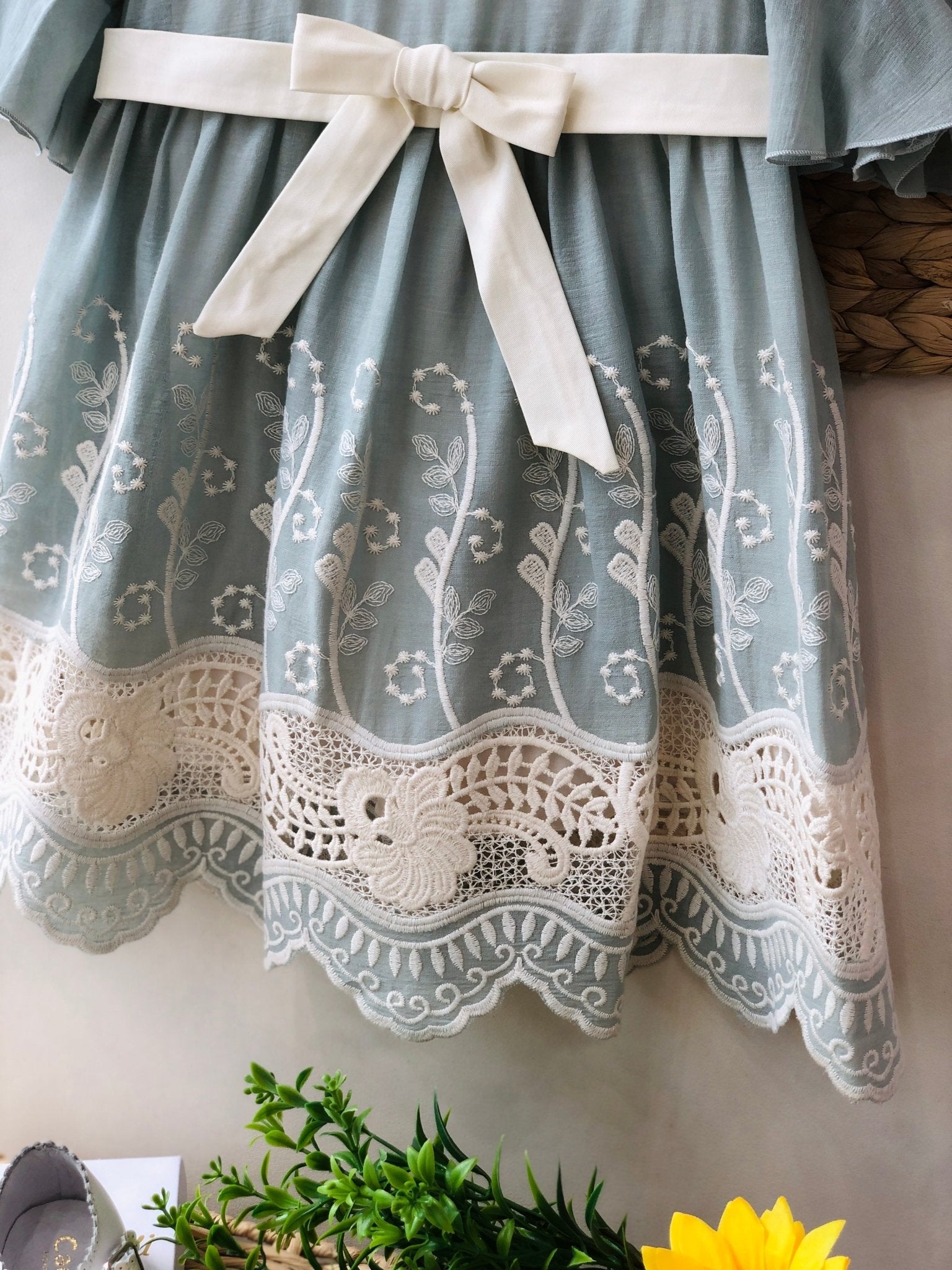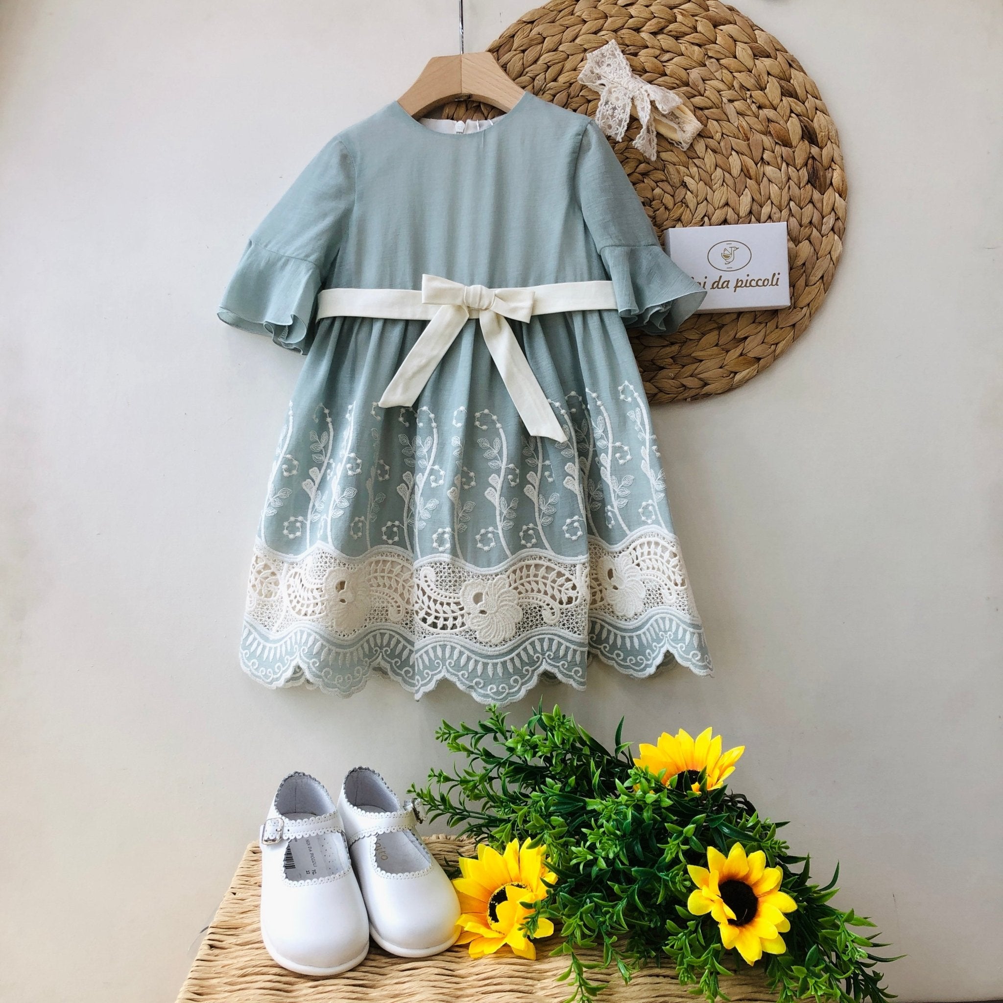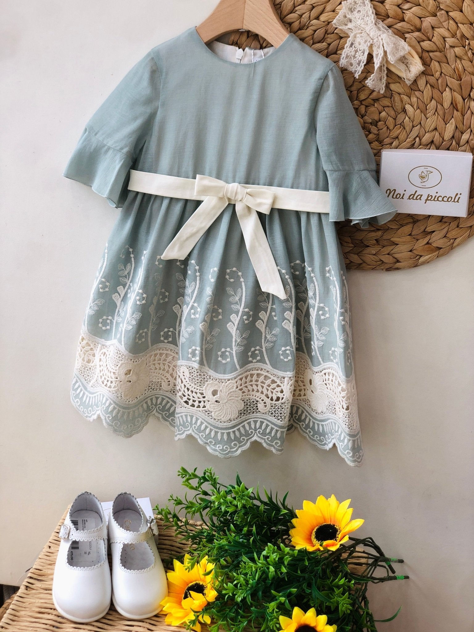 A delightful little dress that enchants with its elegance. Made in a soft sage shade, it features delicate ecru lace that enriches the skirt, creating a play of transparencies and textures. The bell sleeves add a touch of lightness, while the ribbon that ties at the waist gives it a romantic charm. Perfect for any special occasion, it is a piece that will make every little princess shine. Add a smile and prepare to enchant!