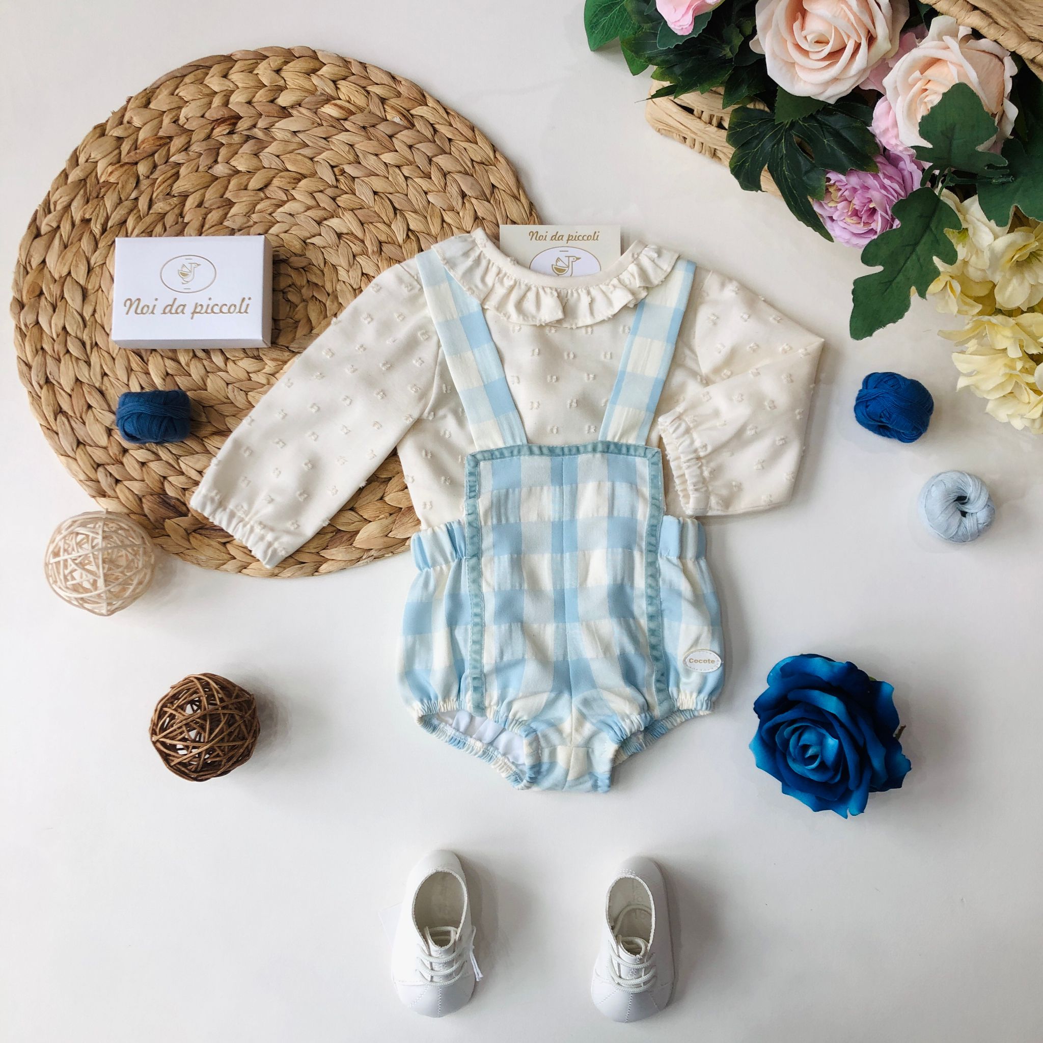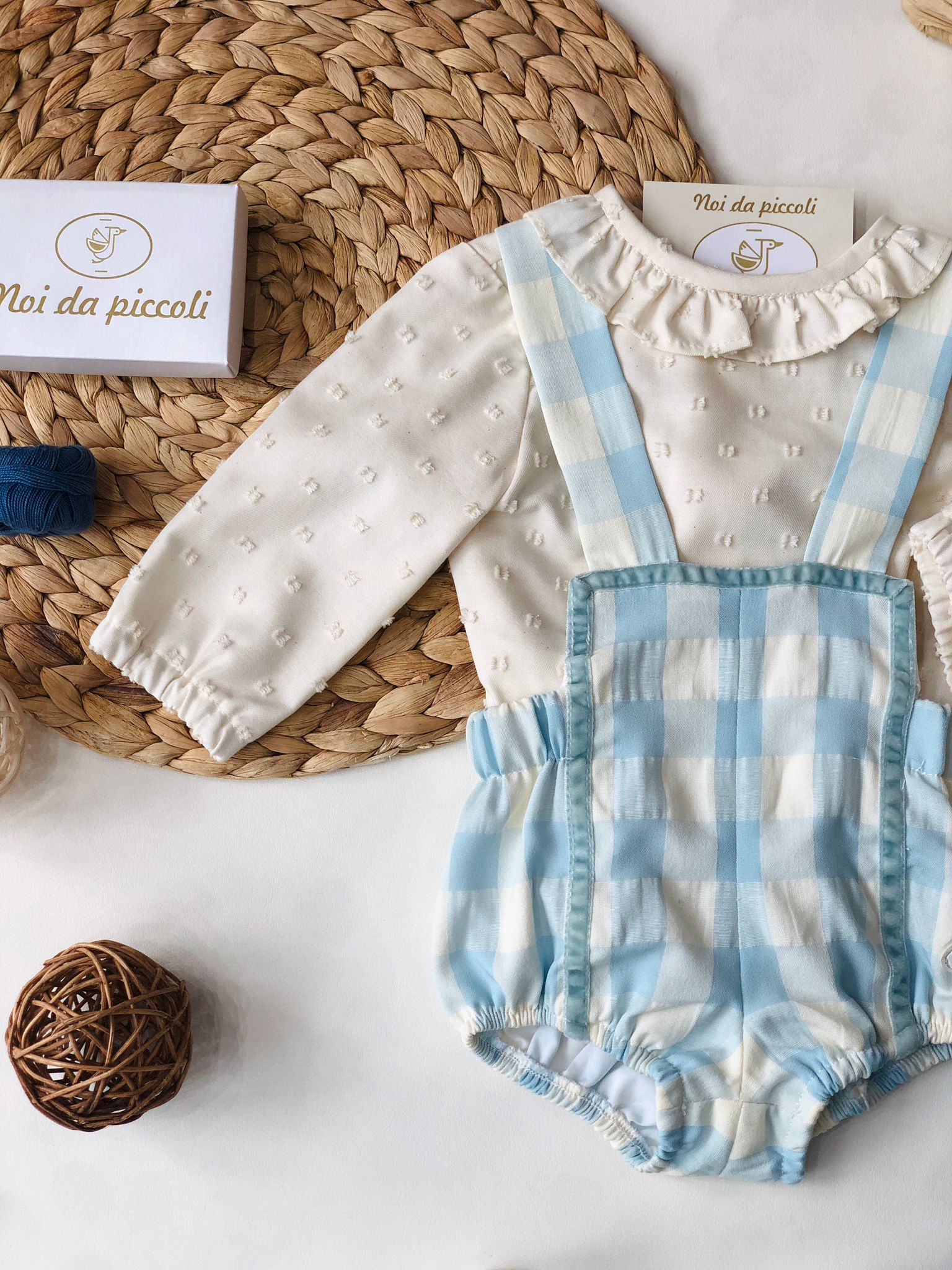 dungarees with white and sky checked shirt, with plumetis embroidery shirt!