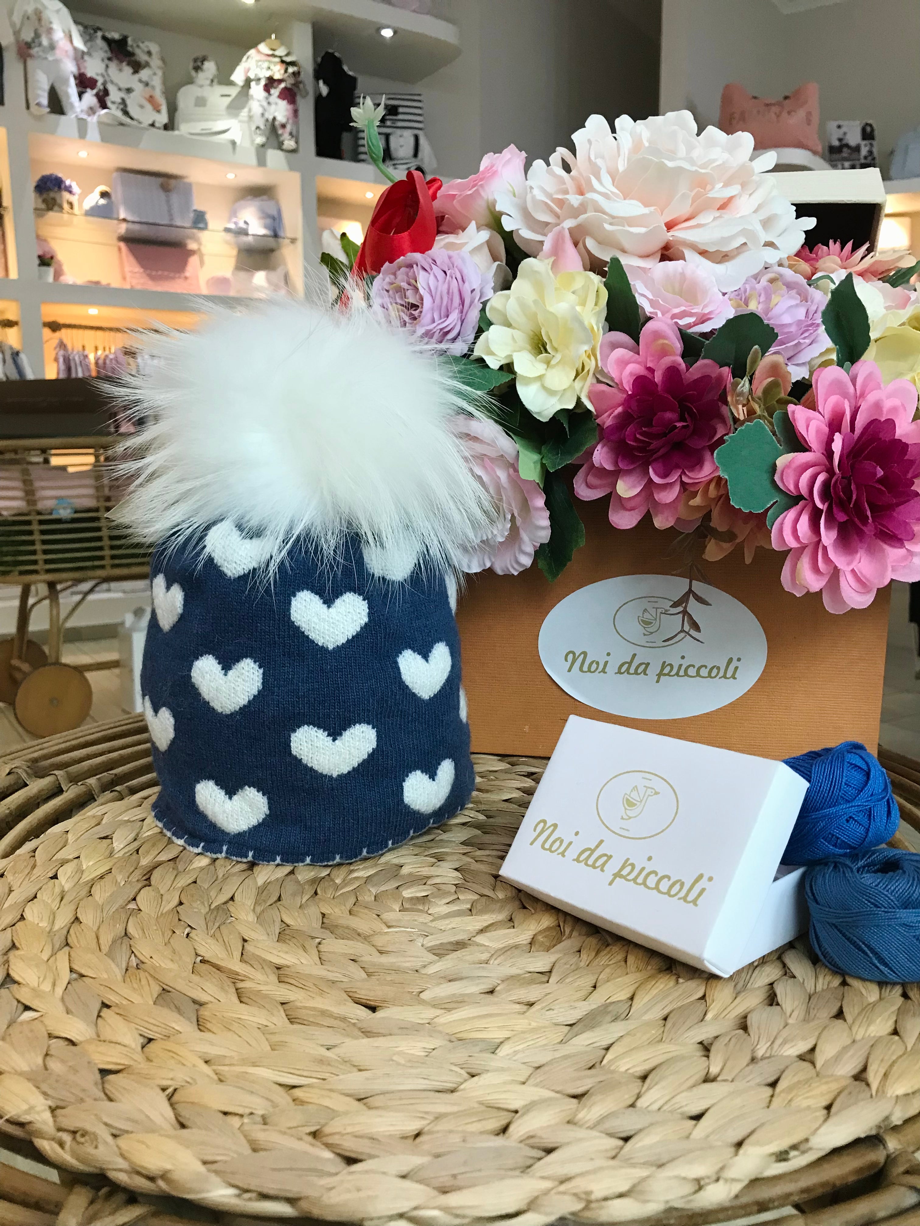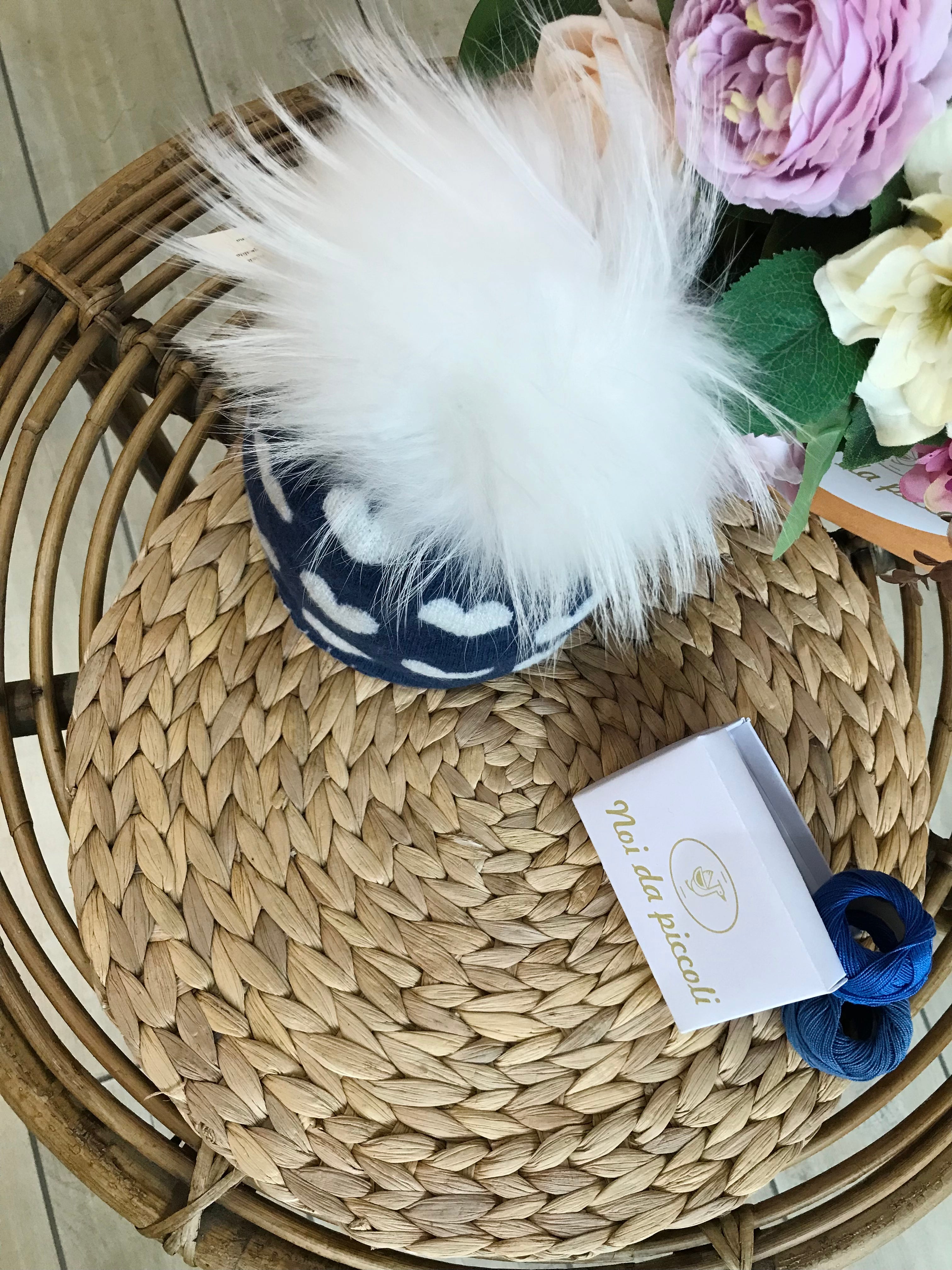 BLUE WOOL AND CASHMERE CAP WITH CREAM HEARTS