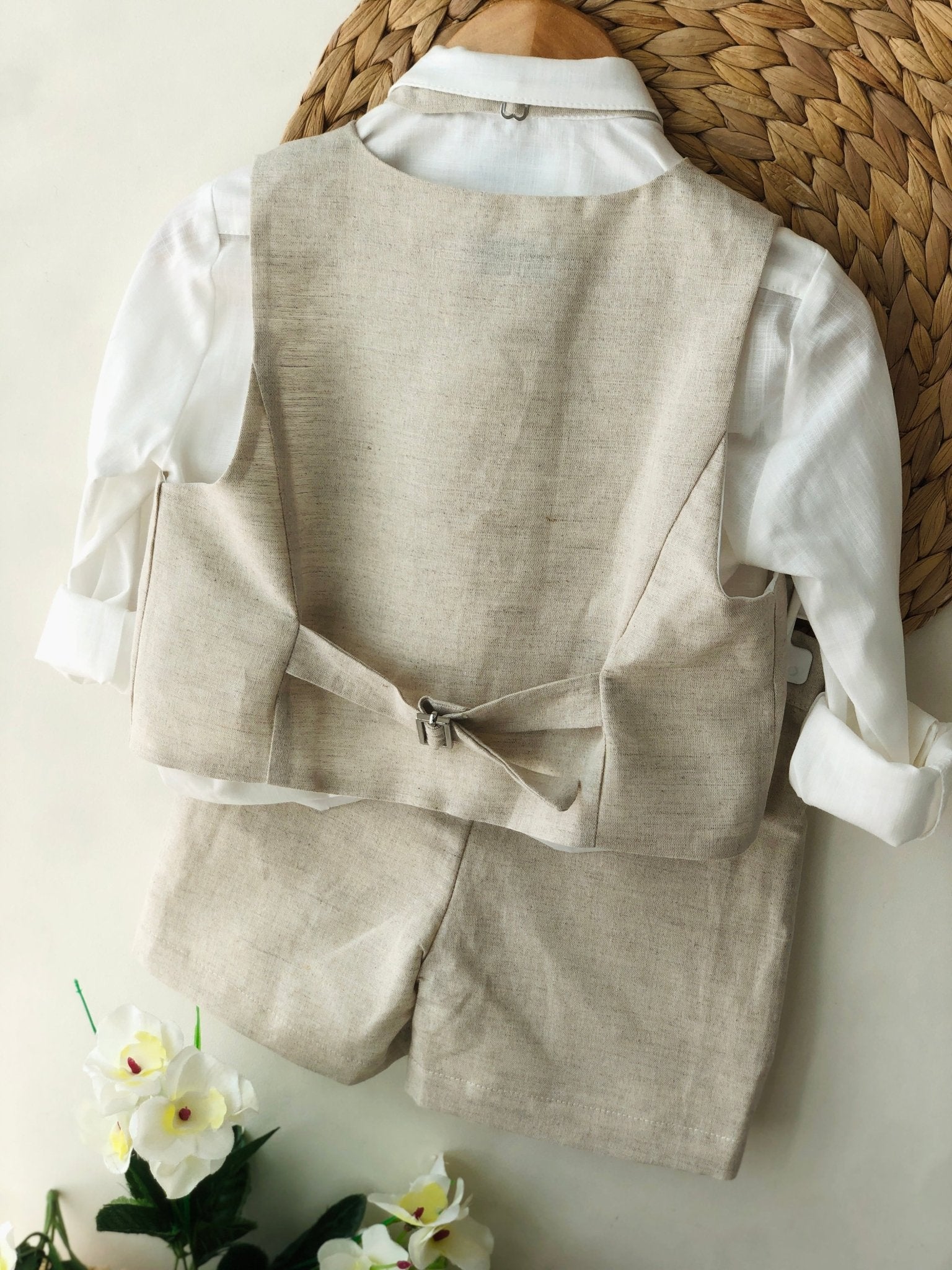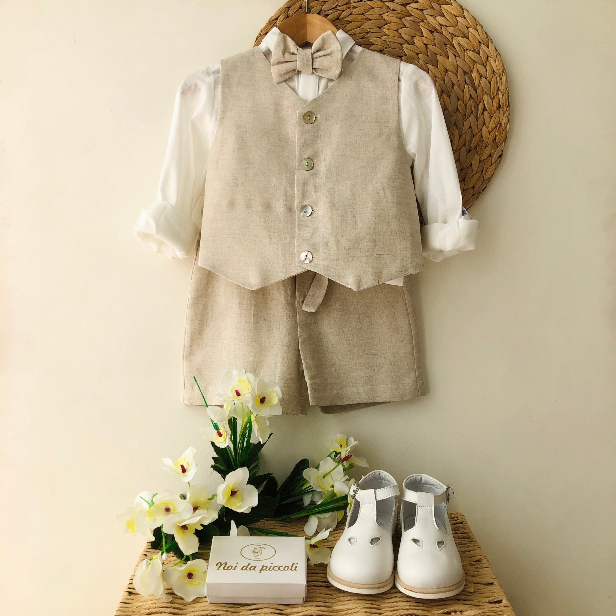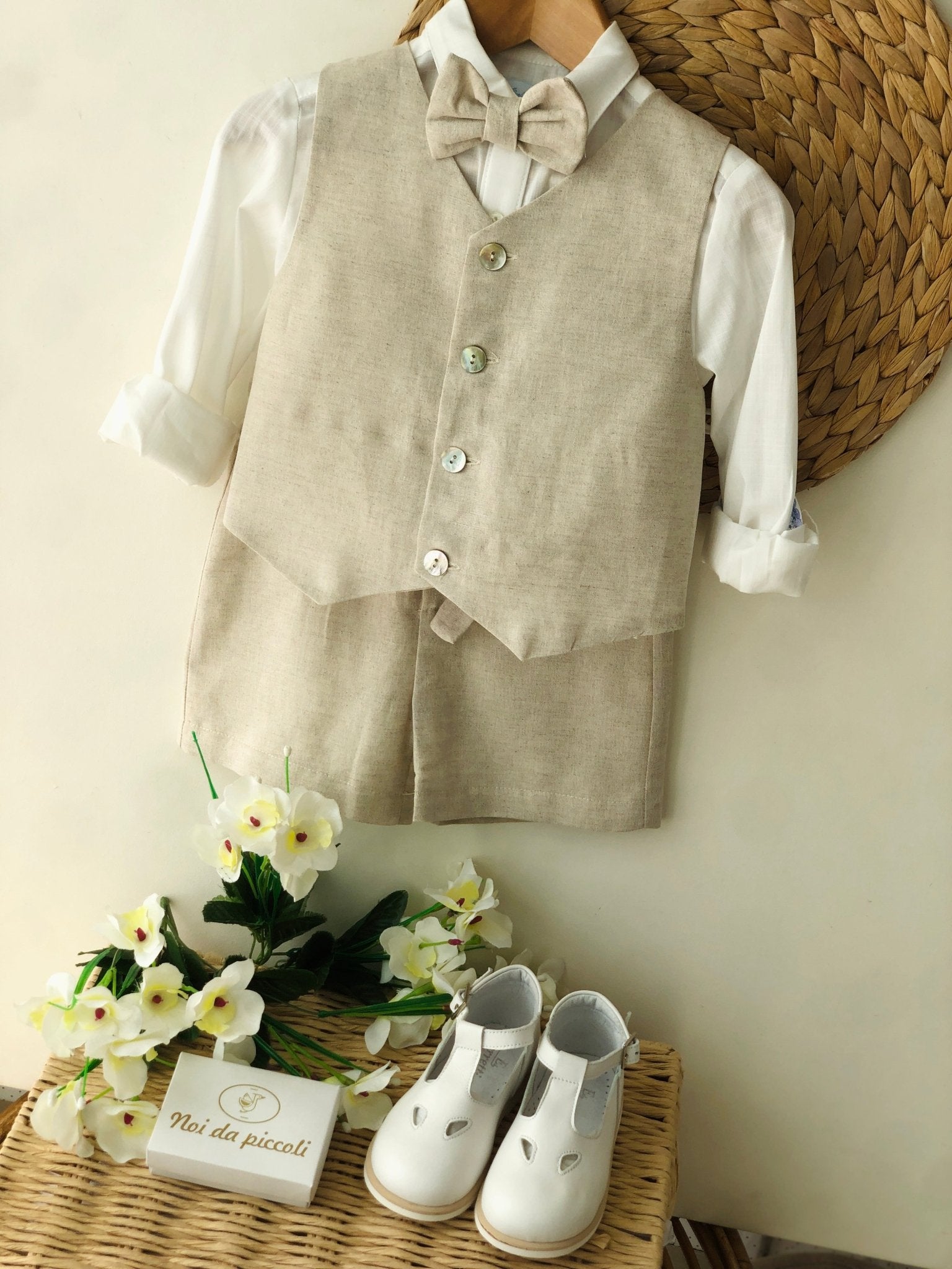 Cotton shirt, linen and cotton vest, shorts and bow tie always in linen and cotton, hypoallergenic cotton for your love! A gem for this outfit are the mother-of-pearl buttons