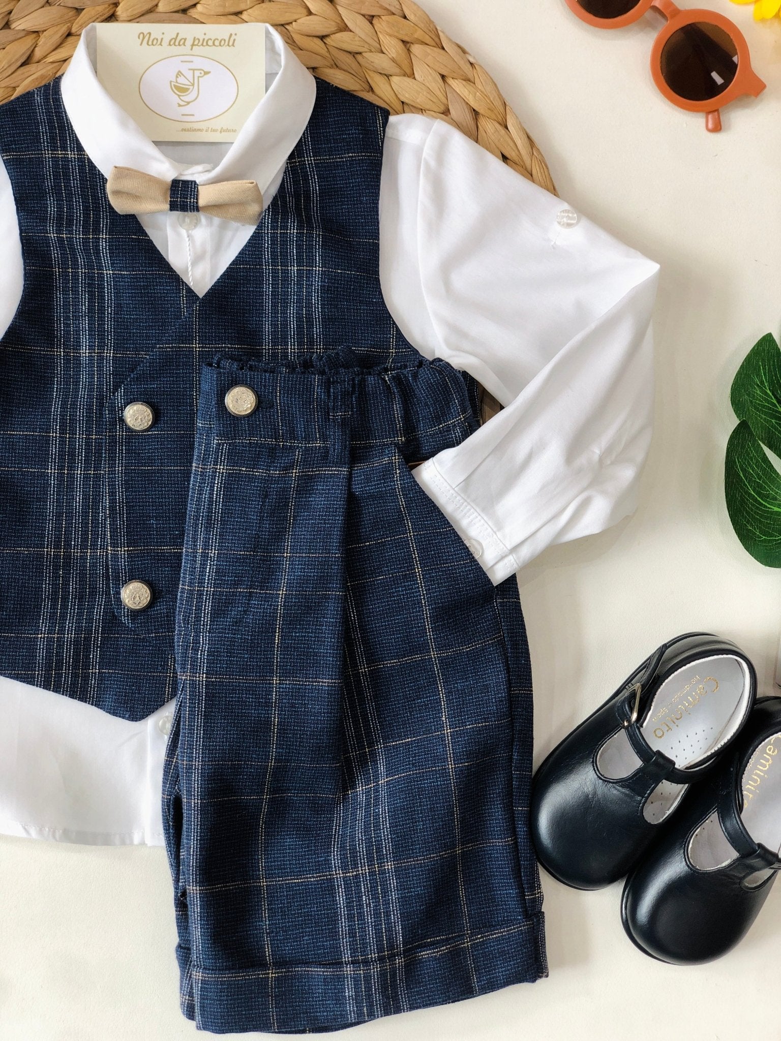 Beige checked blue shirt, waistcoat, trousers and bow tie; delicious and elegant.