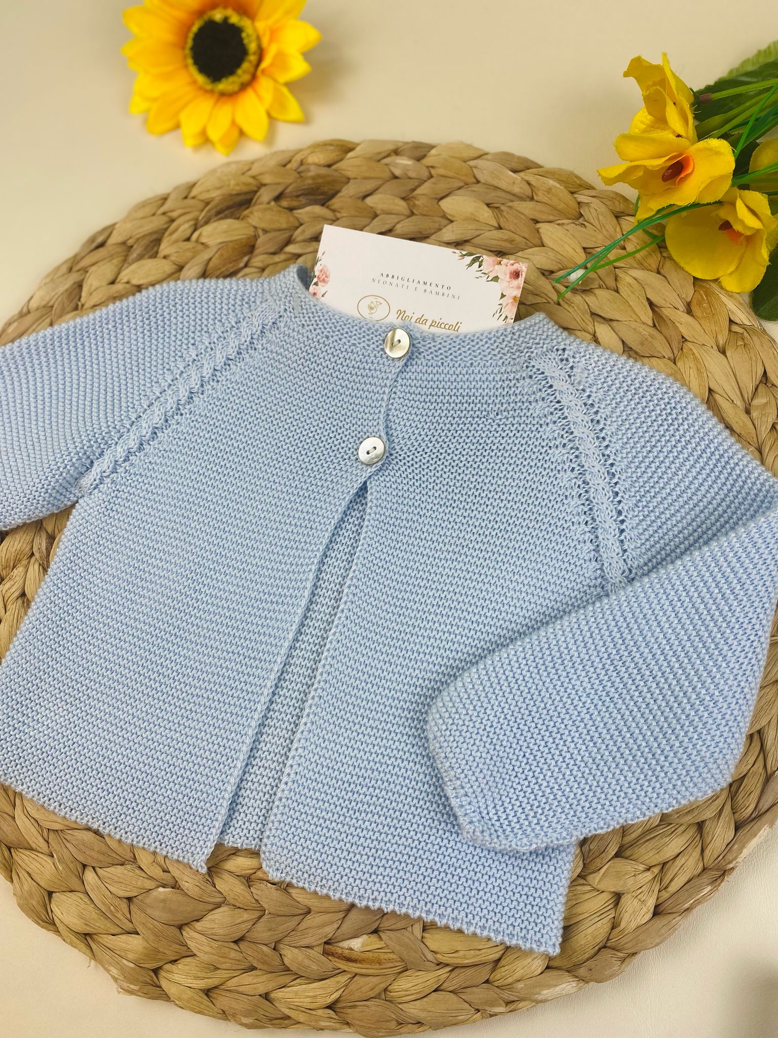 light blue cotton sweater with embroidery and buttons on the front