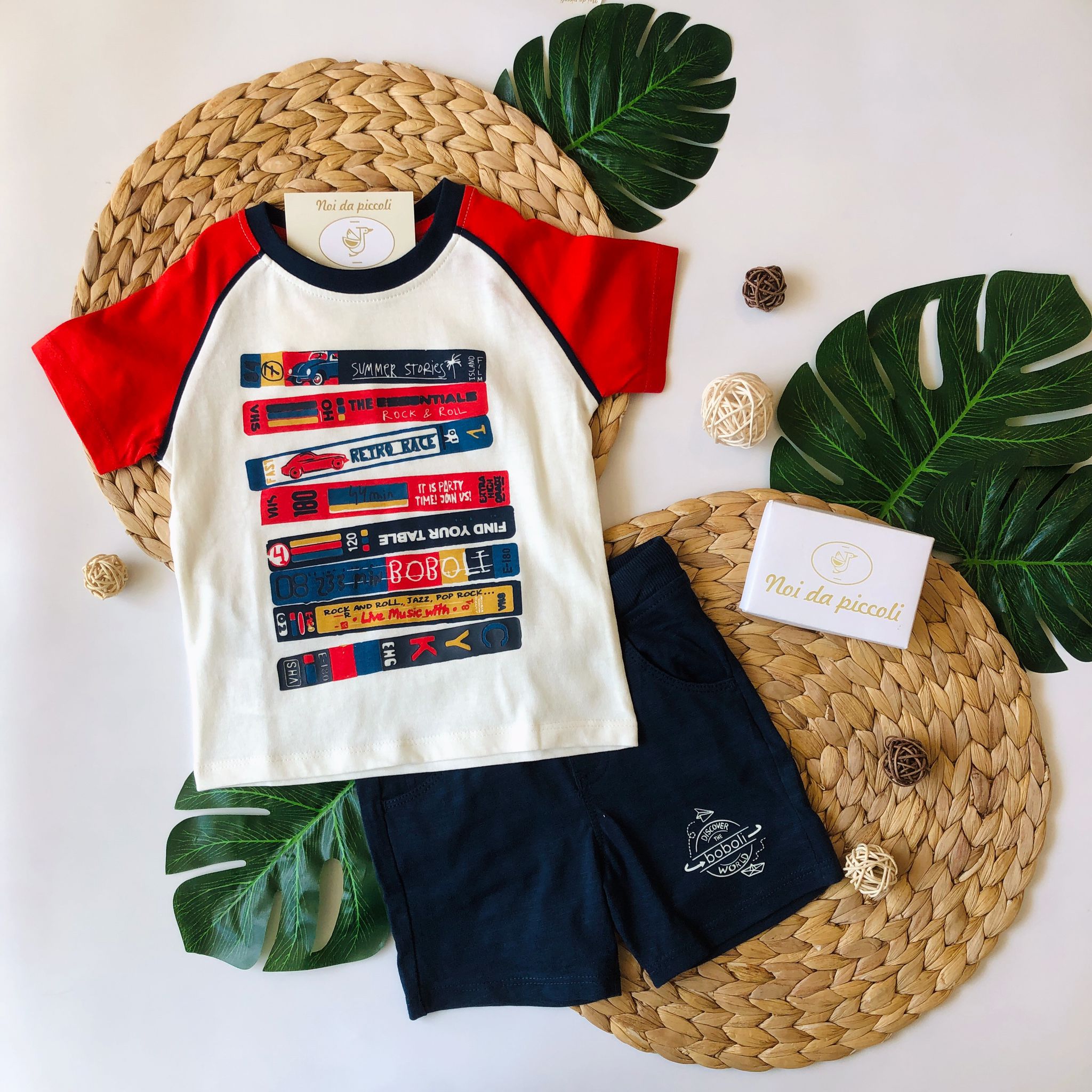 This cute outfit for little ones is a real hug of freshness and style. The top, in soft cotton, features a bright design with colorful graphics that tell of summer adventures, while the red sleeves add a touch of joy. The blue shorts, with a comfortable fit, match perfectly, offering freedom of movement for every game. A hint of charm is given by the embroidered details, making this set ideal for any leisure occasion.