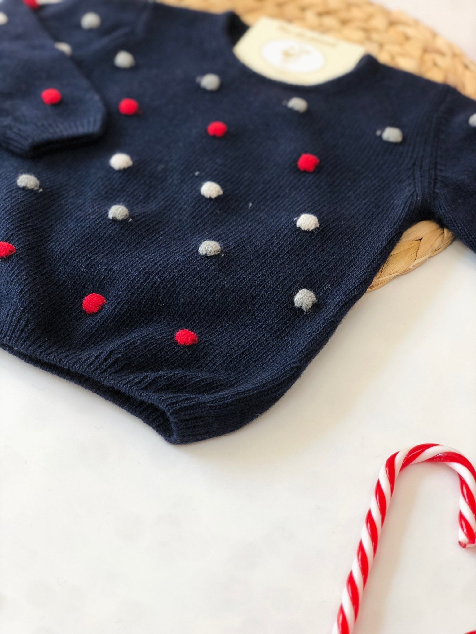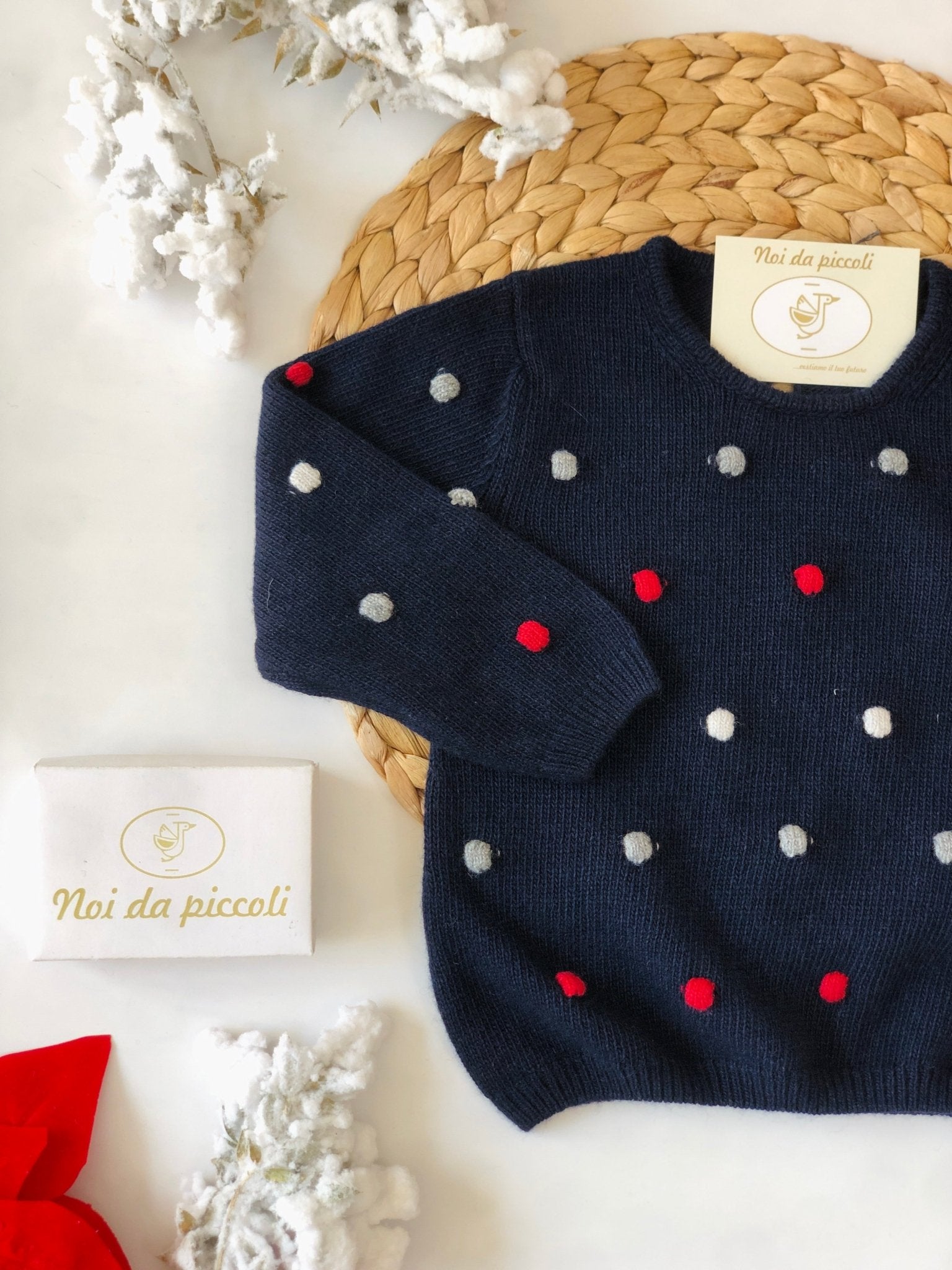 BLUE WOOL AND CHASHEMIRE SWEATER WITH RED AND WHITE POLKA POTS