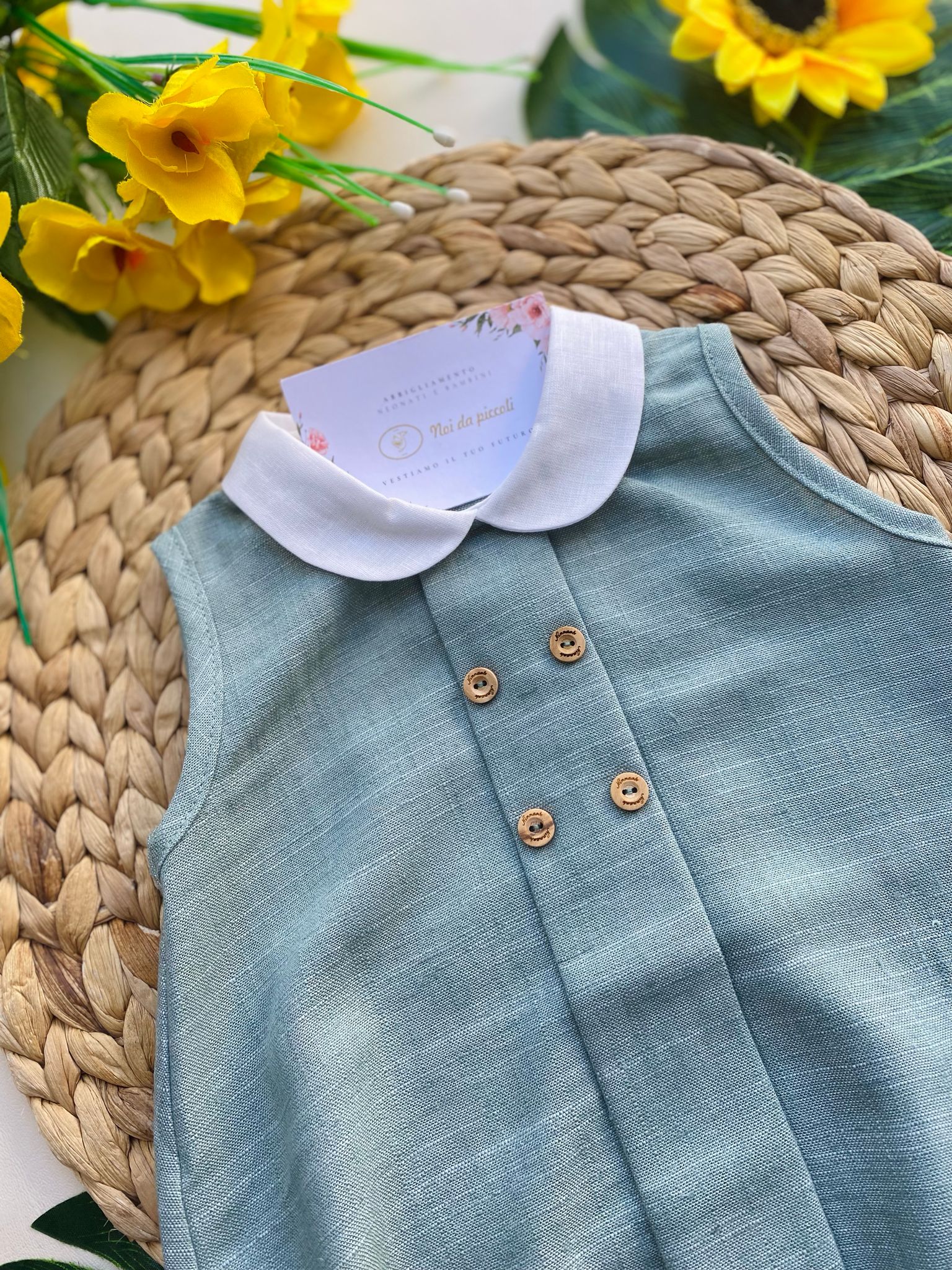 cotton romper in white with cream side trim and mother-of-pearl buttons on the front