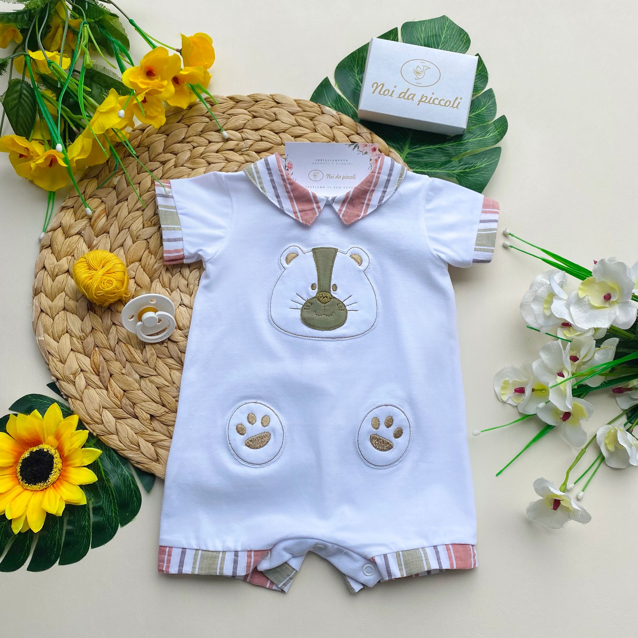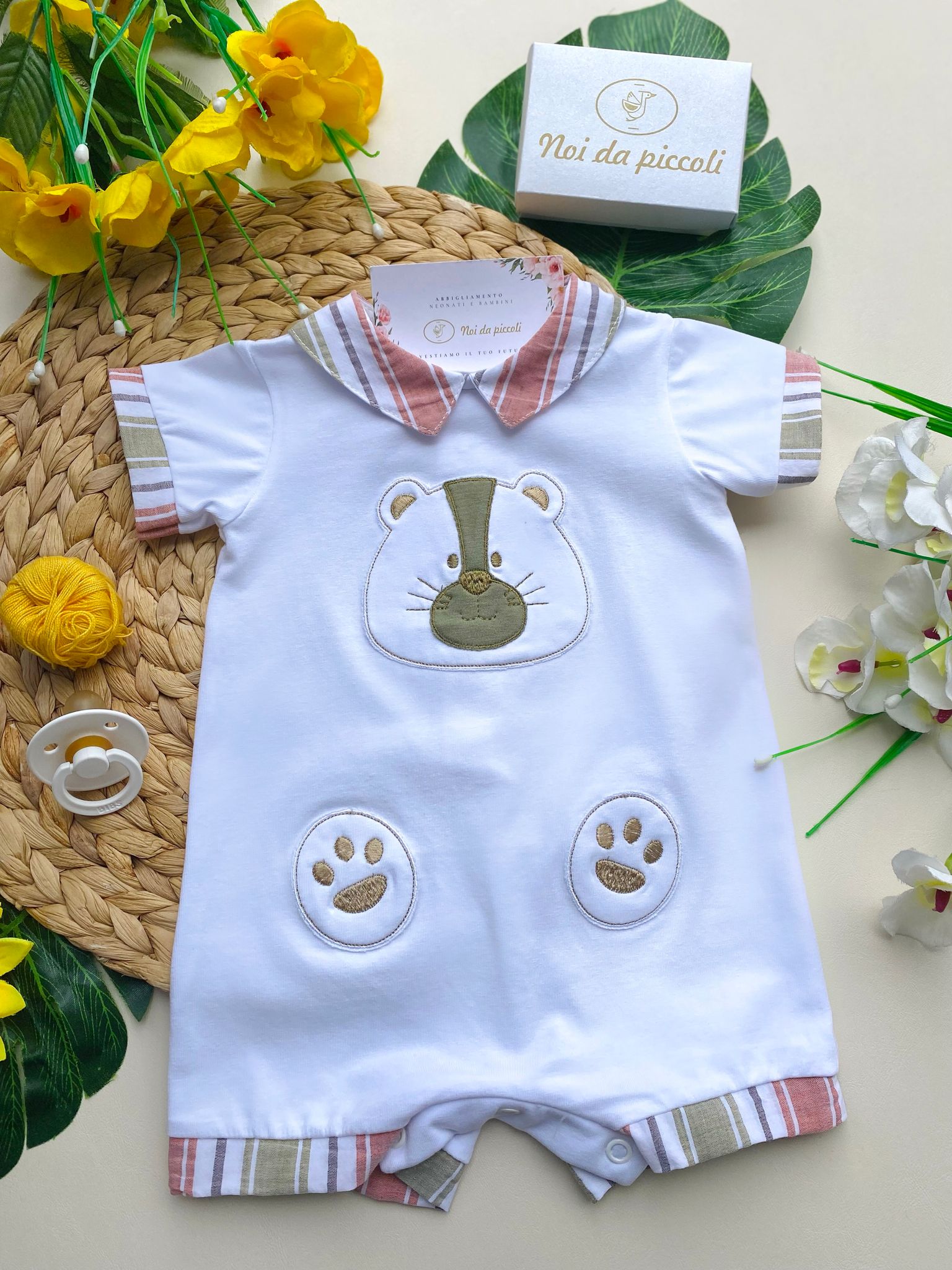 white romper with little designs and dark pink, green and blue stripes on the collar, sleeves and bottom