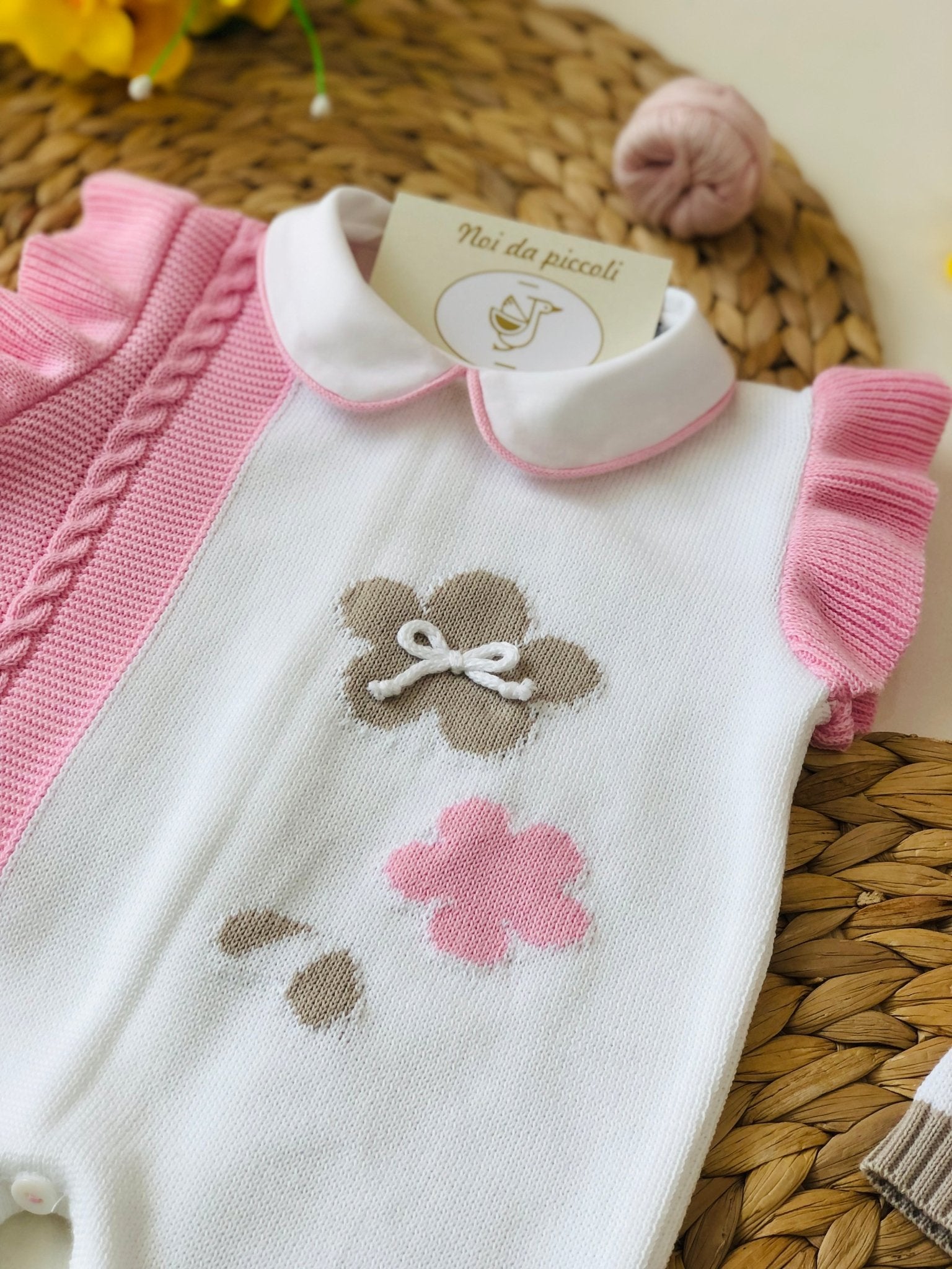 A sweet romper that embodies the essence of tenderness, made of soft cotton thread in delicate shades of beige, pink and white. The slightly gathered sleeves and collar add a touch of elegance, while the small embroidered floral patterns tell stories of games and dreams. Perfect for accompanying your little one's every adventure, this garment is a true embrace of style and comfort. Discover the enchantment of Made in Italy, where every detail is designed for a little princess.