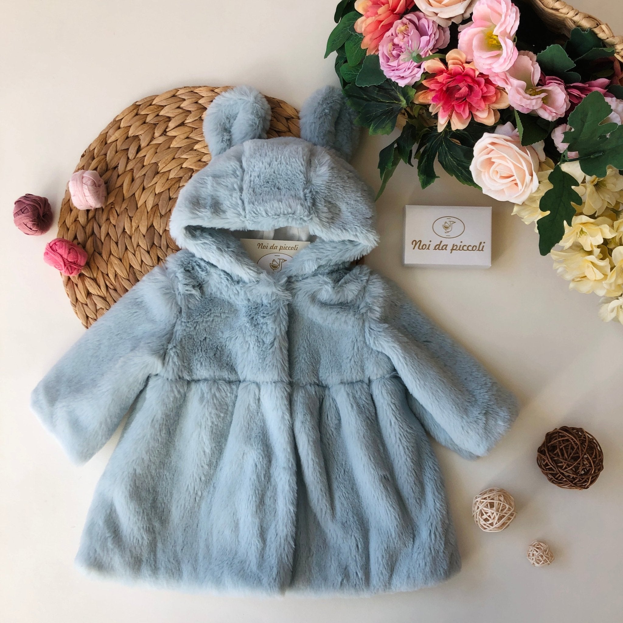 Fur coat with sweet ears on the hood.