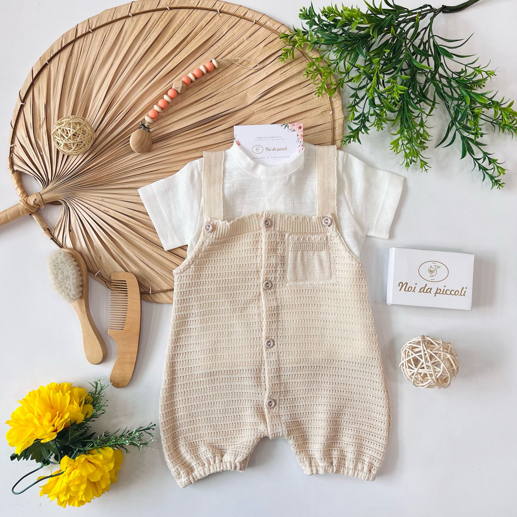 Make every moment special with this delightful piece of clothing. The light and fresh linen blouse perfectly matches the cotton thread overalls, characterized by a sweet net texture that enchants with its elegance. The beige tone harmoniously marries the delicate embroidery, while the refined bows add a touch of charm. Perfect for little dreamers, this outfit is ideal for every occasion, giving comfort and timeless style.