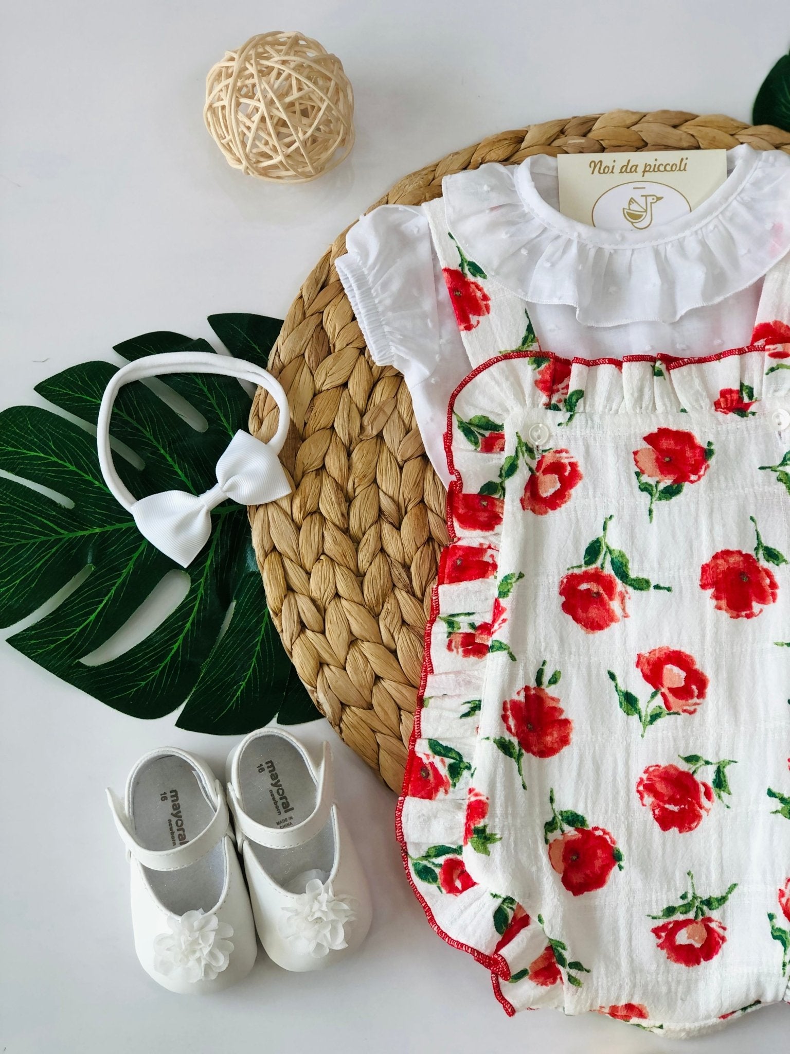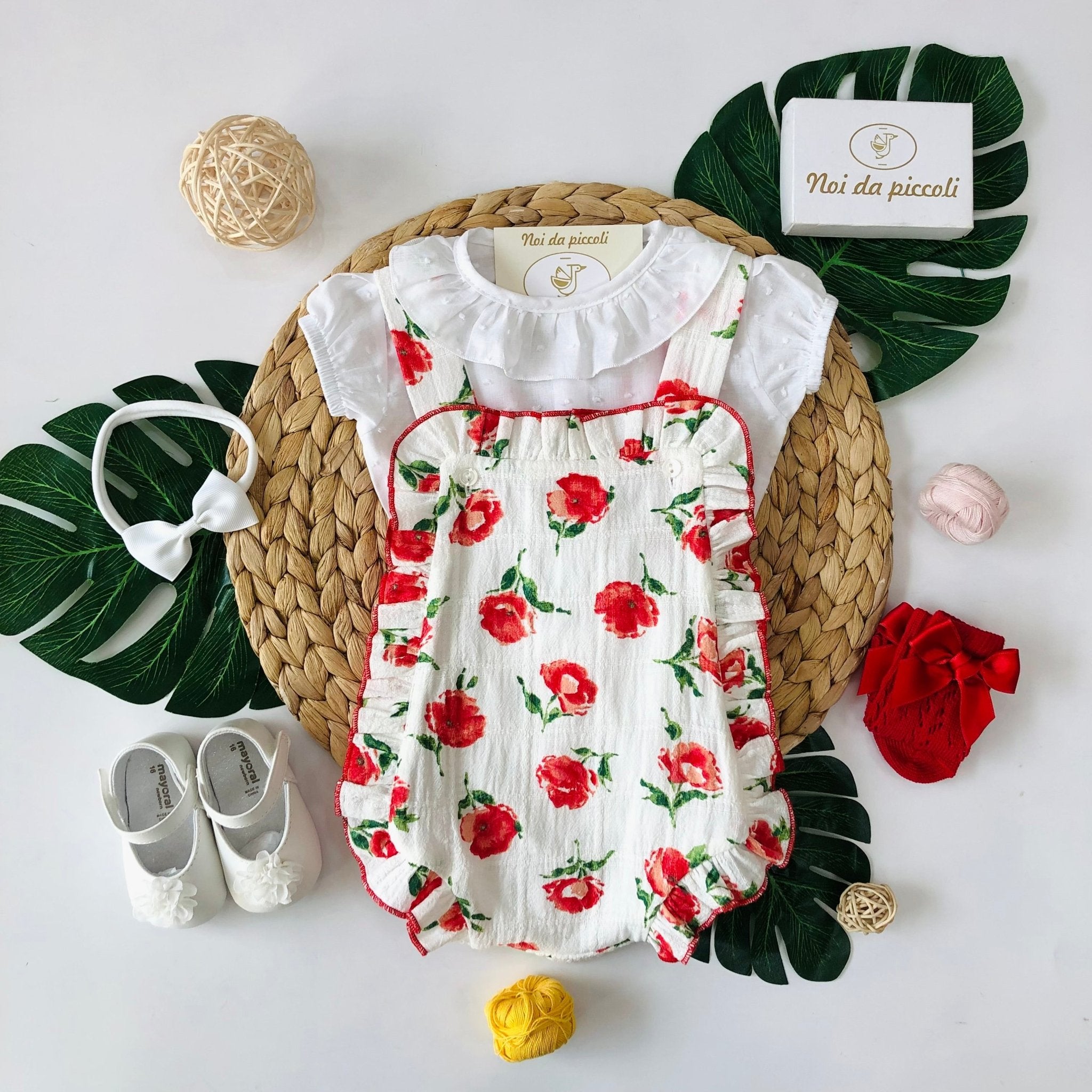 A soft cotton hug envelops your little one with grace and style. This delightful ensemble plays with a white background dotted with bright red poppies, creating a fresh and spring atmosphere. The delicate gathered collar of the t-shirt perfectly matches the neat stitching of the overalls, while the lace details add a touch of elegance. Every moment becomes special wearing this piece, ideal for any occasion to celebrate.