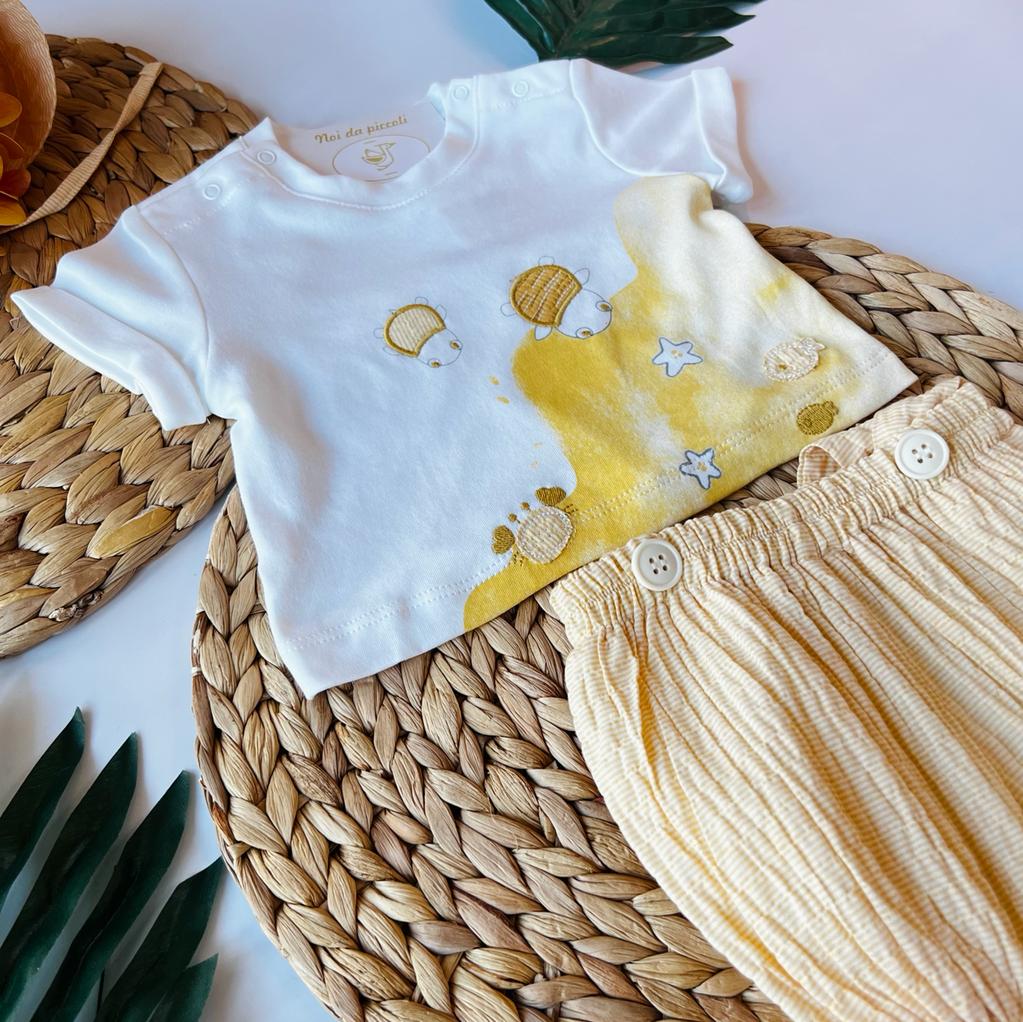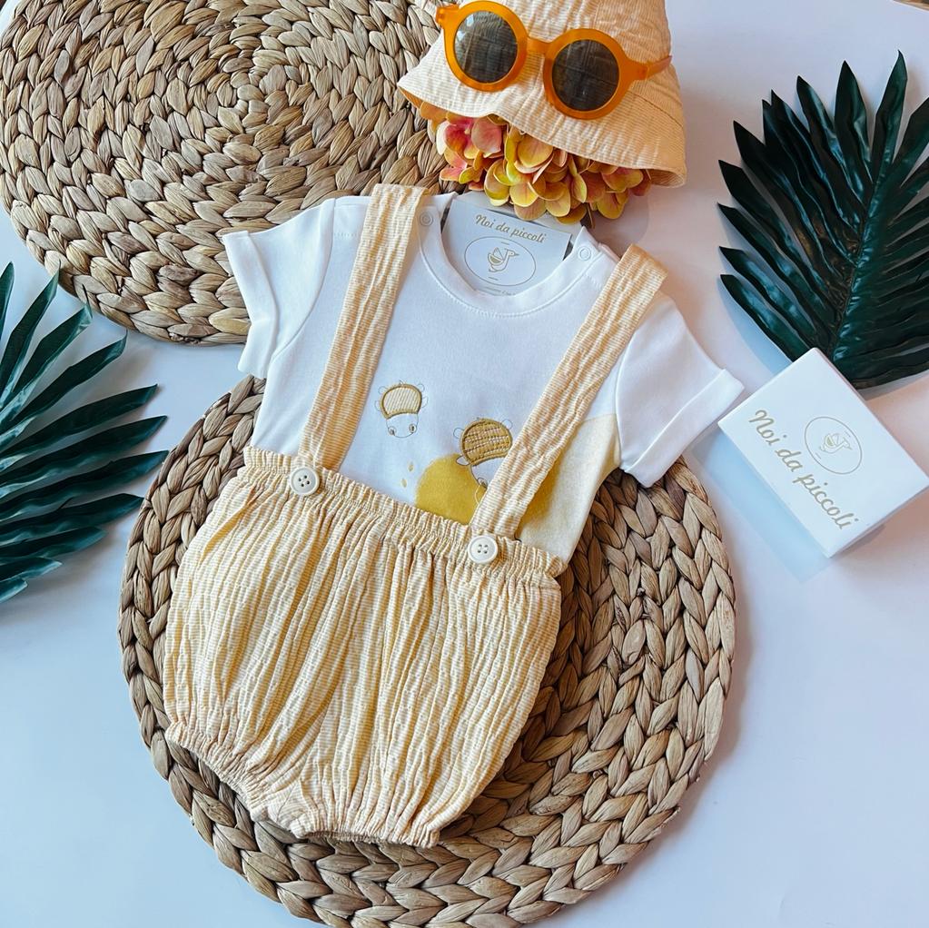 This delightful ensemble is a sweet hug for your little one. The yellow overalls, with their soft and light texture, are perfect for wrapping your baby in unparalleled comfort. The white top, decorated with a cute colorful pattern, adds a touch of originality, while the hat coordinates the look beautifully. Every detail is designed to make every moment special, with a palette of warm and welcoming colors that evoke joy and serenity.