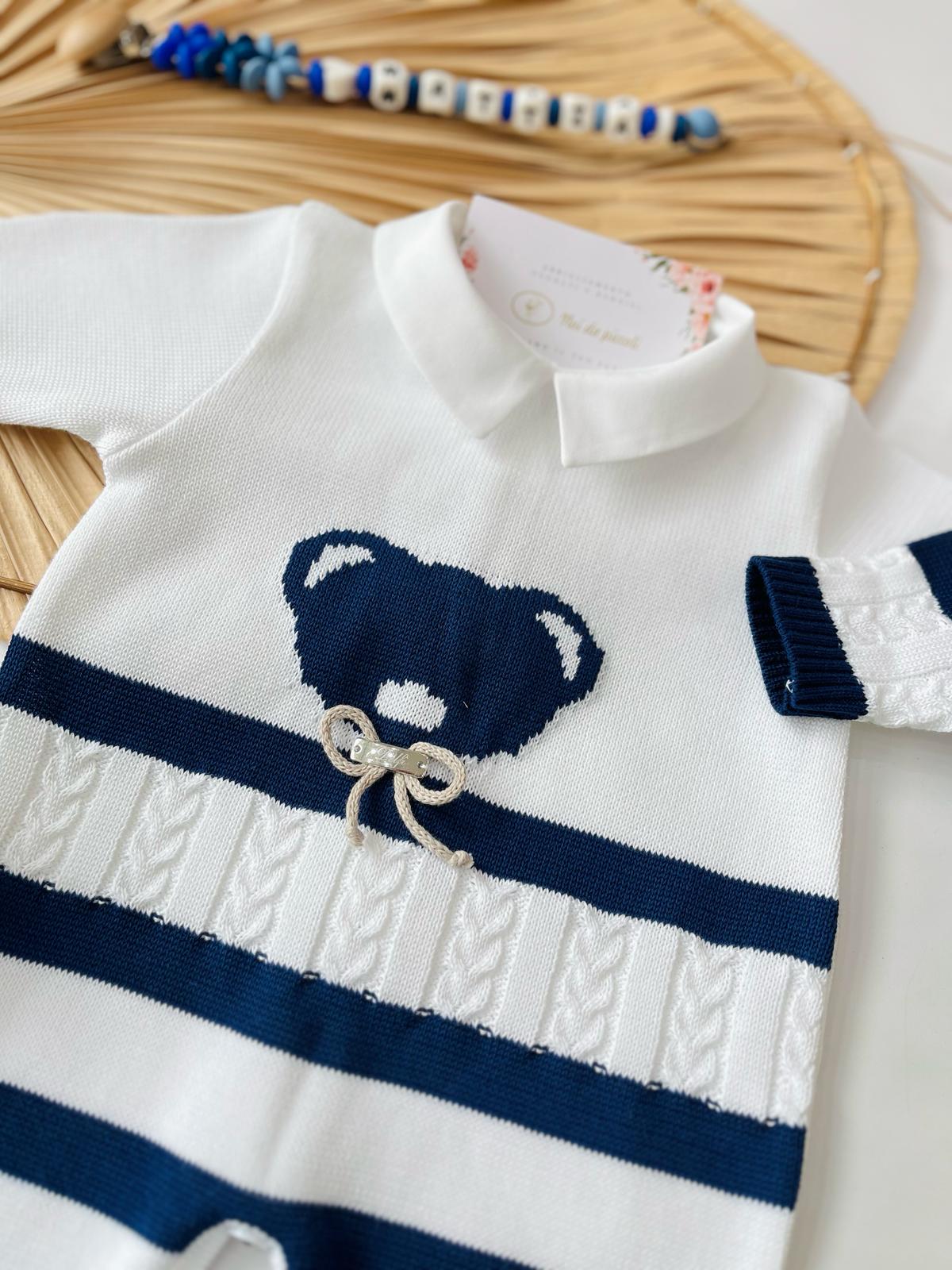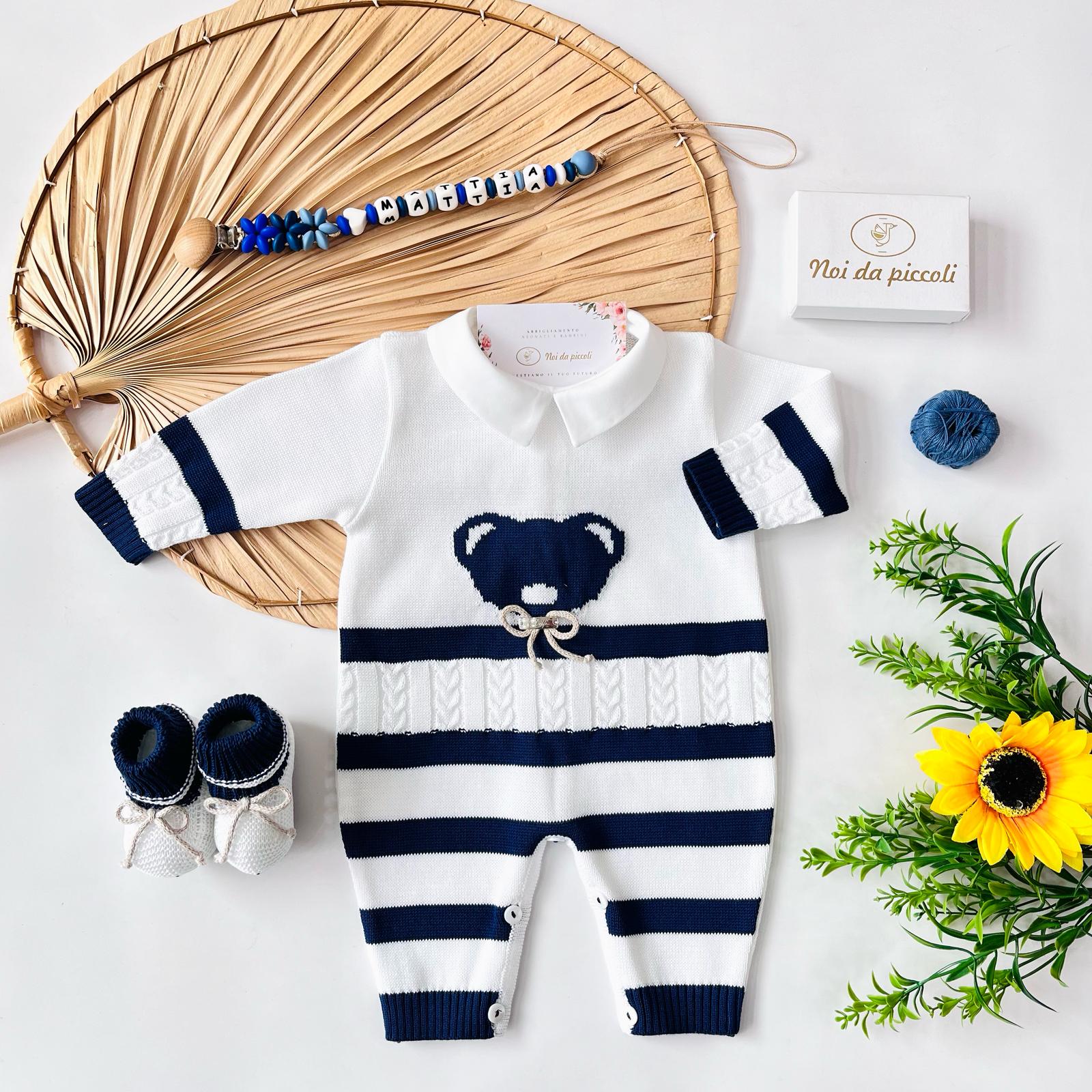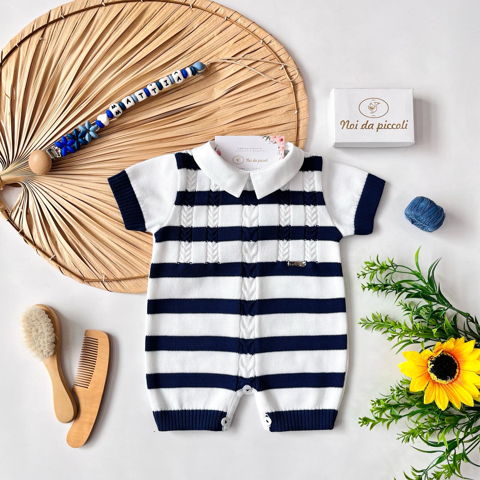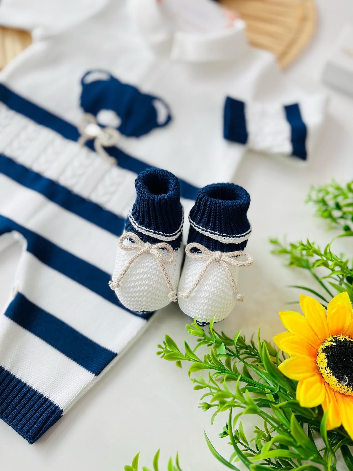 cotton romper with white and blue striped slippers with a central blue design and beige bow, combined with the white and blue slippers
