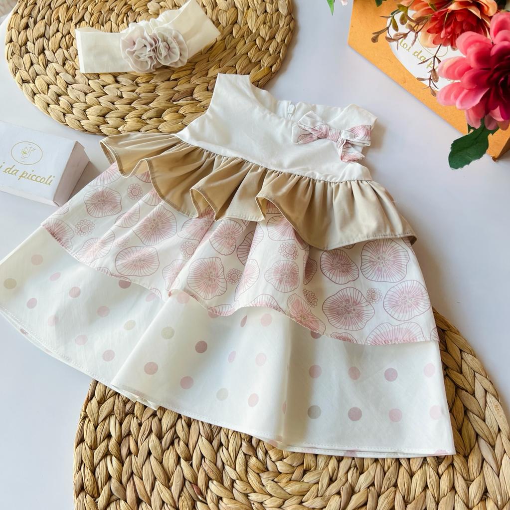 A sweet enchantment for your little one! This cotton garment stands out for its delicacy, with beige and pink tones that evoke tenderness. The skirt, rich in lace and ruffles, plays with pretty polka dot and flower patterns, while the bow on the chest adds a touch of elegance. Complete the look with the matching headband, perfect for any special occasion. Every detail is designed to make every moment unforgettable.
