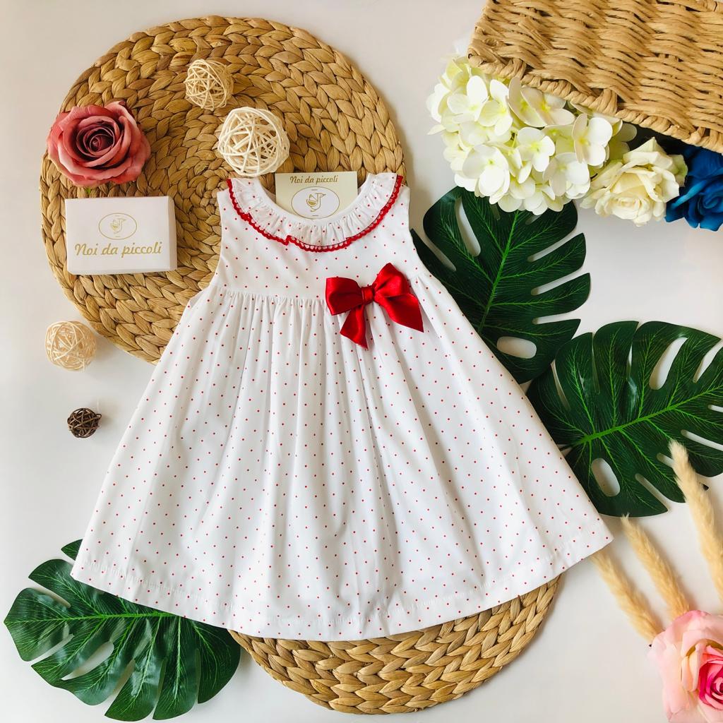An enchanting dress that captures the sweet and playful spirit of the little ones. Made of soft cotton, this dress features a delicate red polka dot pattern on a white background, evoking freshness and joy. A refined red bow on the front adds a touch of charm, while the collar with embroidered details gives an elegant and romantic touch. Perfect for any special occasion, this piece will make your love even more adorable.