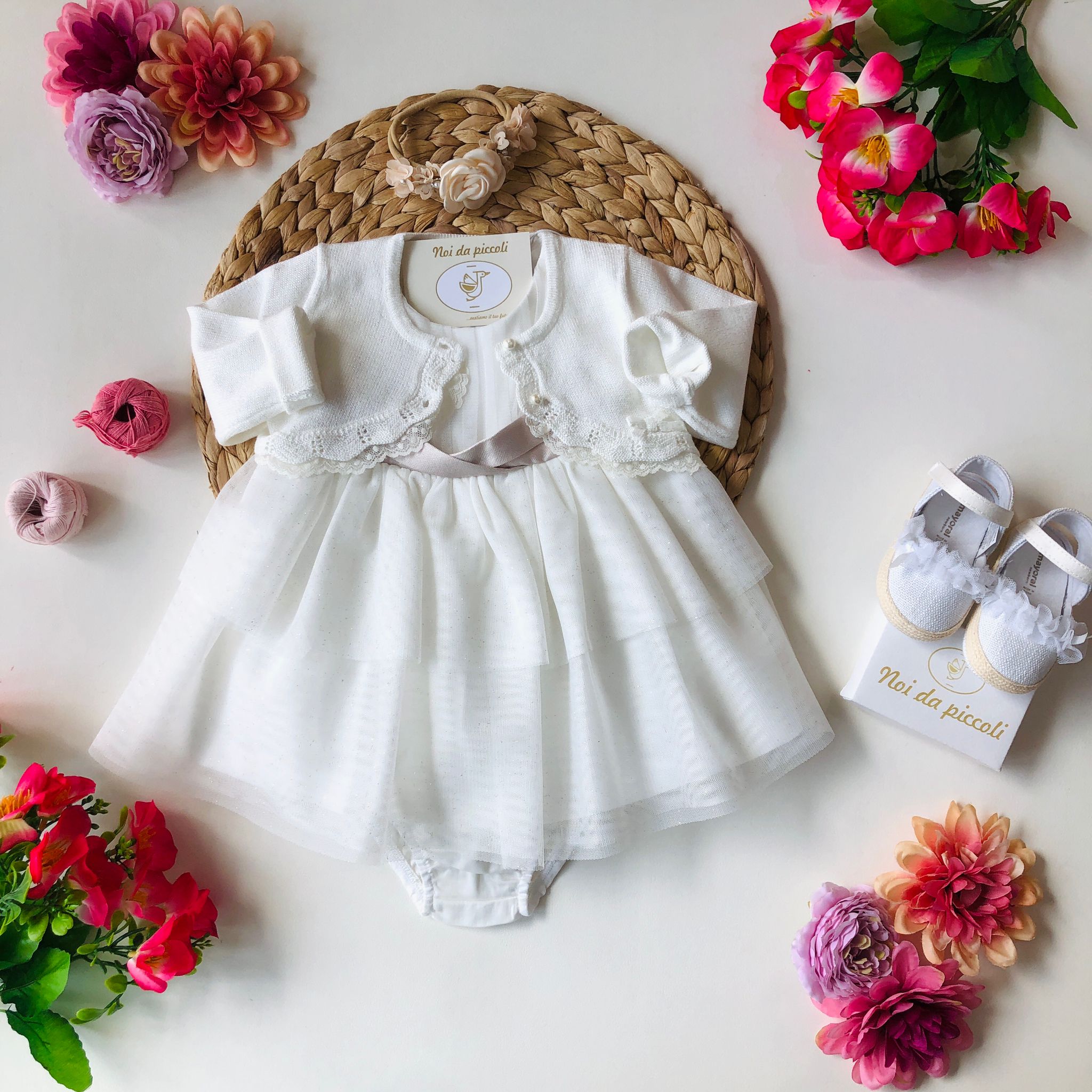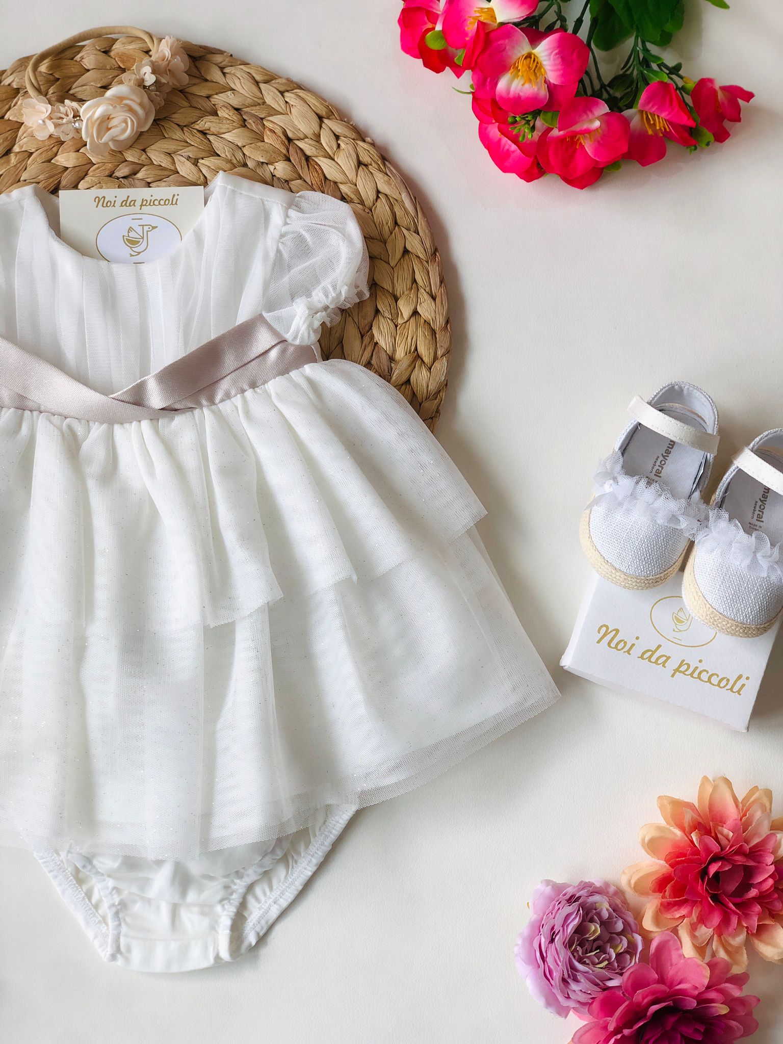 A dream of delicacy and style envelops little ones in this enchanting dress. Made in a sweet white, the lightweight fabric is embellished with a refined striped texture, perfect for any occasion. The beige band adds a touch of elegance, while the soft puffed sleeves add a romantic and playful air. The delicate flounces make the movement light and harmonious, allowing your little girl to feel like a real princess. An irresistible garment for unforgettable moments.