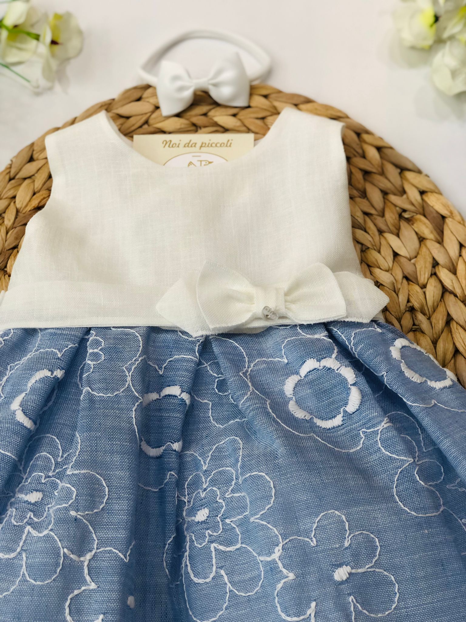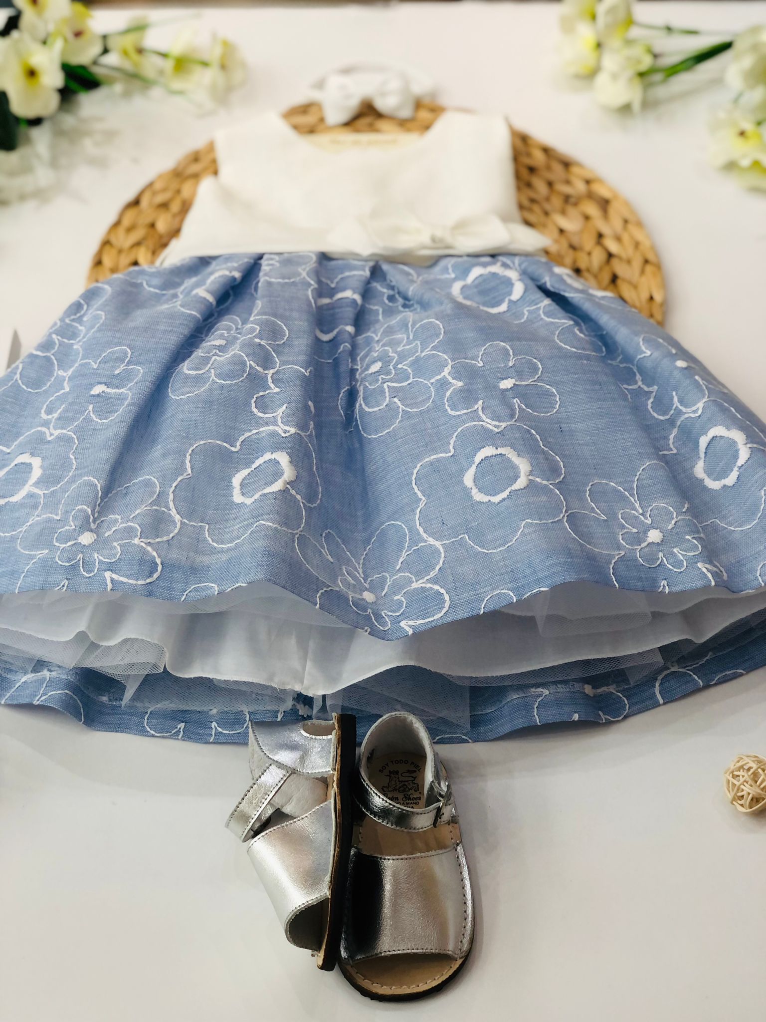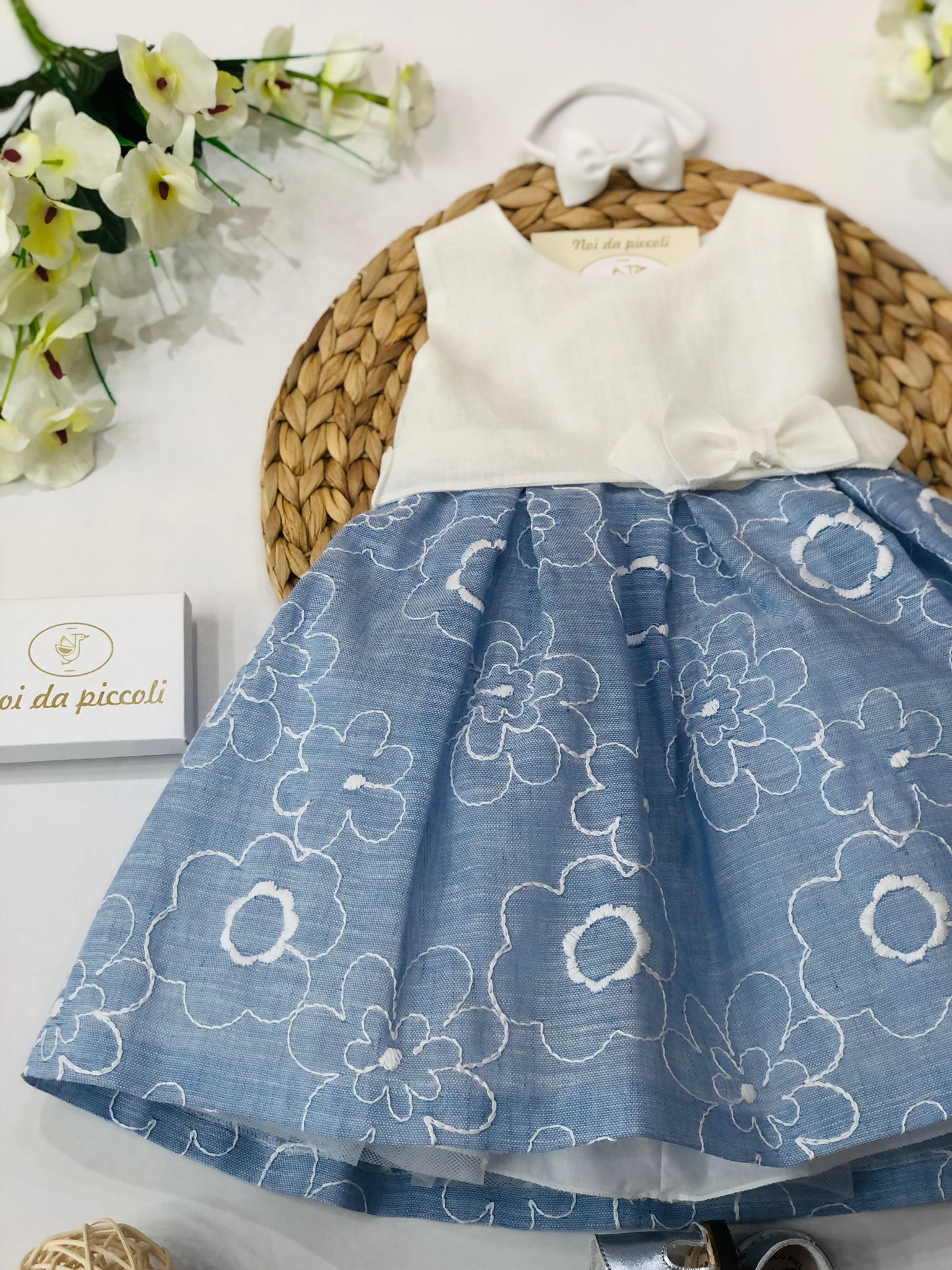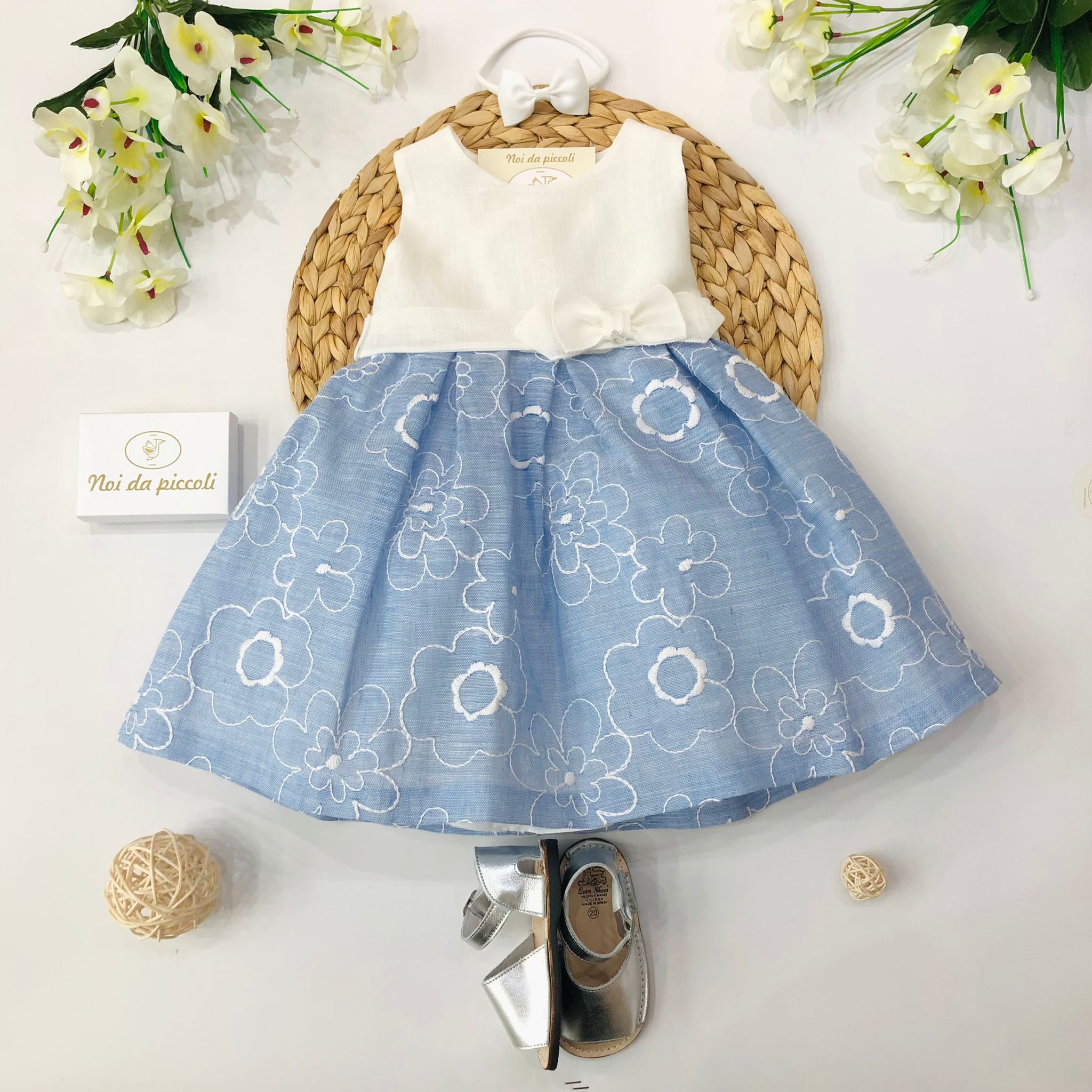 Un sogno di eleganza per le più piccole, questo abitino incanta con il suo delicato design floreale. La parte superiore in un morbido tessuto chiaro si abbina dolcemente alla gonna in blu, impreziosita da ricami floreali che danzano sulla superficie. Un adorabile fiocco, posizionato con cura, aggiunge un tocco di raffinatezza a questo capo unico. Perfetto per ogni occasione speciale, farà brillare gli occhi di chiunque, rendendo ogni momento indimenticabile.