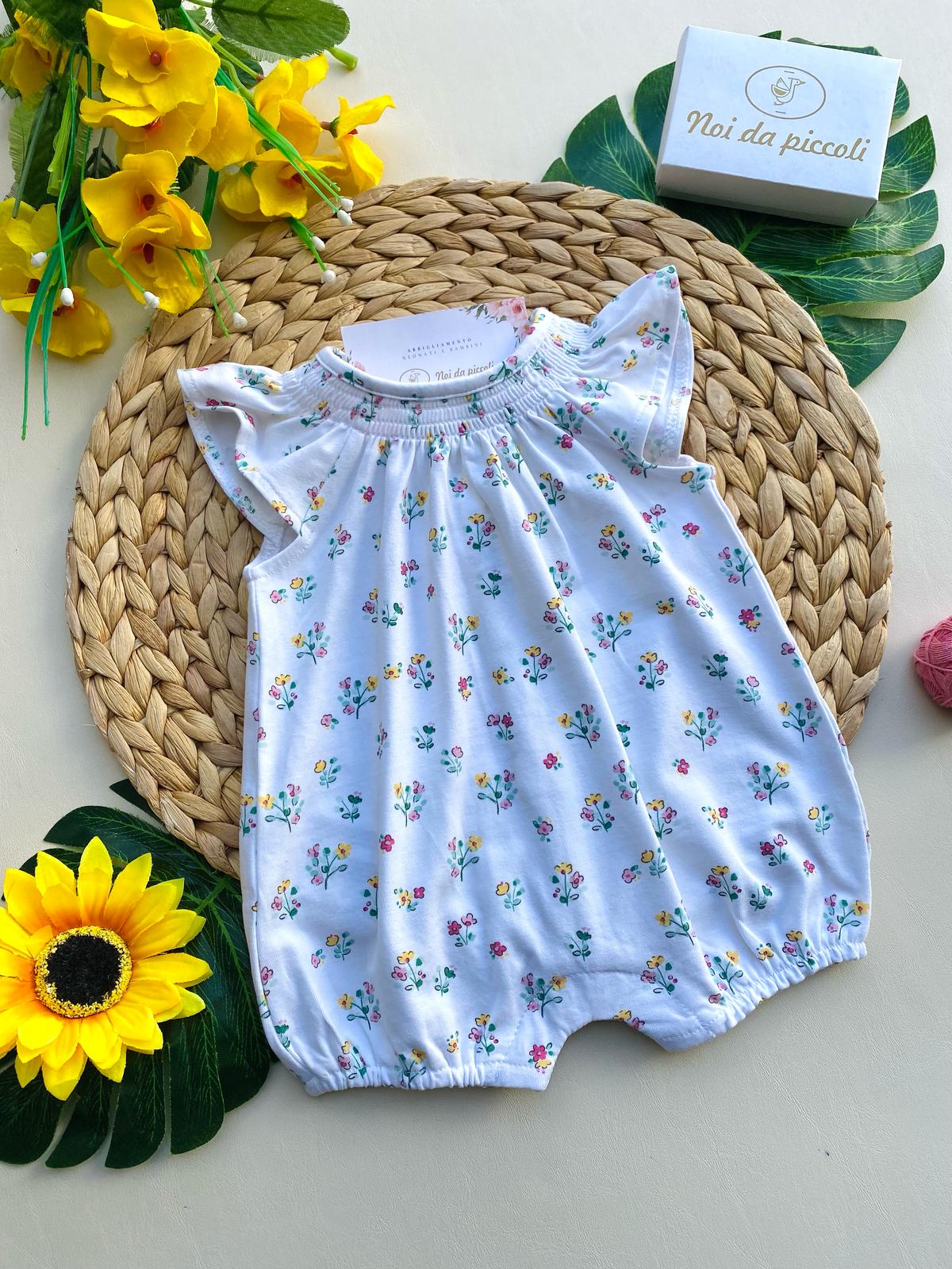 Un delicato pagliaccetto che avvolge la tua piccola in un abbraccio di tenerezza. La sua base bianca è adornata da una graziosa fantasia floreale che danza in tonalità di verde, rendendolo perfetto per ogni occasione. Le cuciture morbide e il colletto arricciato donano un tocco di eleganza, mentre le maniche a farfalla aggiungono un accento di dolcezza e leggerezza. Questo capo è l'essenza della freschezza e della vivacità, ideale per far brillare il sorriso della tua bimba.