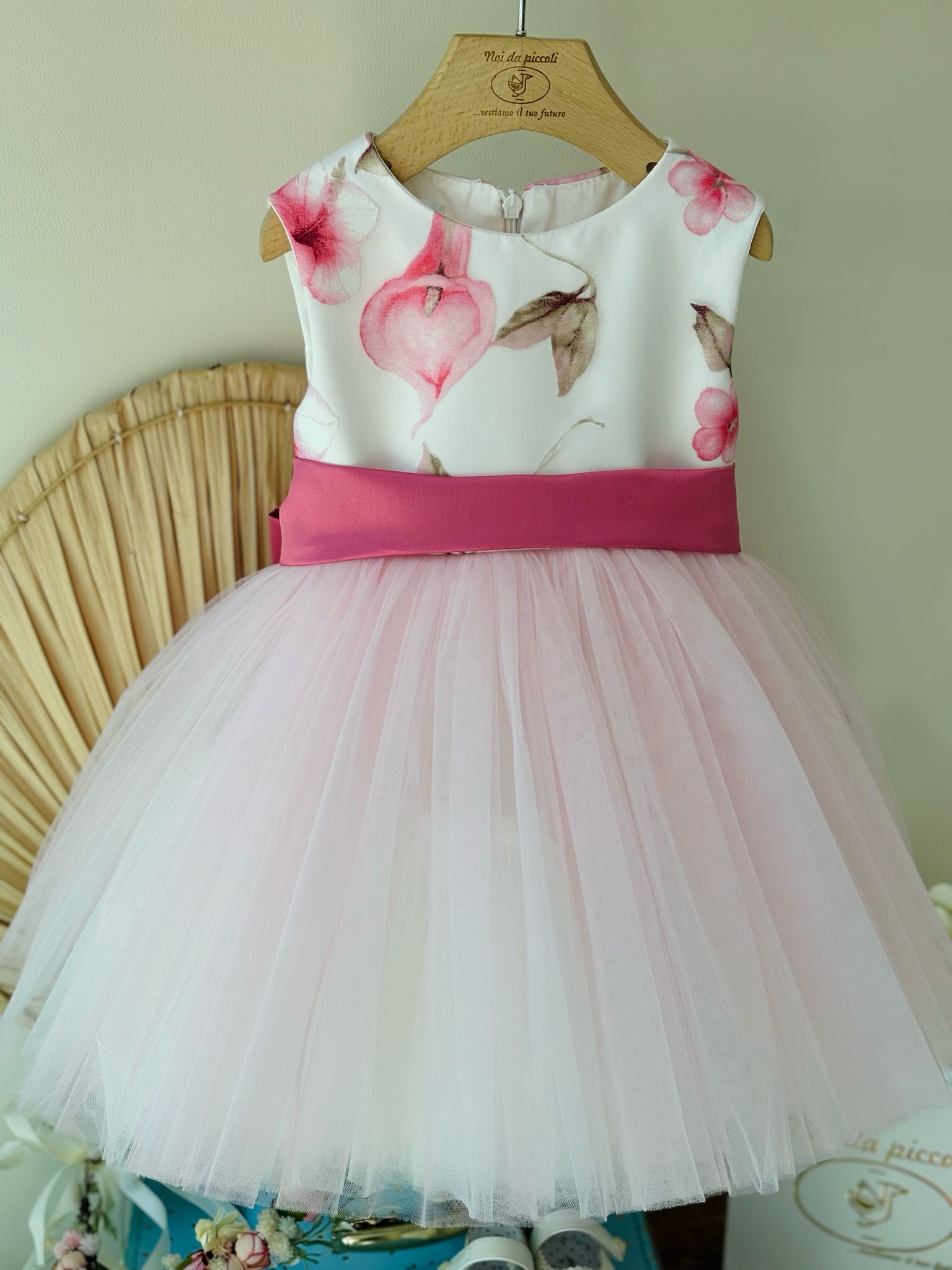 Un incantevole vestito cerimoniale che cattura l'essenza della dolcezza infantile. La parte superiore, adornata con una delicata fantasia floreale, si fonde armoniosamente con un ampio tulle rosa, creando un effetto affascinante e leggero. La fascia centrale, che avvolge la vita, si chiude con un elegante fiocco fucsia sulla schiena, aggiungendo un tocco di raffinatezza. Questo abito è perfetto per celebrare momenti speciali, regalando alla tua piccola un aspetto da vera principessa.
