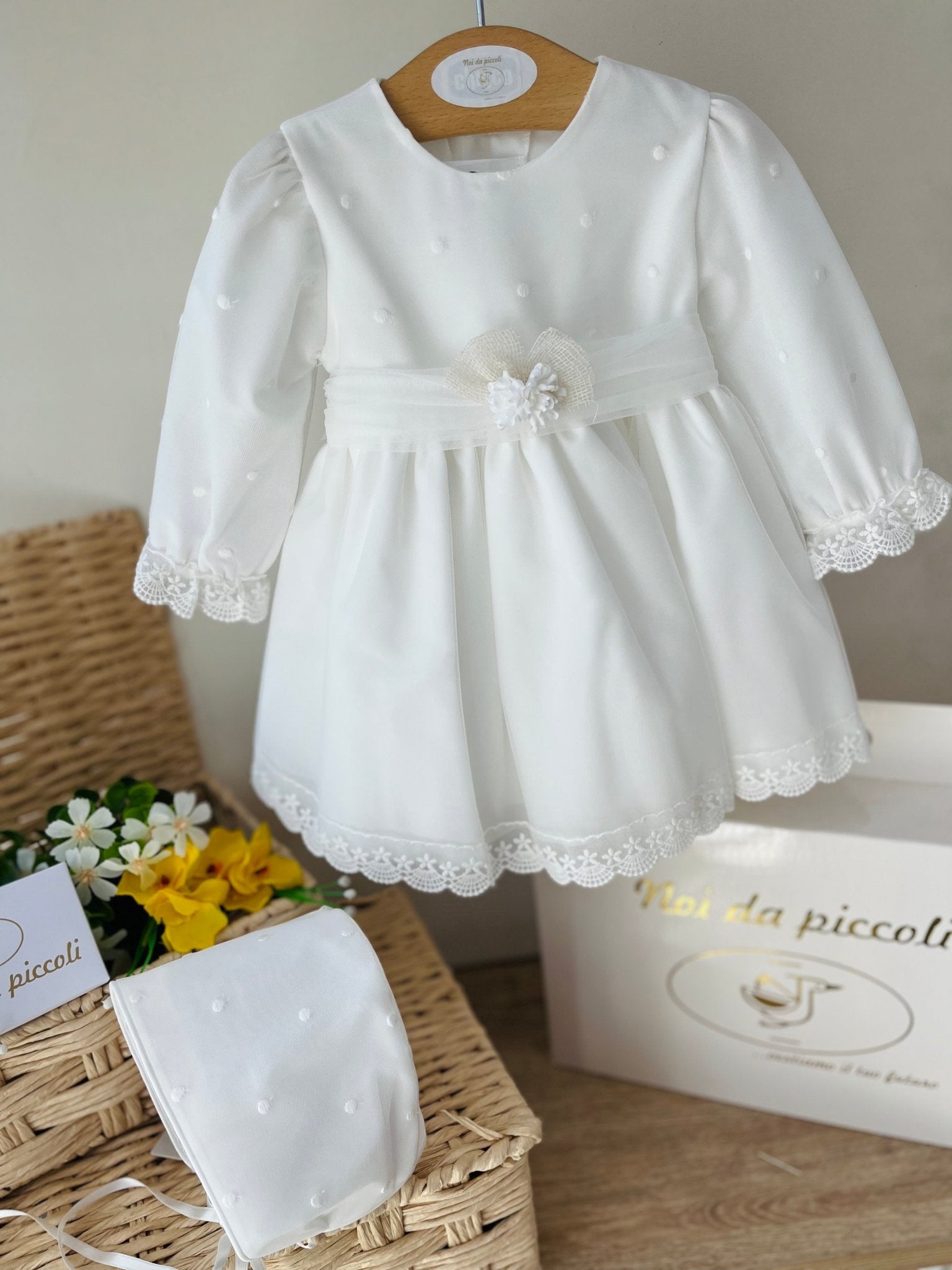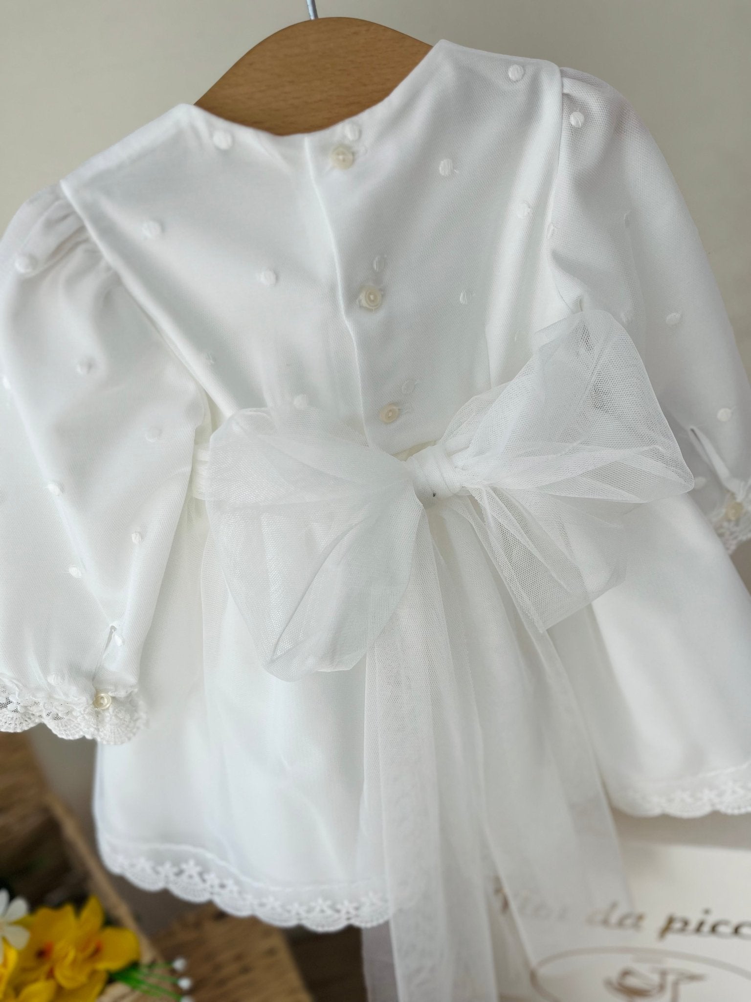 Un incanto di delicatezza per la tua piccola. Questo abitino dal design elegante è realizzato in un tessuto morbido e avvolgente, con un raffinato pizzo che arricchisce le maniche e l'orlo, donando un tocco di classe. Un dolce fiocco sul punto vita assicura un allure romantico, mentre i piccoli dettagli in rilievo aggiungono un fascino unico. Perfetto per ogni occasione speciale, questo capo farà brillare ogni sorriso e renderà indimenticabile ogni momento.
