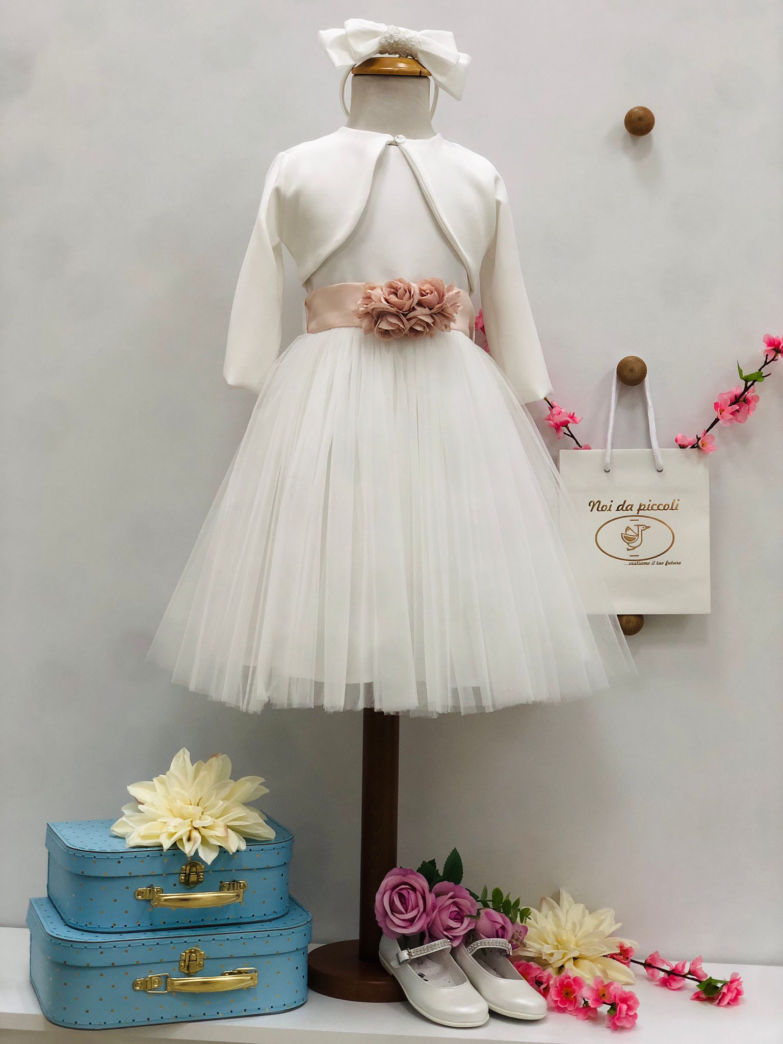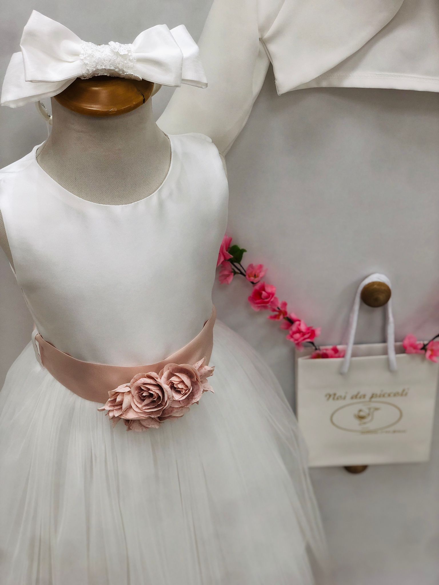 Rendi ogni occasione indimenticabile con questo delizioso abitino bianco, perfetto per la tua piccola. La morbida gonna in tulle dona un tocco di leggerezza, mentre la fascia rosa antico, adornata da un raffinato fiore, aggiunge un’eleganza senza tempo. Un elegante fiocco sul retro completa il look, trasformando la tua bambina in una vera principessa. Realizzato con cura in Italia, questo vestito è l'ideale per celebrare momenti speciali con stile e dolcezza.