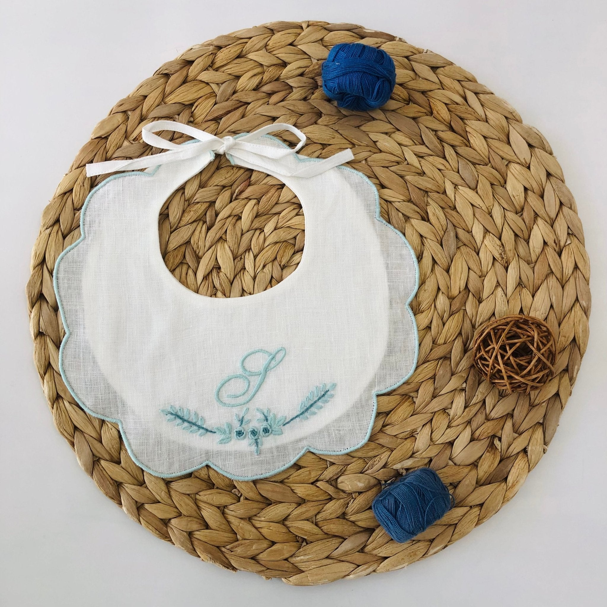 BAVETTO RICAMATO A MANO LETTERA "S" CIELO LINO
