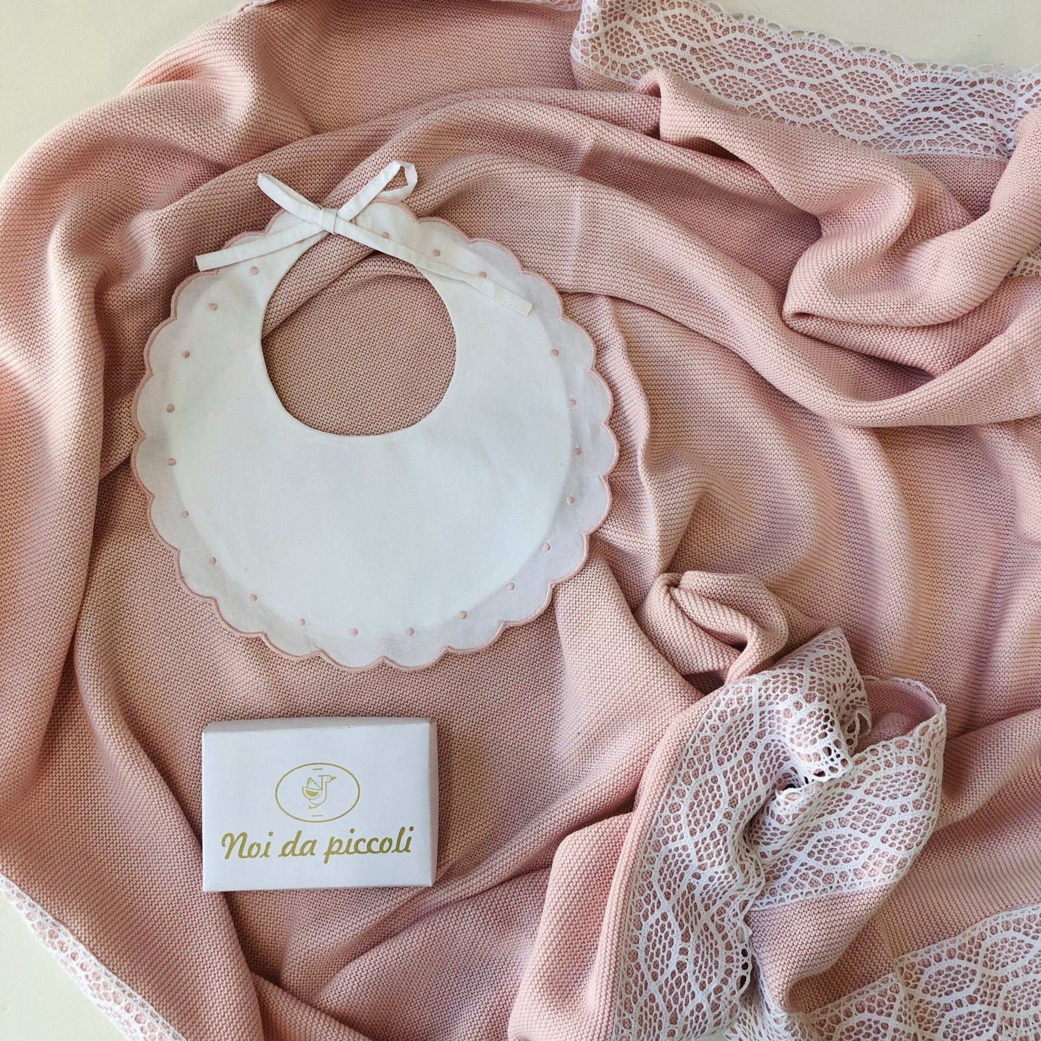 Un delicato abbraccio di dolcezza per i più piccoli, questa bavetta incanta con il suo design elegante, arricchito da una finitura in pizzo e adorabili puntini rosa. Realizzata con tessuti morbidi, offre una carezza sulla pelle sensibile, mentre la forma scallop e il fiocco aggiungono un tocco romantico e raffinato. Ogni pasto diventa un momento speciale, protetto da macchie indesiderate. Un accessorio adorabile che combina funzionalità e stile, perfetto per rendere ogni giorno unico.