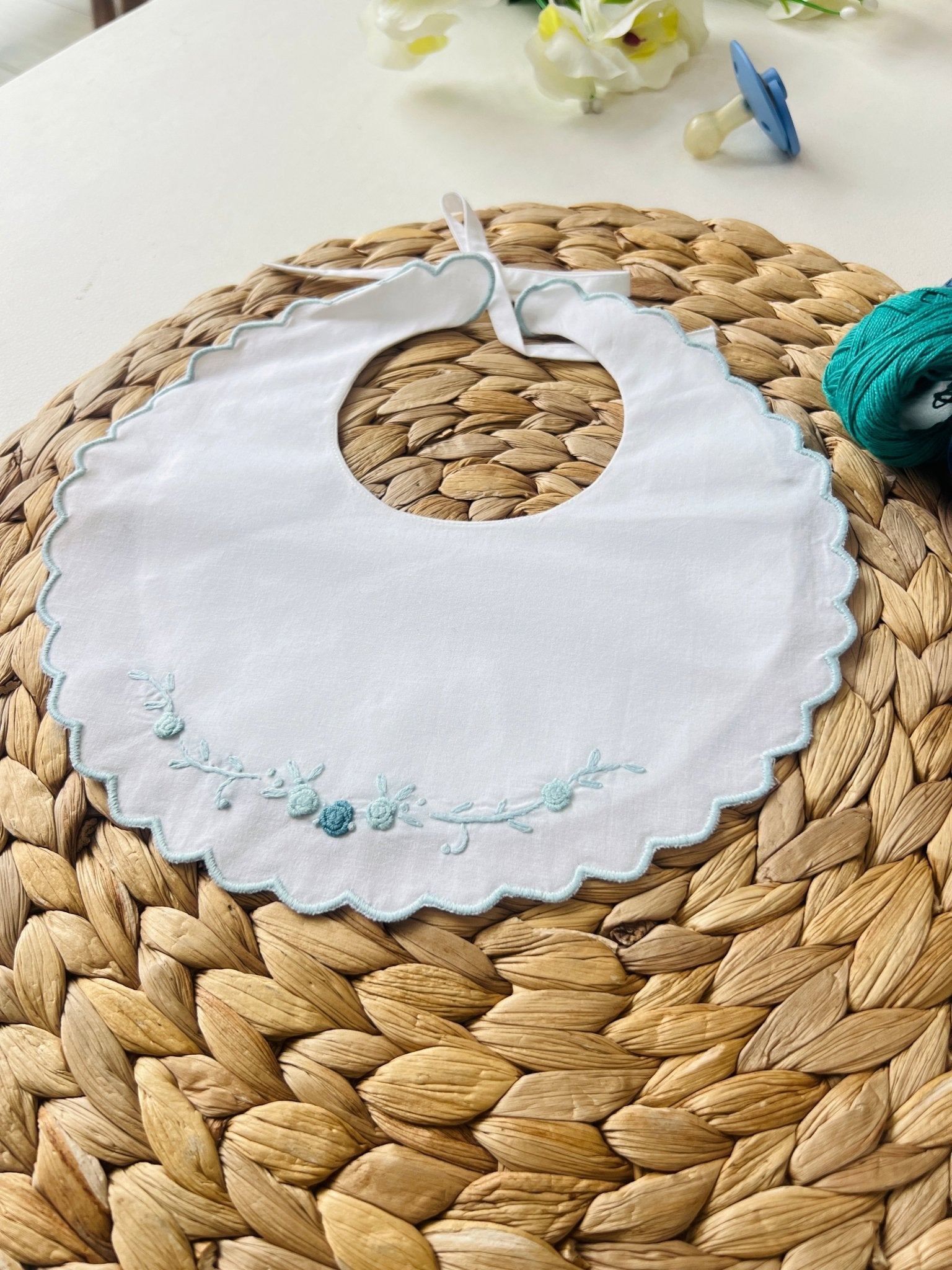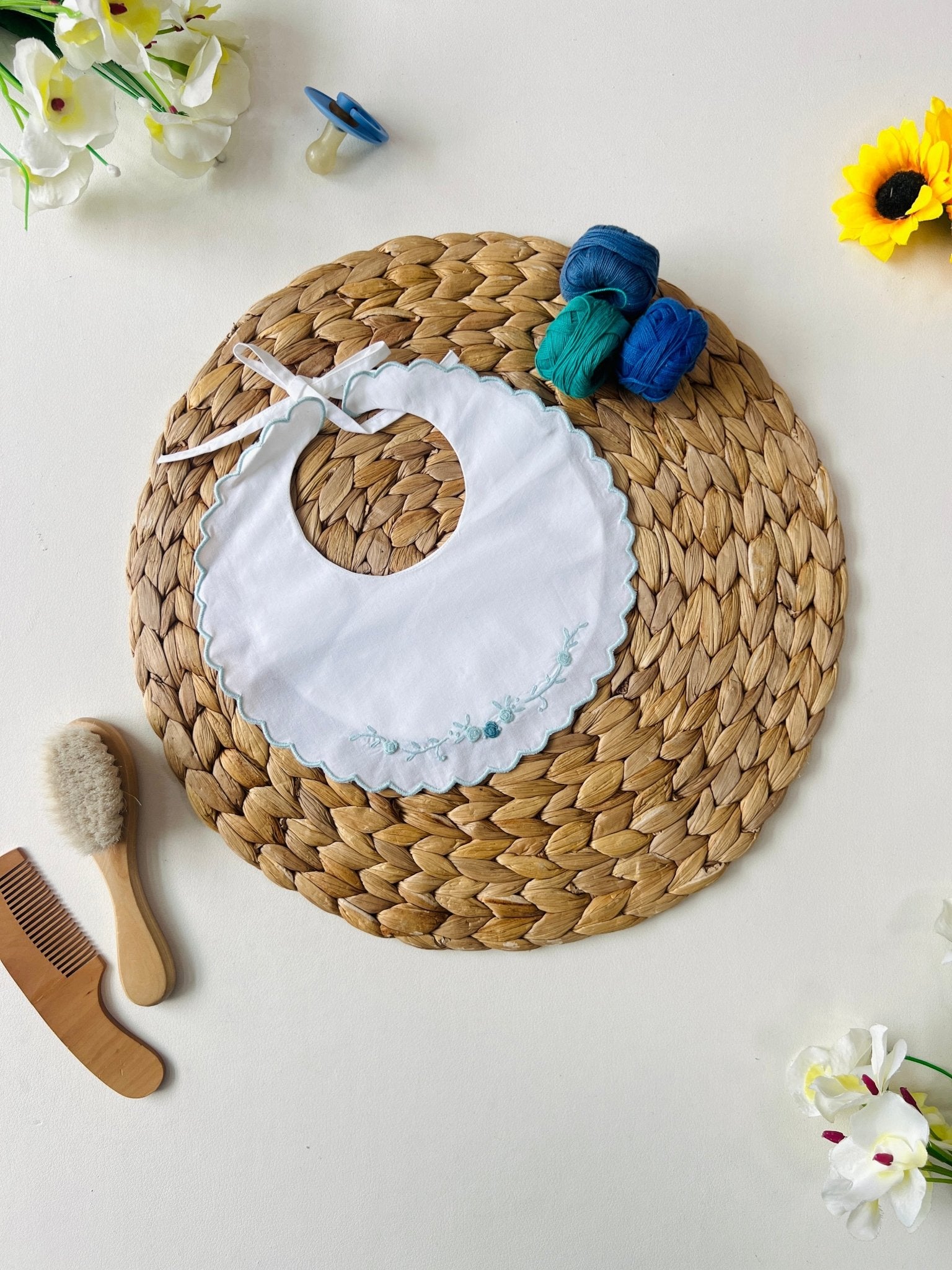 Delicata e affascinante, questa bavetta incarna la dolcezza dei momenti di pappa. Realizzata in morbido tessuto, presenta un delicato ricamo di fiori cielo, che aggiunge un tocco di eleganza a ogni pasto. Il bordo ondulato, raffinato e curato nei dettagli, conferisce un aspetto romantico, mentre la chiusura regolabile assicura una vestibilità perfetta e comoda. Un accessorio ideale per rendere ogni momento speciale, perfetto anche come pensiero per le neomamme.