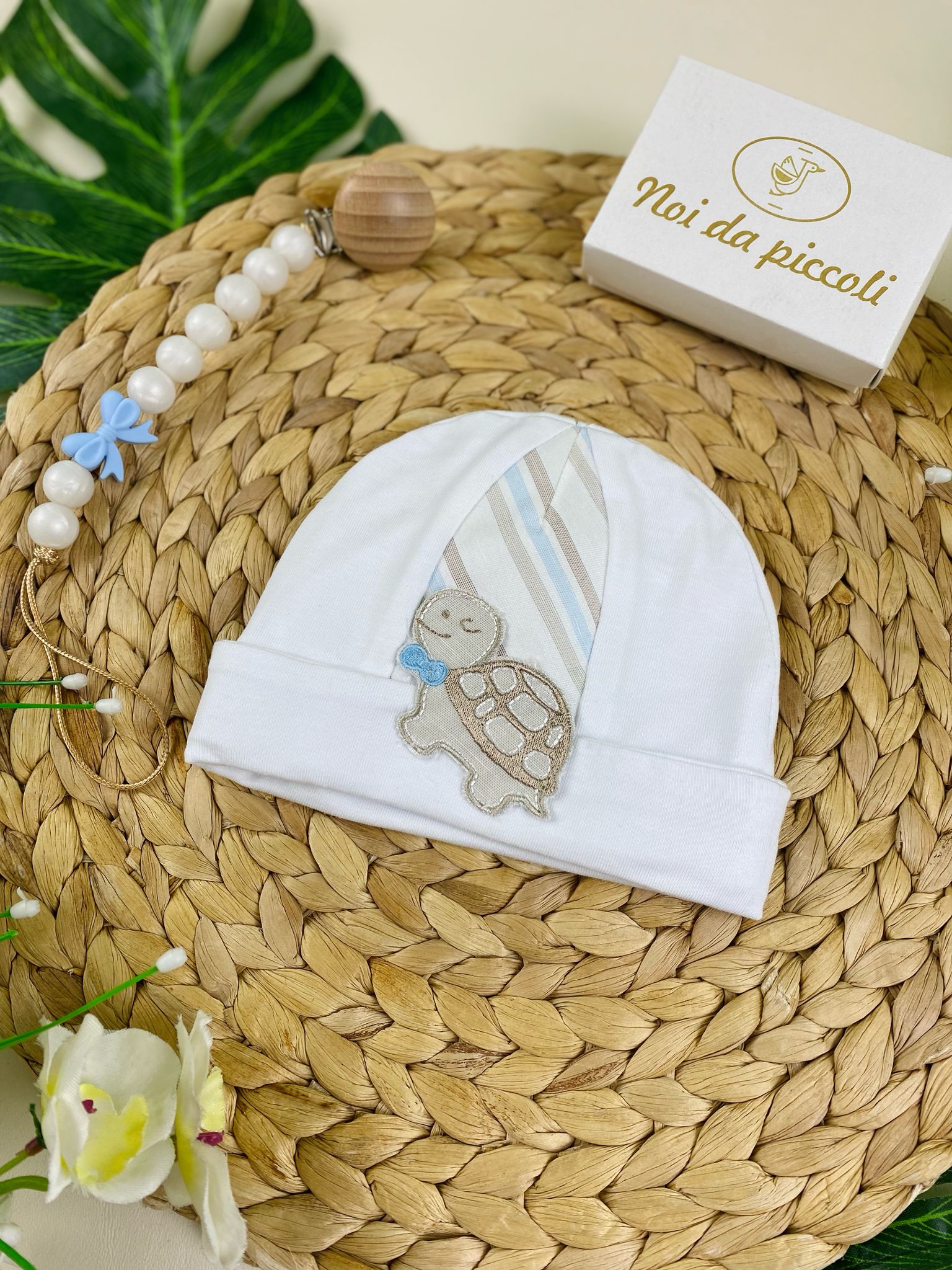cappellino in colorazione bianco con righine e tartaruga in colorazione beige e cielo