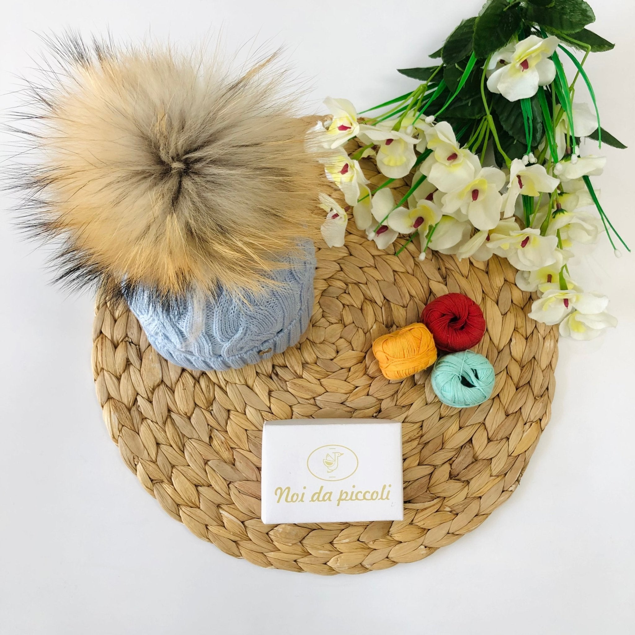 CAPPELLINO INTRECCIO LANA E VOLPE CIELO PON POM NATURALE