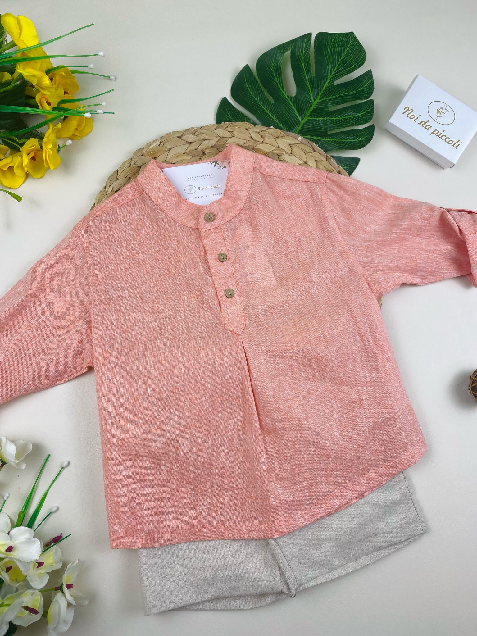 Un incanto di dolcezza avvolge questo adorabile completo per il tuo piccolo. La camicina in tono salmone, dal delicato tessuto leggero, è impreziosita da un elegante colletto e finiture curate, mentre i pantaloncini beige in lino e cotone offrono comfort e freschezza. Perfetto per ogni occasione, questo look si distingue per la sua semplicità e raffinatezza, rendendo il tuo bambino ancora più speciale. Non lasciare che questo pezzo unico sfugga, arricchisci il suo guardaroba con un tocco di stile!