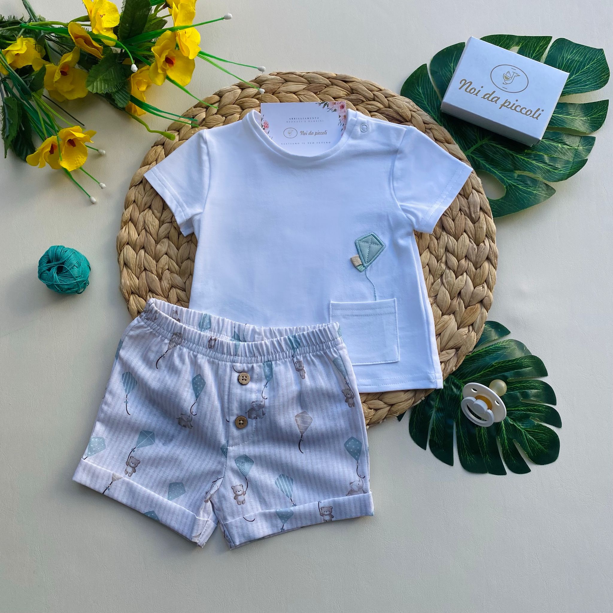 completo 2 pz con pantaloncino rigato beige e bianco e orsetti con mongolfiere e magliettina bianca con disegnino laterale verde