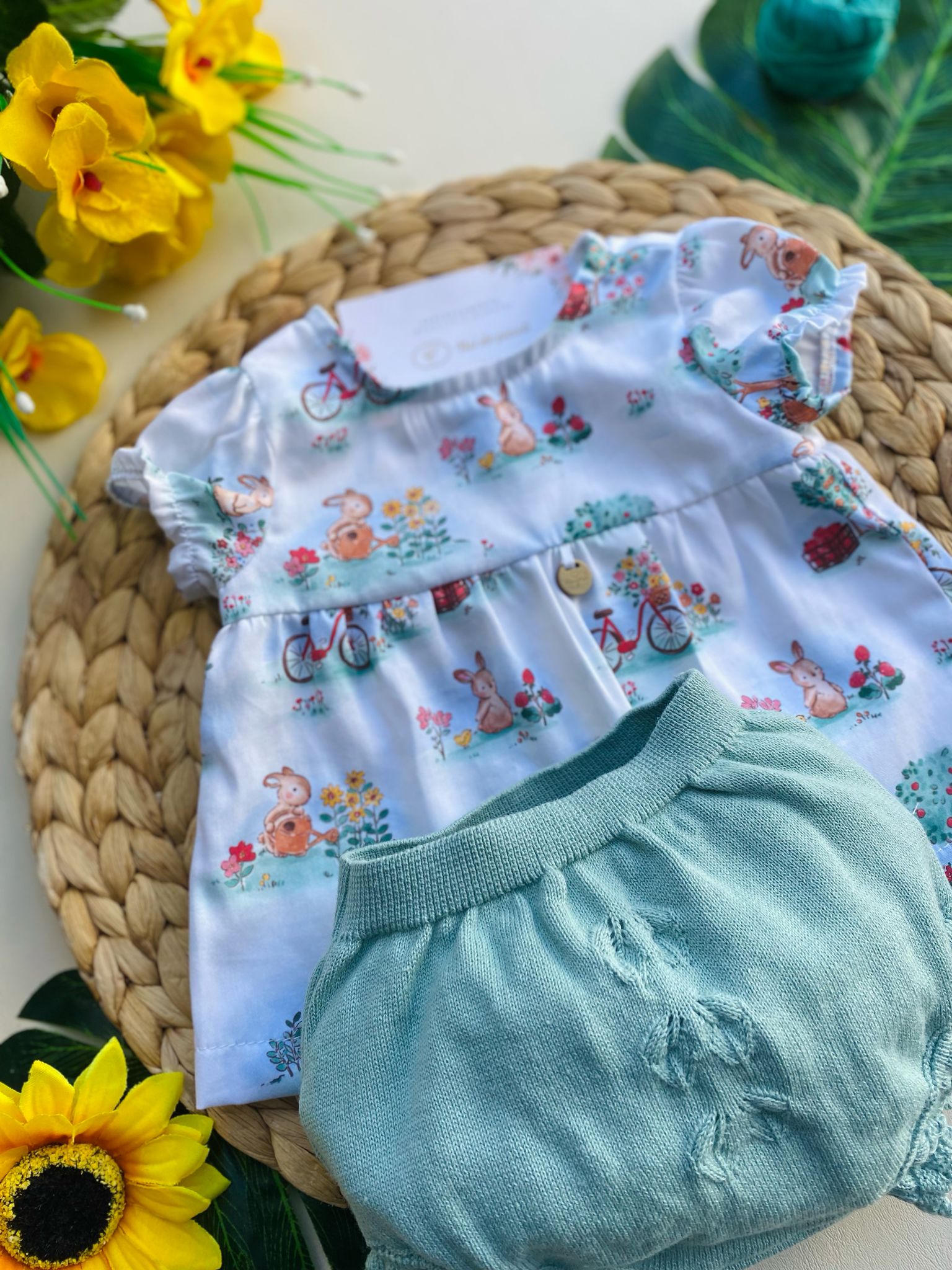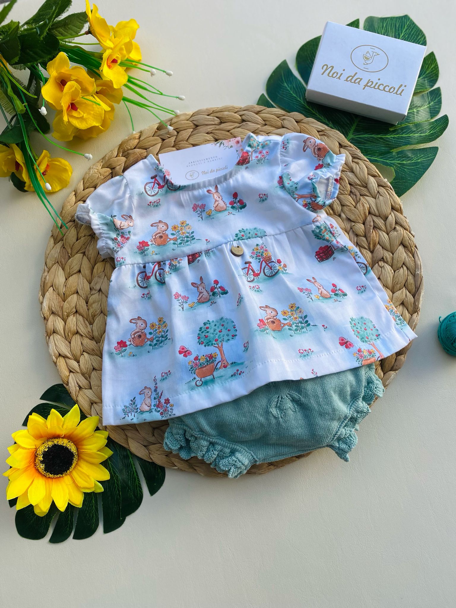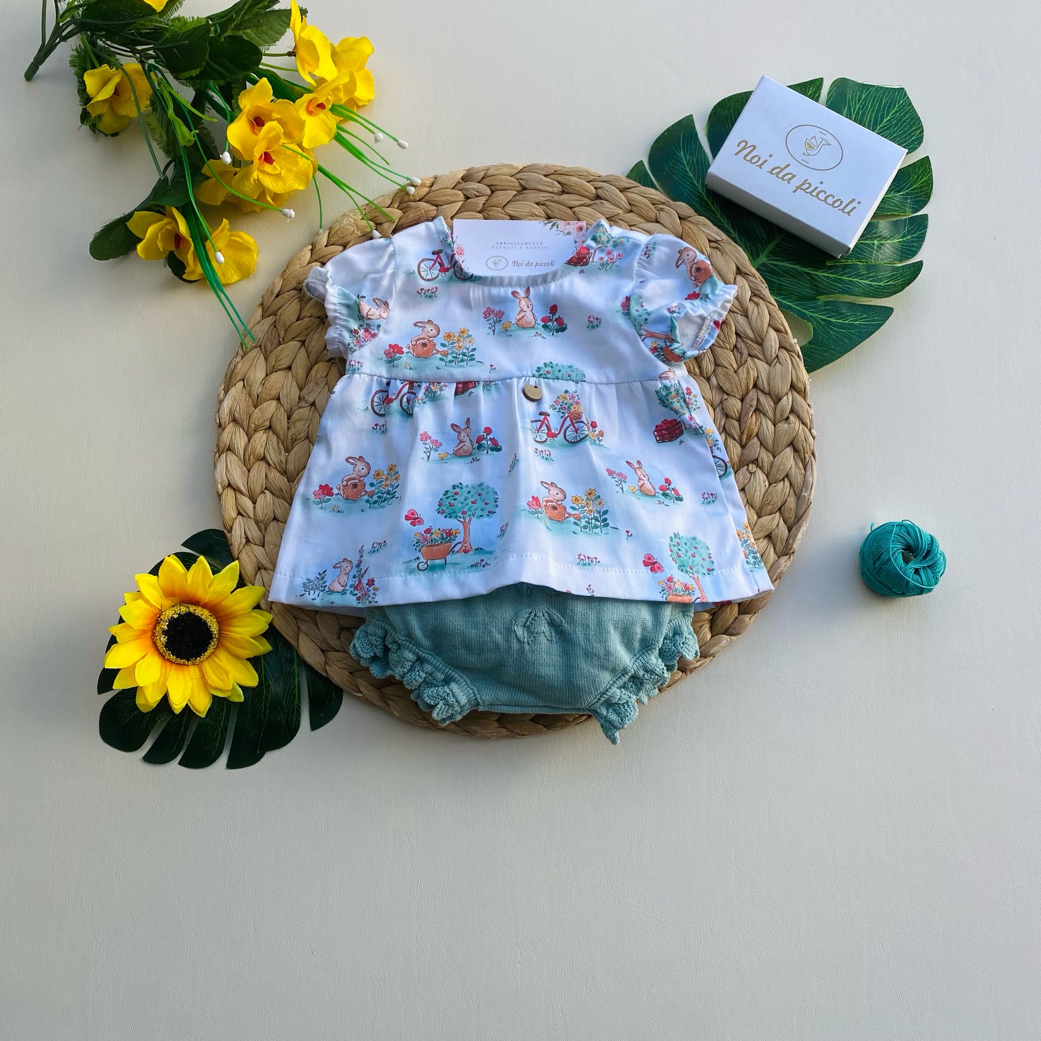 completo 2 pz con MAGLIA bianca a fantasia e culottina verde