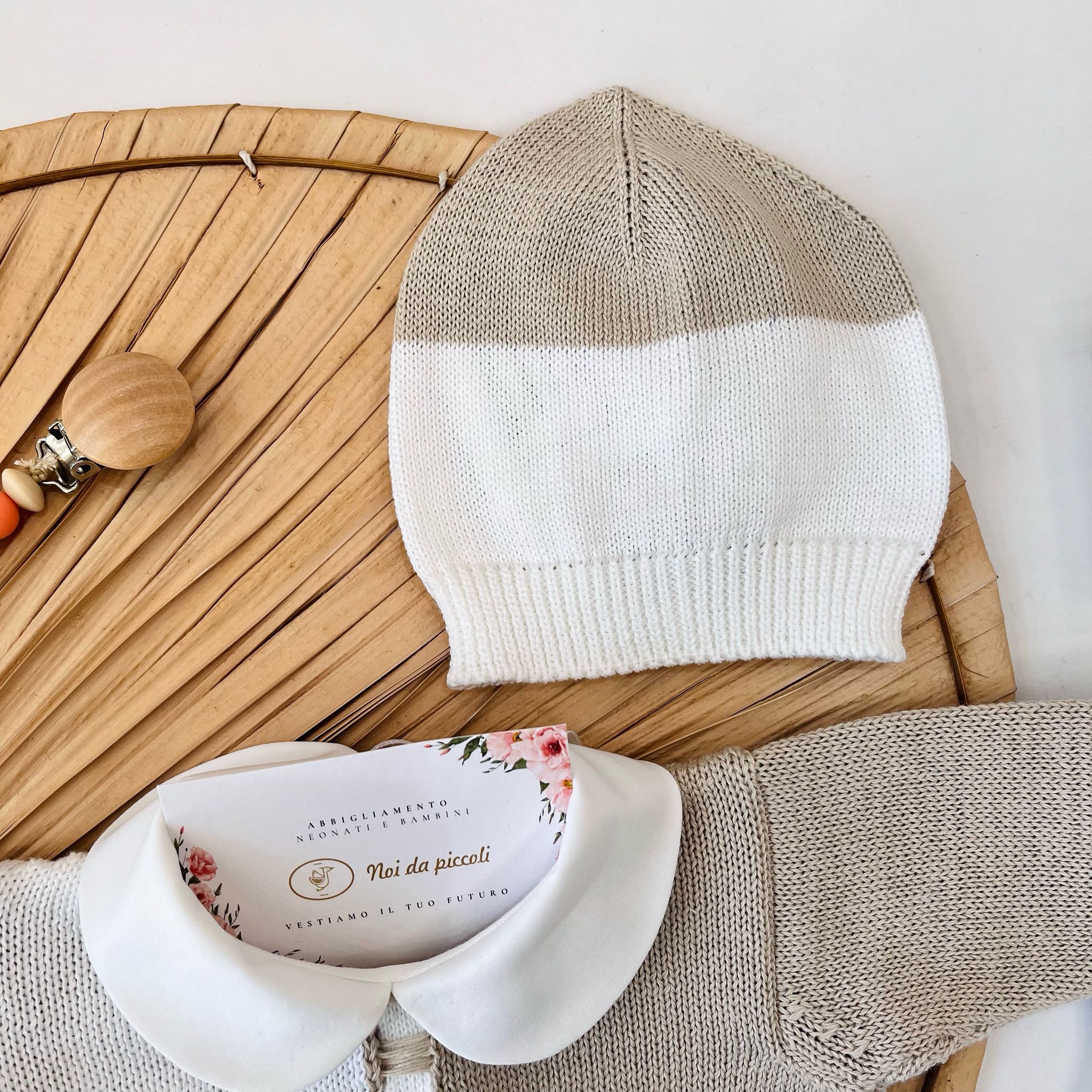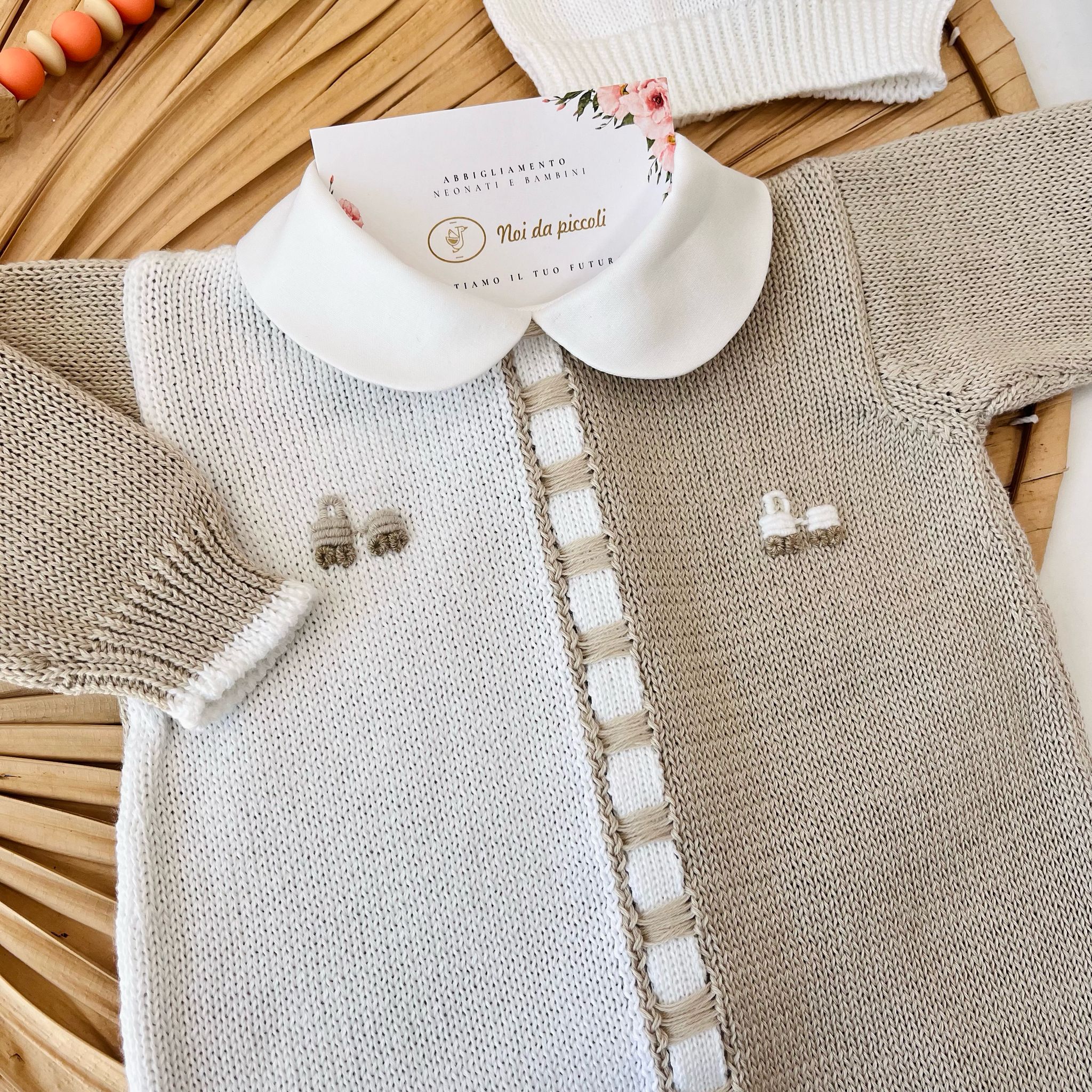 Avvolgi il tuo piccolo in un abbraccio di dolcezza con questo delicato coordinato realizzato a mano. La morbida texture in 100% filo di cotone si sposa armoniosamente con i toni caldi del sabbia e del bianco, creando un’atmosfera incantata. I raffinati dettagli ricamati a mano aggiungono un tocco di eleganza, mentre il colletto e i delicati fiocchi offrono un aspetto romantico e affettuoso. Ogni particolare è pensato con amore, per rendere unici i momenti speciali.