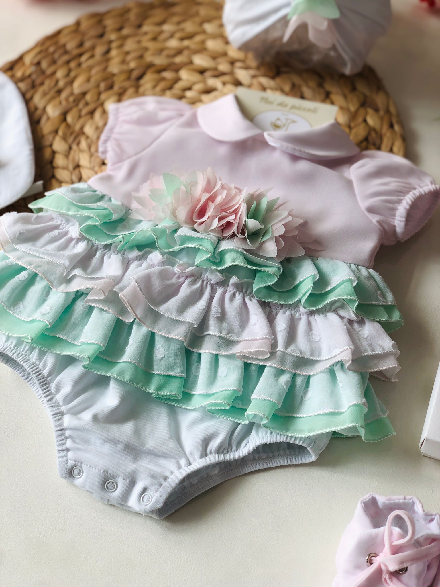 Delicata e incantevole, questa creazione trasforma ogni momento in un ricordo prezioso. Il pagliaccetto in morbido cotone è adornato da strati di pizzi eleganti in tonalità di rosa e verde, con una graziosa applicazione floreale che cattura lo sguardo. Le cuciture curate e il colletto dolce aggiungono un tocco di raffinatezza, rendendolo perfetto per occasioni speciali. Completa il look con la morbida babbuccia coordinata, per un outfit che conquista i cuori.