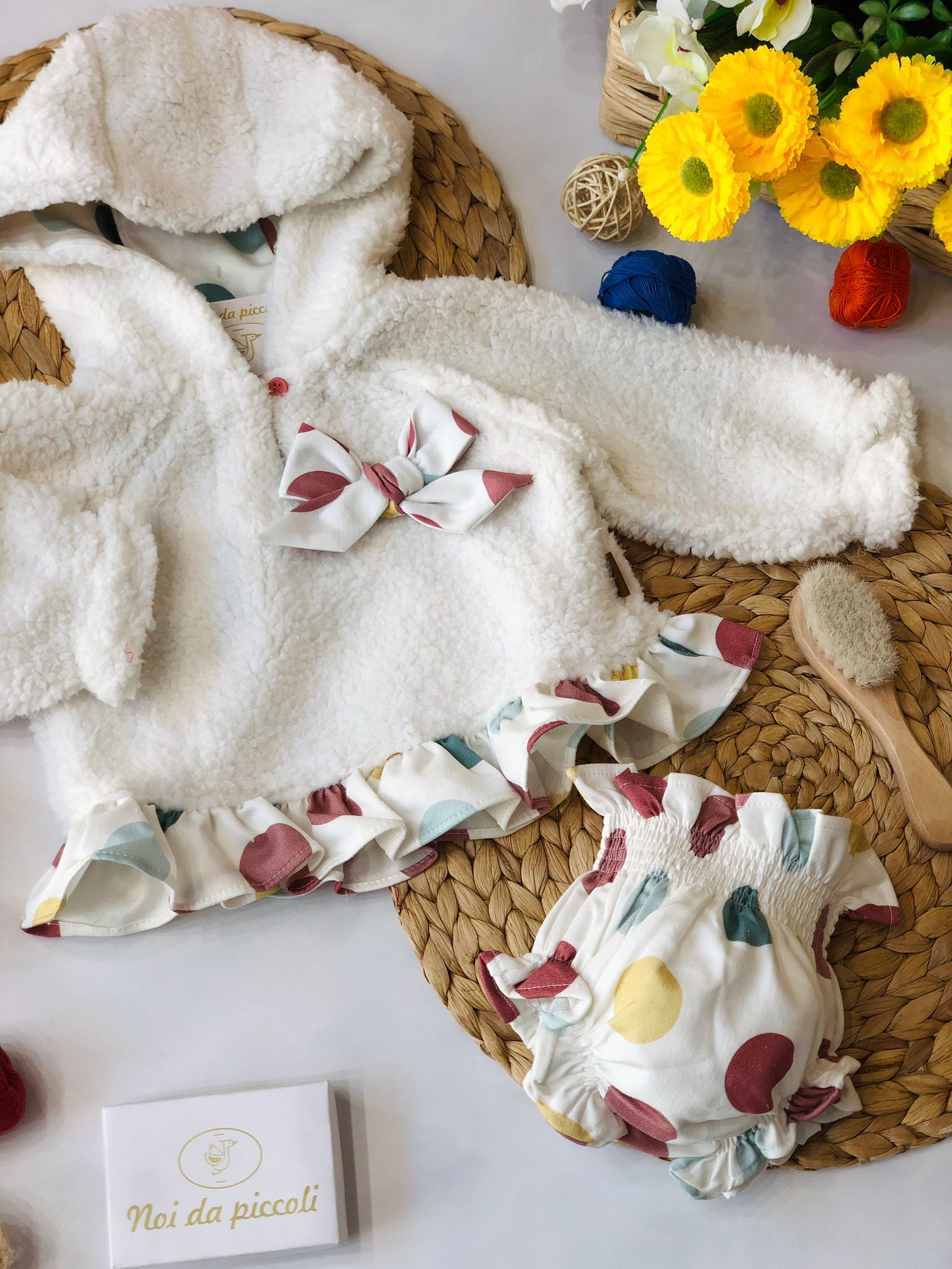 Felpina bianca con pois colorati sul fiocco e sull'orlo delle felpina per una piccola signorina molto particolare e sfiziosa il look lo completa la sua culottina con i pois colorati colori belli e teneri per il tuo amore!